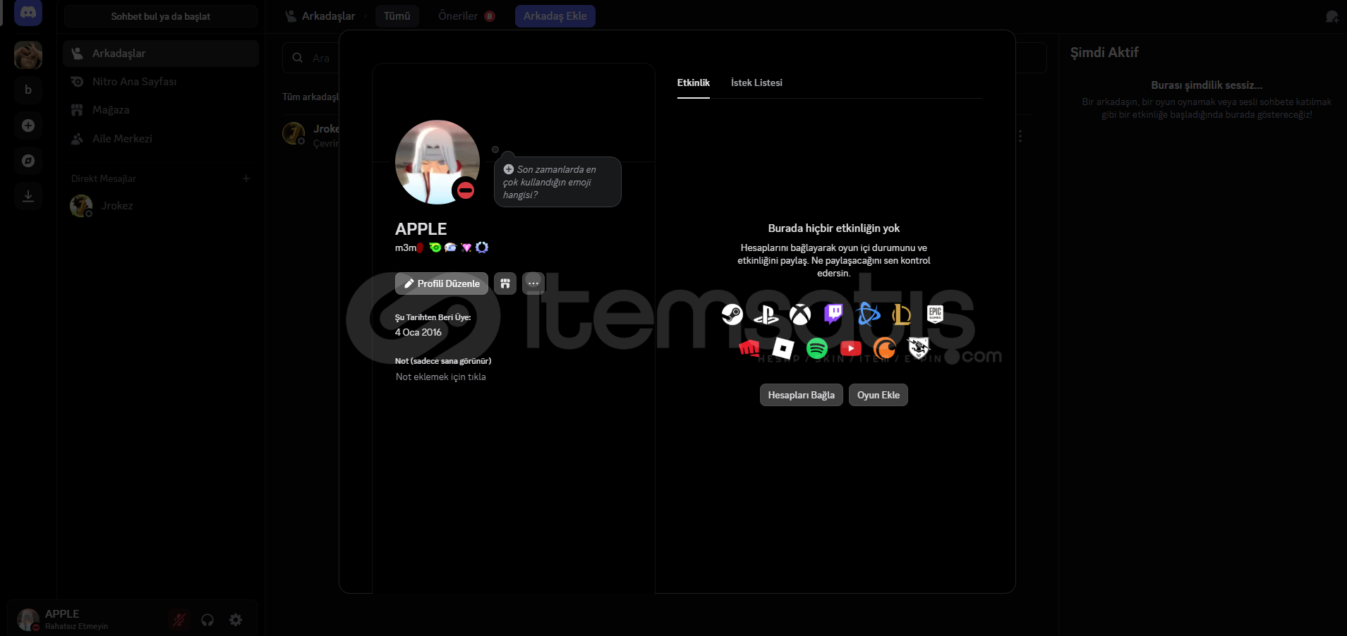 HESAP ÖZELLİKLERİ:Hesapta Discord Kurallarına aykırı bir durum söz konusu bile olmamıştır.Hesap Türkiye Kurulumdur Önceki Sahibi Türktür Maillerdende AnlayabilirsinizHesap 4 Haneli Nicke SahiptirHesapta Vefat Eden Oğuzhan Dalgakıran (@jrokez) arkadaş eklidir ve dm i vardır.Hesap kurulum tarihi 4 Ocak 2016Kurucu Mail Olduğu Anlaşılması İçin 8.10.2...