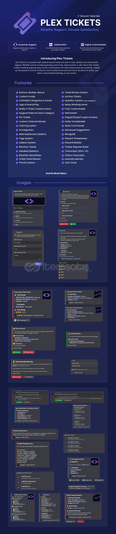 PLEX TICKETS - Gelişmiş Discord Ticket SistemiPlex Tickets, kullanıcı destek süreçlerini hızlı, düzenli ve verimli hale getirmek isteyen topluluklar için geliştirilmiş,gelişmiş bir self-hosted (kendi sunucunda barındırılan) Discord ticket botudur.Tamamen özelleştirilebilir yapısı sayesinde, destek sisteminizi markanıza ve ihtiyaçlarınıza uygun şekilde yapıl...