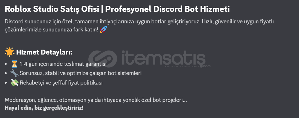 Discord sunucunuz için özel, tamamen ihtiyaçlarınıza uygun botlar geliştiriyoruz. Hızlı, güvenilir ve uygun fiyatlı çözümlerimizle sunucunuza fark katın!Moderasyon, eğlence, otomasyon ya da ihtiyaca yönelik özel bot projeleri...Hayal edin, biz gerçekleştiririz!ALTYAPI OLARAK VERİLİR BİZDEN KURULUM İSTERSENİZ VDS SİZE AİTTİR