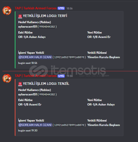 • Şeffaf Log Sistemi: Başarılı olan her işlem, Yetkili Adı, Eski/Yeni Rütbe, Hedef Kullanıcı ve işlem zamanı bilgileriyle birlikte, belirlediğiniz Log Kanalına saniyesinde düşer. Tüm denetim parmaklarınızın ucunda.