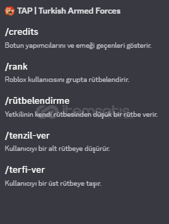 III. KOMUT LİSTESİKomut AdıİşleviHız/Güvenlik/rütbelendirmeDirekt hedef rütbeyi (Örn: OF-5 Albay) anında atar.Hiyerarşi kontrolü zorunludur./terfi-verKullanıcıyı bir üst rütbeye hızlıca taşır.Sadece yetkilinin yetkisinin altındaki rütbeler için çalışır./tenzil-verKullanıcıyı bir alt rütbeye güvenle düşürür.Yanlışlıkla yüksek rütbeye düşürme riski sıfırdır./creditsYapımcı bilgilerini şık bir Embed mesajında gösterir.Tüm kanallarda kullanıma açıktır.🔒 TELİF HAKKI VE KULLANIM ŞARTLARI