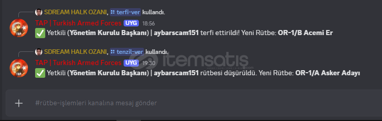 • Tek Kanalda İşlem: Tüm rütbe verme, terfi ve tenzil işlemleri, sizin belirlediğiniz tek bir Discord kanalında (/) komutlarla anında gerçekleşir.