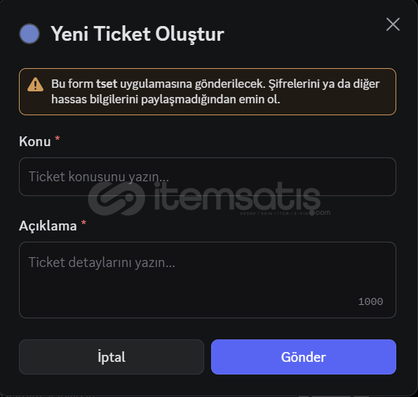 • Destek açmadan önce modal (form) ile kullanıcıdan konu ve açıklama bilgisi alma