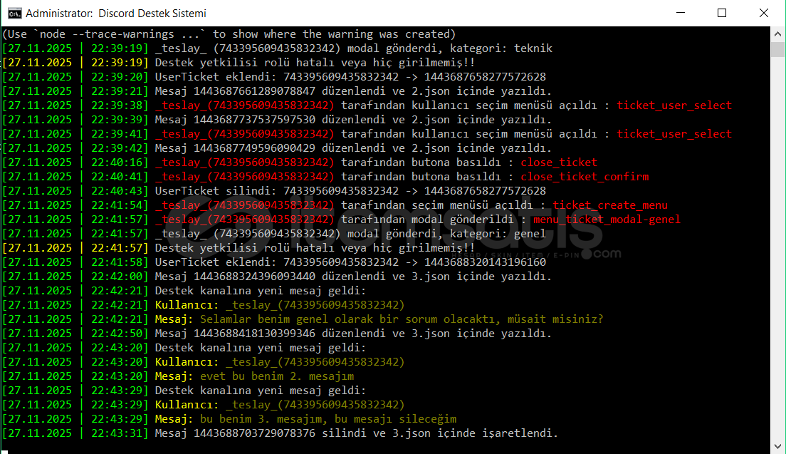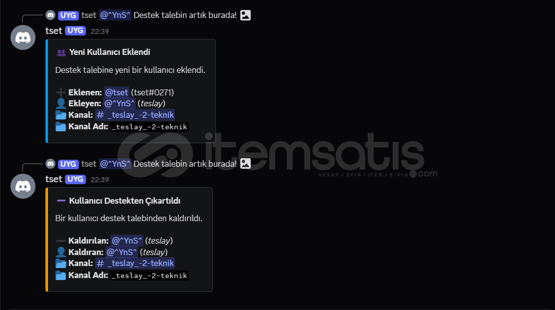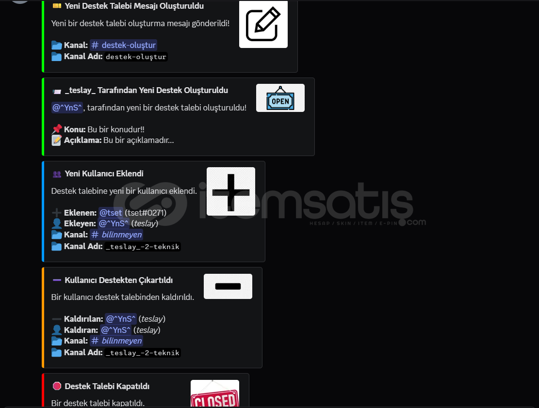 • Destek kanallarına eklenen veya çıkarılan kullanıcılar için log mesajları