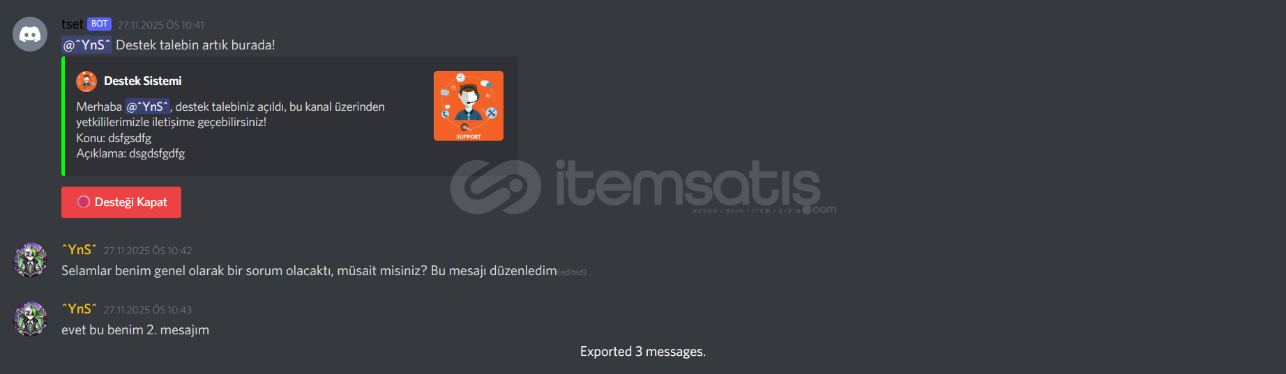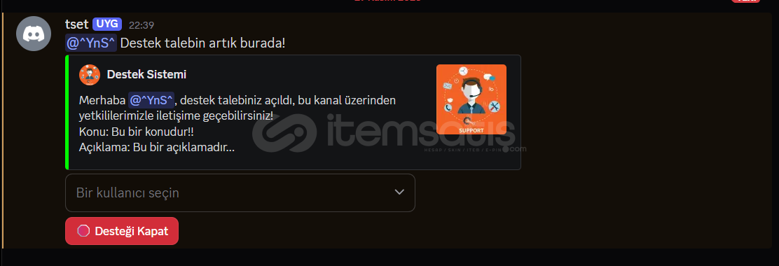 1. Destek YönetimiKullanıcı başına maksimum destek talebi limitiDestek kanallarının isimlerini ve kategorilerini özelleştirmeDestek açma seçenekleri: Buton veya MenüDestek açmadan önce modal (form) ile kullanıcıdan konu ve açıklama bilgisi alma2. Loglama ve KayıtTüm hareketler loglanabilir: destek oluşturma, kullanıcı ekleme/çıkarma, destek kapatmaLog kanallar...