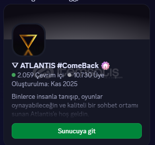 discord.gg/theatlantis url si satılıktır gelişmiş güzel bacup ile verilecektir ve şuan 243 kullanımın...