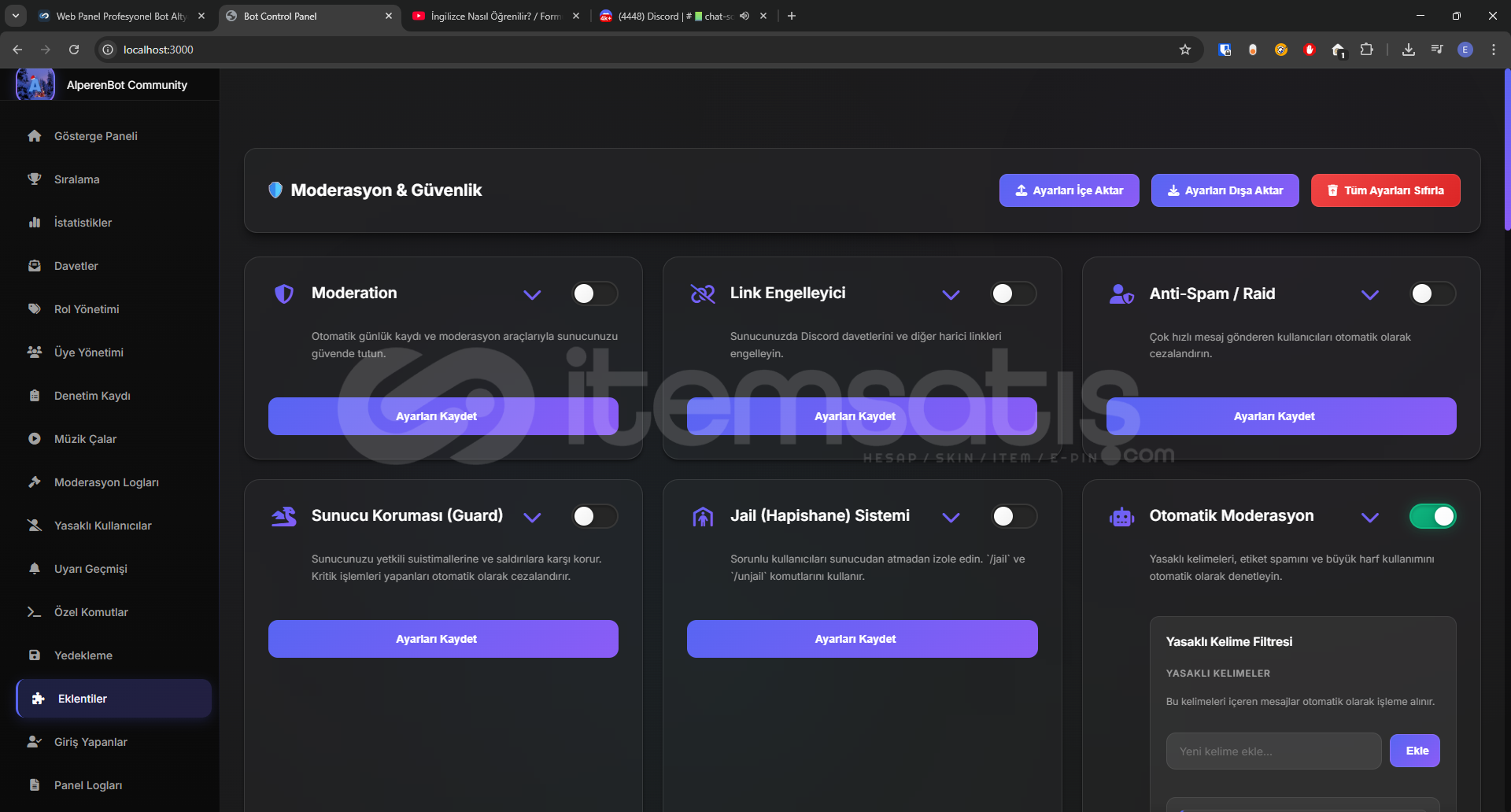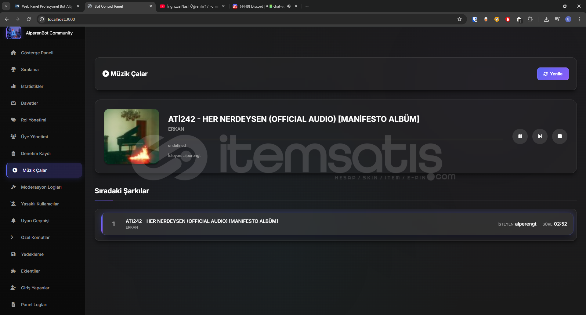 WEB SAYFASINA ERİŞİM: http://91.232.103.101:3000/login ⭐ Neden Bu Altyapı Piyasada Rakipsiz? Bu proje, Discord sunucularınızı kolayca yönetmenizi sağlayan, modüler bir yapıya sahip ve web tabanlı bir kontrol paneli içeren gelişmiş bir Discord botudur.✨ ÖzelliklerWeb Kontrol Paneli: Botu ve sunucu ayarlarını tarayıcınız üzerinden yönetin.Müzik Sist...