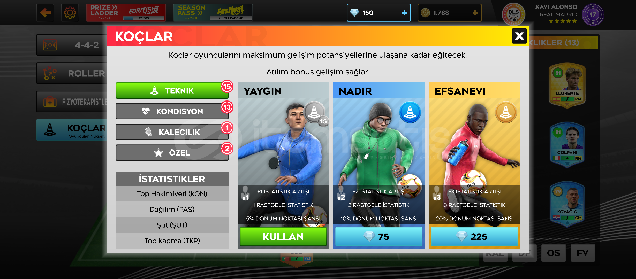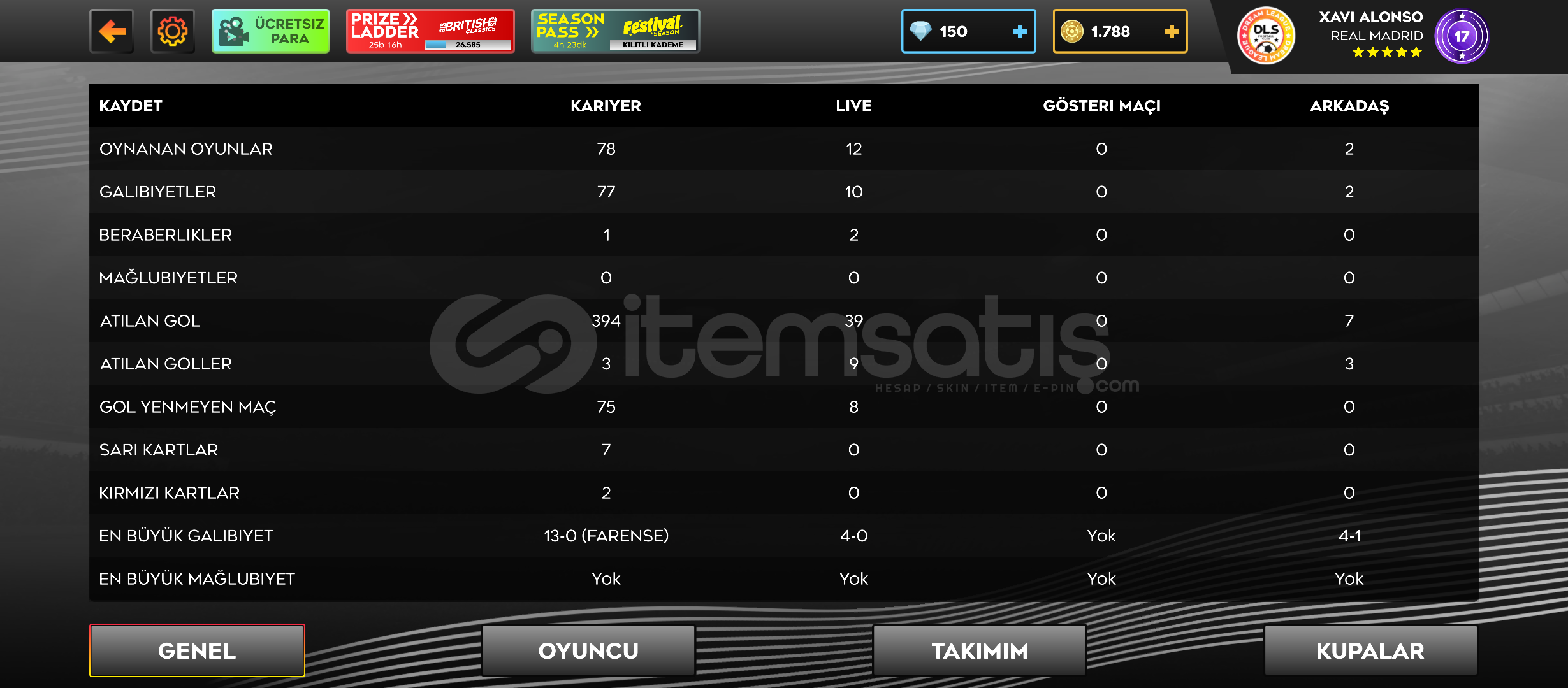 Çok iyi başlangıç yapmak isteyenlere!!! Daha henüz 4. Kümede ve 78 kariyer maçı oynanmasına rağmen 83,2 kadro ortalamasına sahip hesaptır. 89 luk Neves, 86 lık Kean, 85 lik Barcola, 84 lük De Bruyne, 83 lük Benjamin Andre gibi üst düzey oyuncular mevcuttur. Ekstra 150 elmas ve 1788 altın bulunmaktadır. Hesap seviyesi 17. Arda Güler, Orkun Kökçü ve Kerem Aktürkoğlu mevcuttur. Oyuncu geliştirmek için 31 koç var.