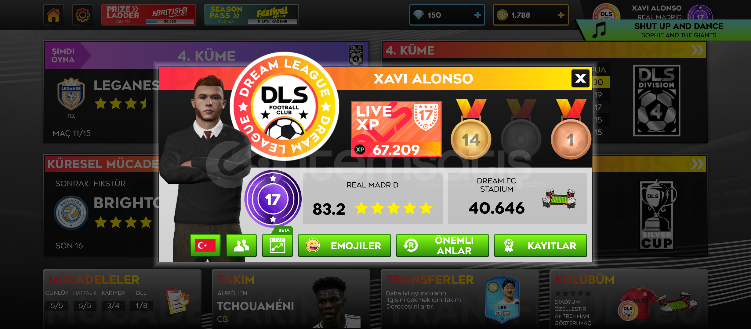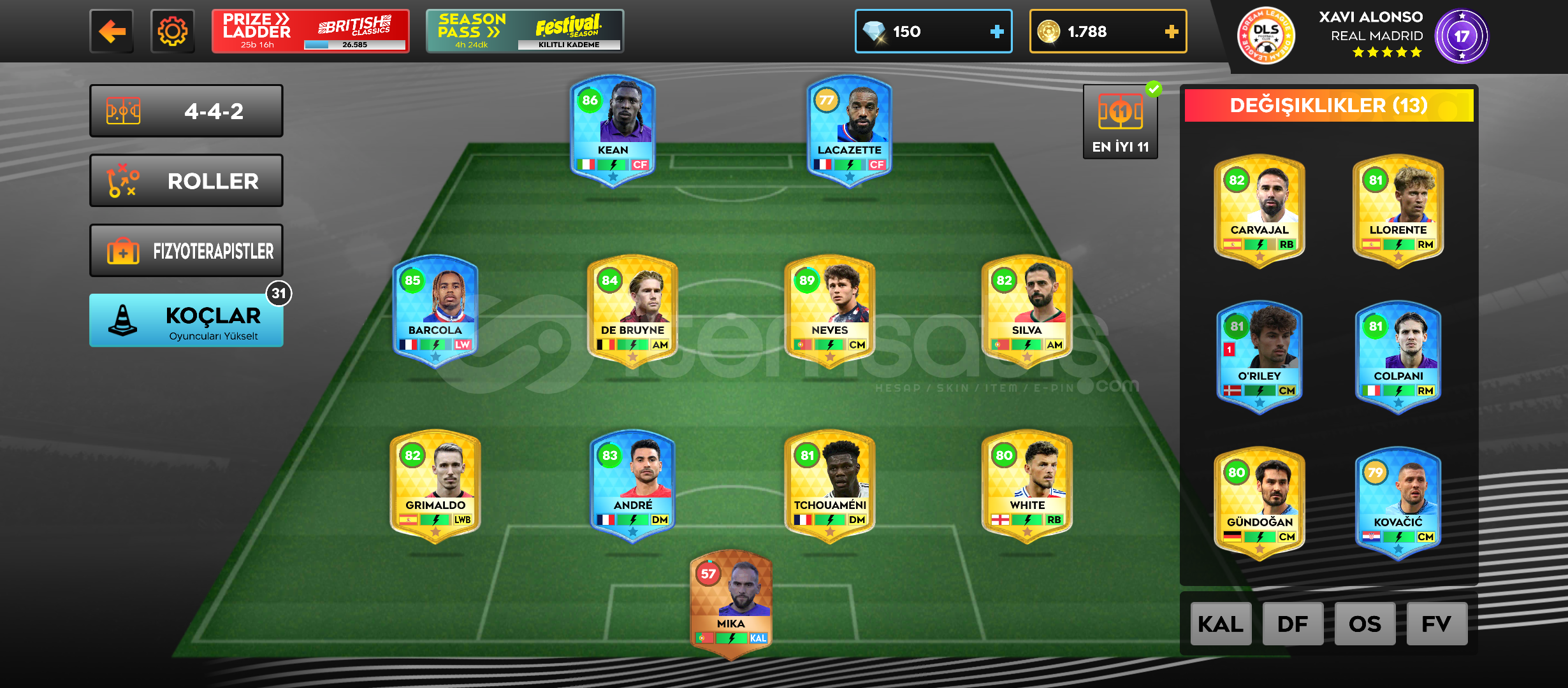 Çok iyi başlangıç yapmak isteyenlere!!! Daha henüz 4. Kümede ve 78 kariyer maçı oynanmasına rağmen 83,2 kadro ortalamasına sahip hesaptır. 89 luk Neves, 86 lık Kean, 85 lik Barcola, 84 lük De Bruyne, 83 lük Benjamin Andre gibi üst düzey oyuncular mevcuttur. Ekstra 150 elmas ve 1788 altın bulunmaktadır. Hesap seviyesi 17. Arda Güler, Orkun Kökçü ve Kerem Aktürkoğlu ...