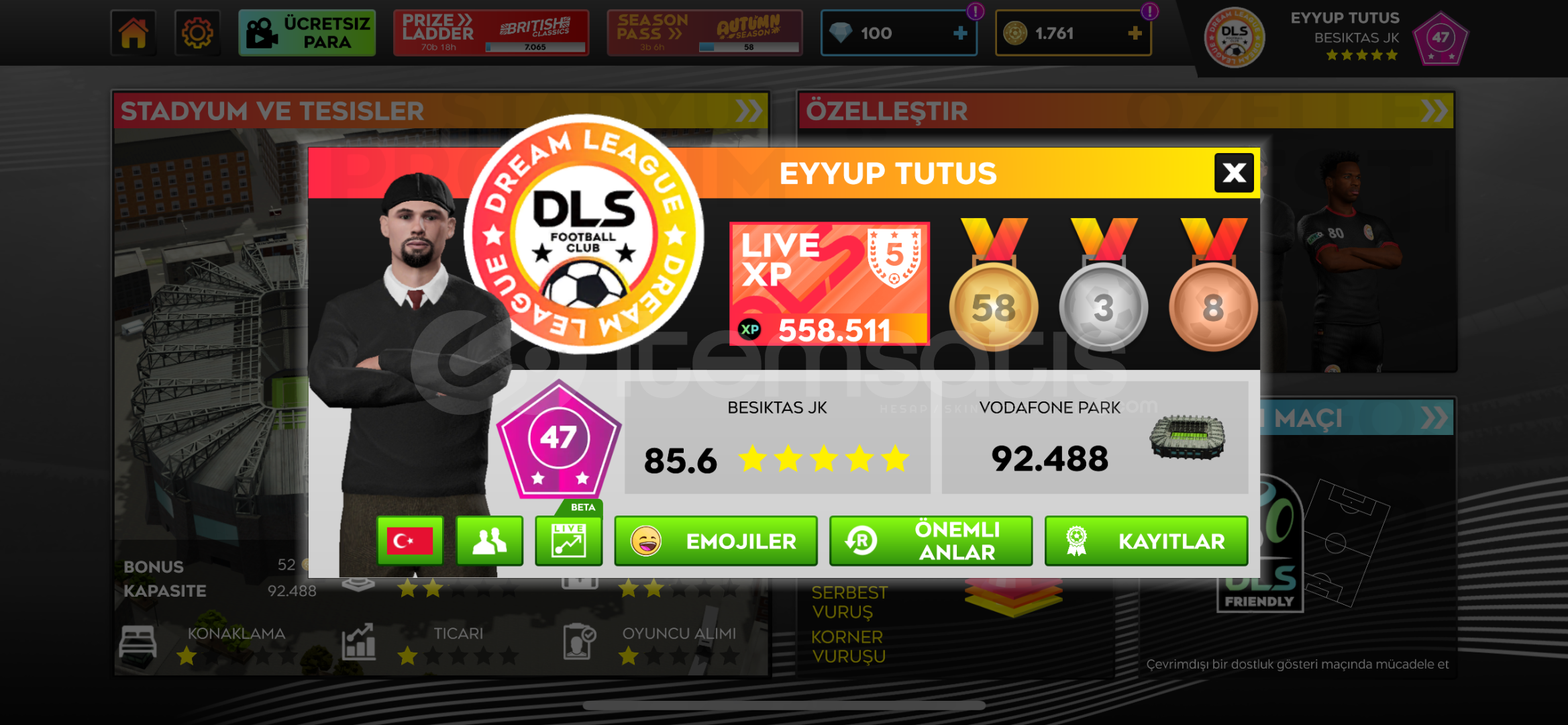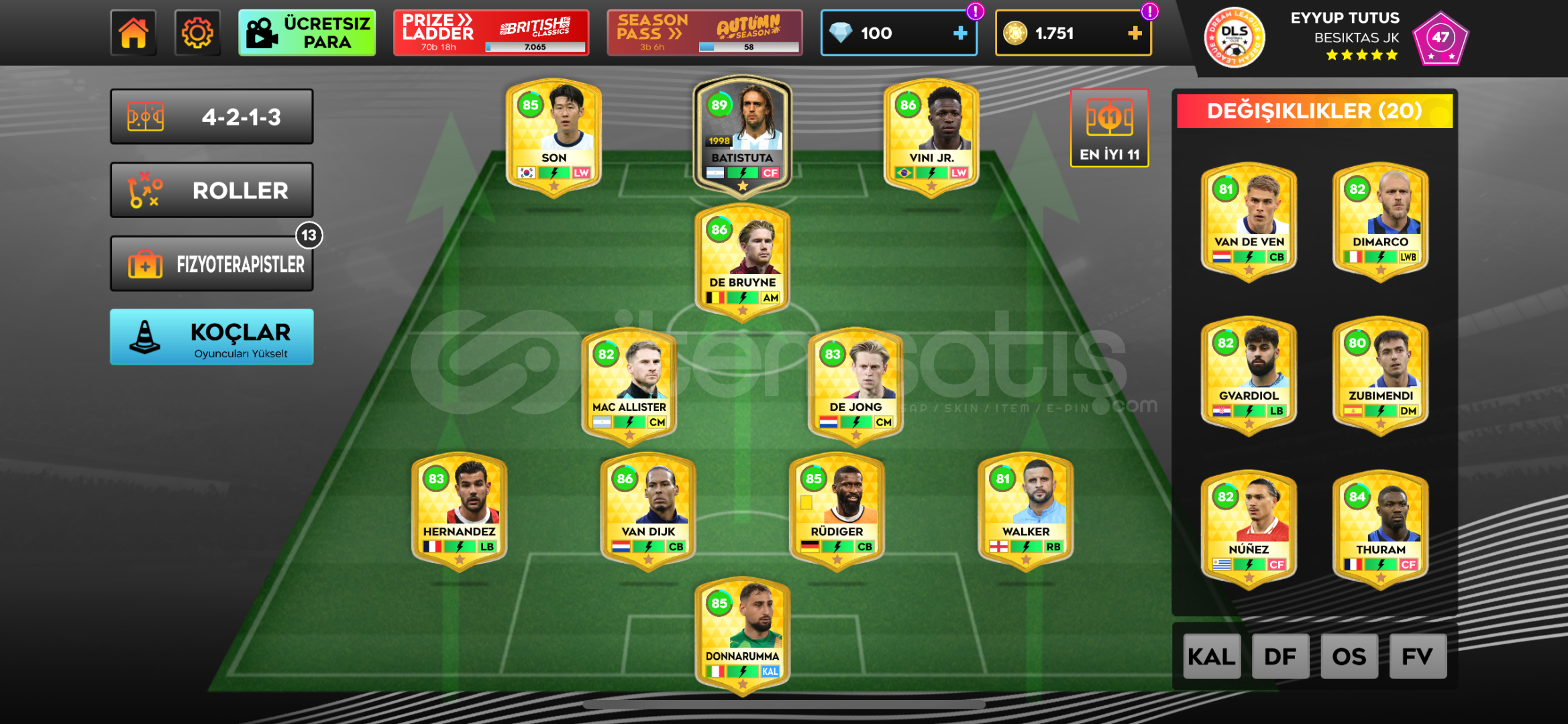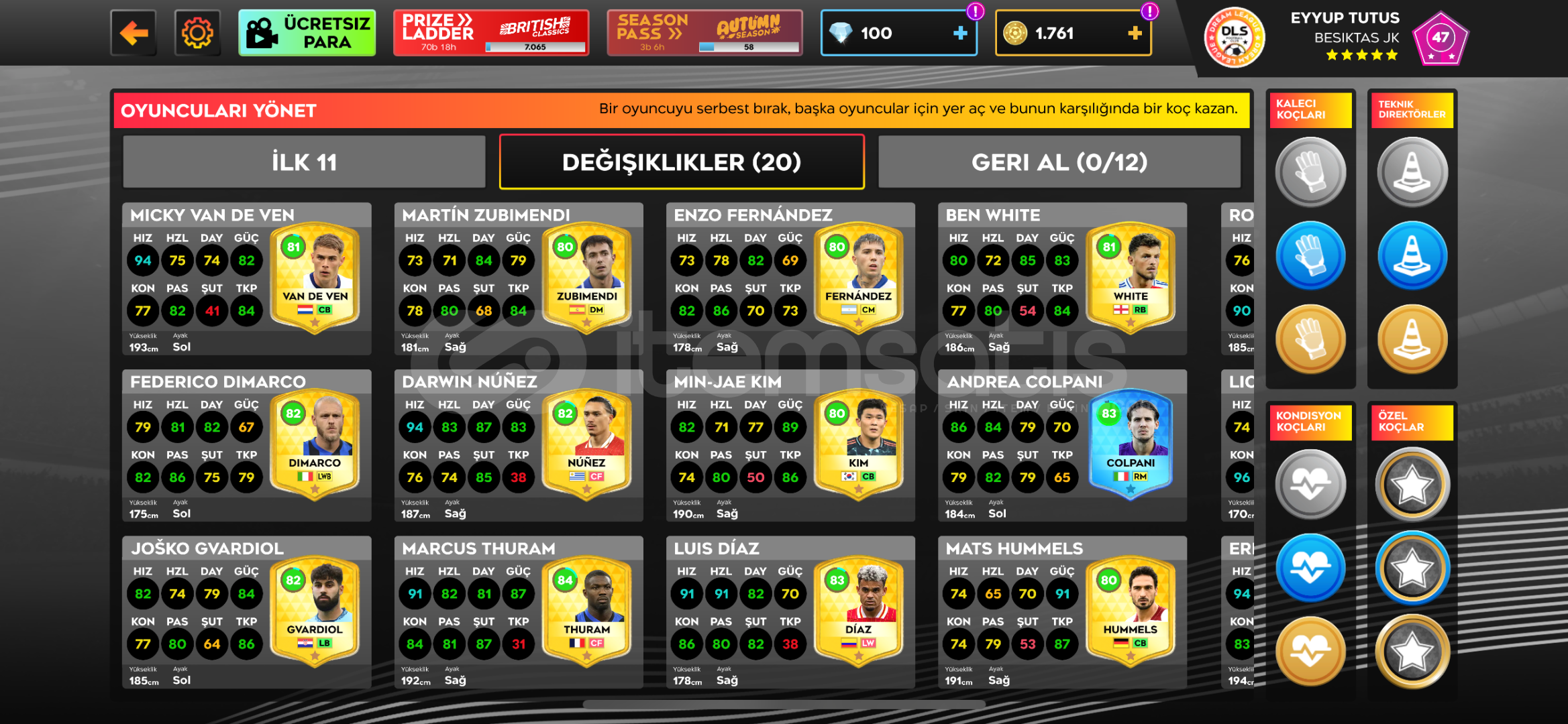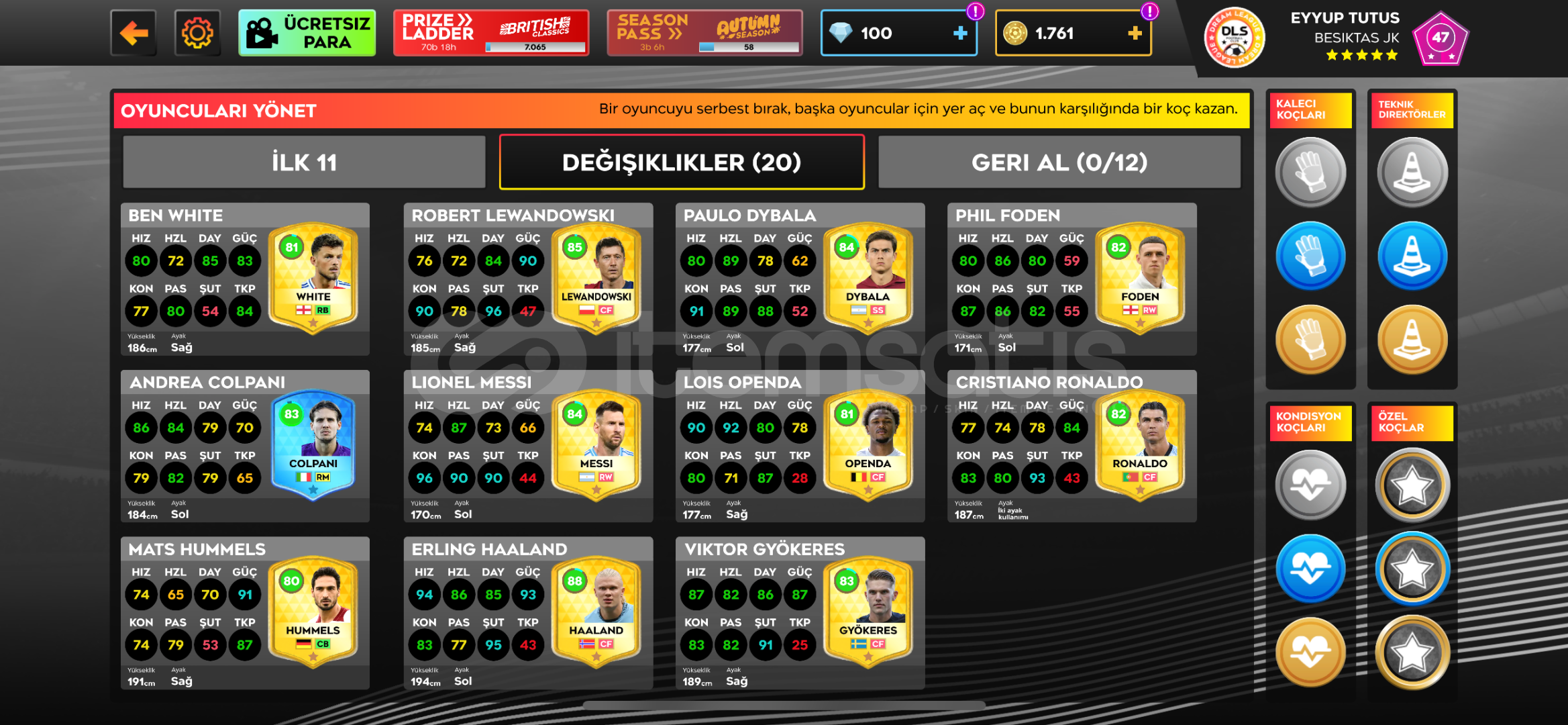 Dls 25 Takım Seviyesi 85,6 Altın:1761Elmas:100Oyuncular ve Genleri:Kale: Donnaruma 85Savunma: Theo Hernandez 83 Virgil Van Dijk 86Antonio Rüdiger 85kyle Walker 81Van De Ven 81Gvardiol 82kim Min Jae 80Ben White 81Mats Hummels 80ORTA SAHA:Mac Allister 82Frenkie De Jong 83Kevın De Bruyne 86Dımarco 82Zubımendi 80Enzo Fernandez 80HÜCUM:Heung Mın Son 86Gabriel Batıstuta 89Vını jr. 86Darwin Nunez 82Marcus Thuram 84Luiz Diaz 83Lewandowski 85Messi 84...