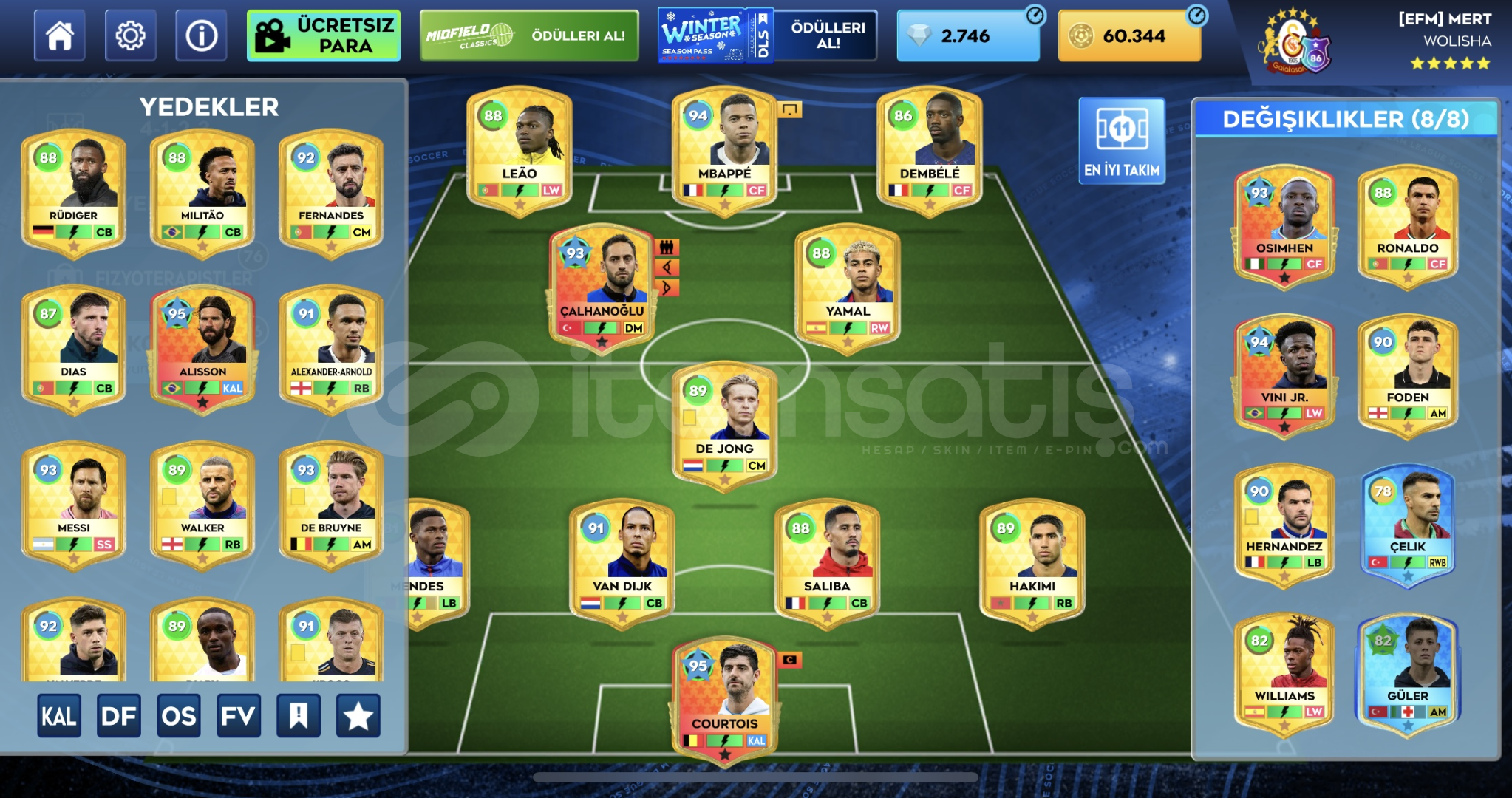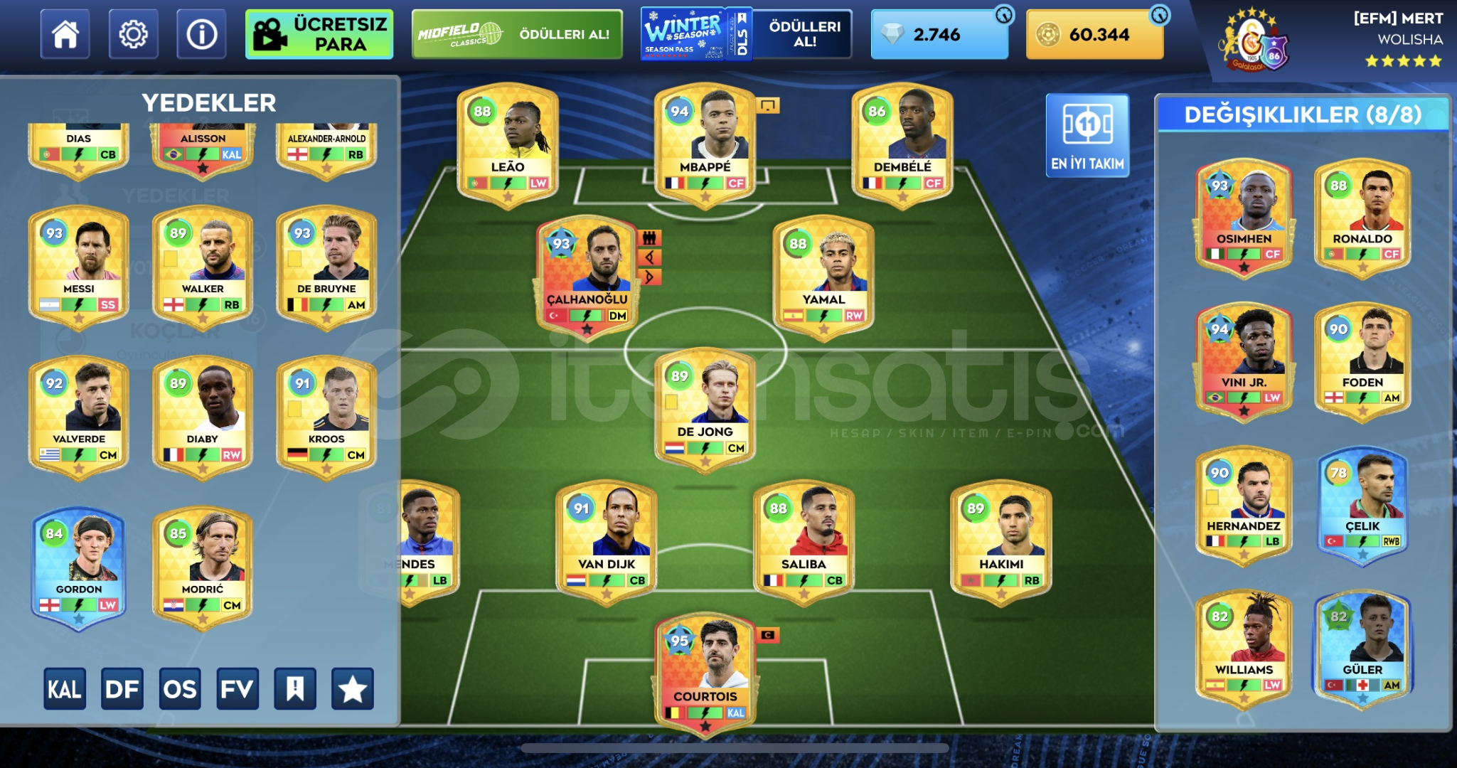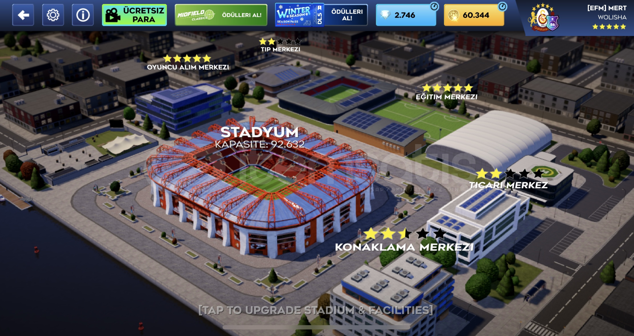 Dls Uygun hesap satışı;60.344 Gold para2.746 ElmasStad FullOyuncu Alım Merkezi 5 Yıldız (Full)Tıp Merkezi 2 Yı...