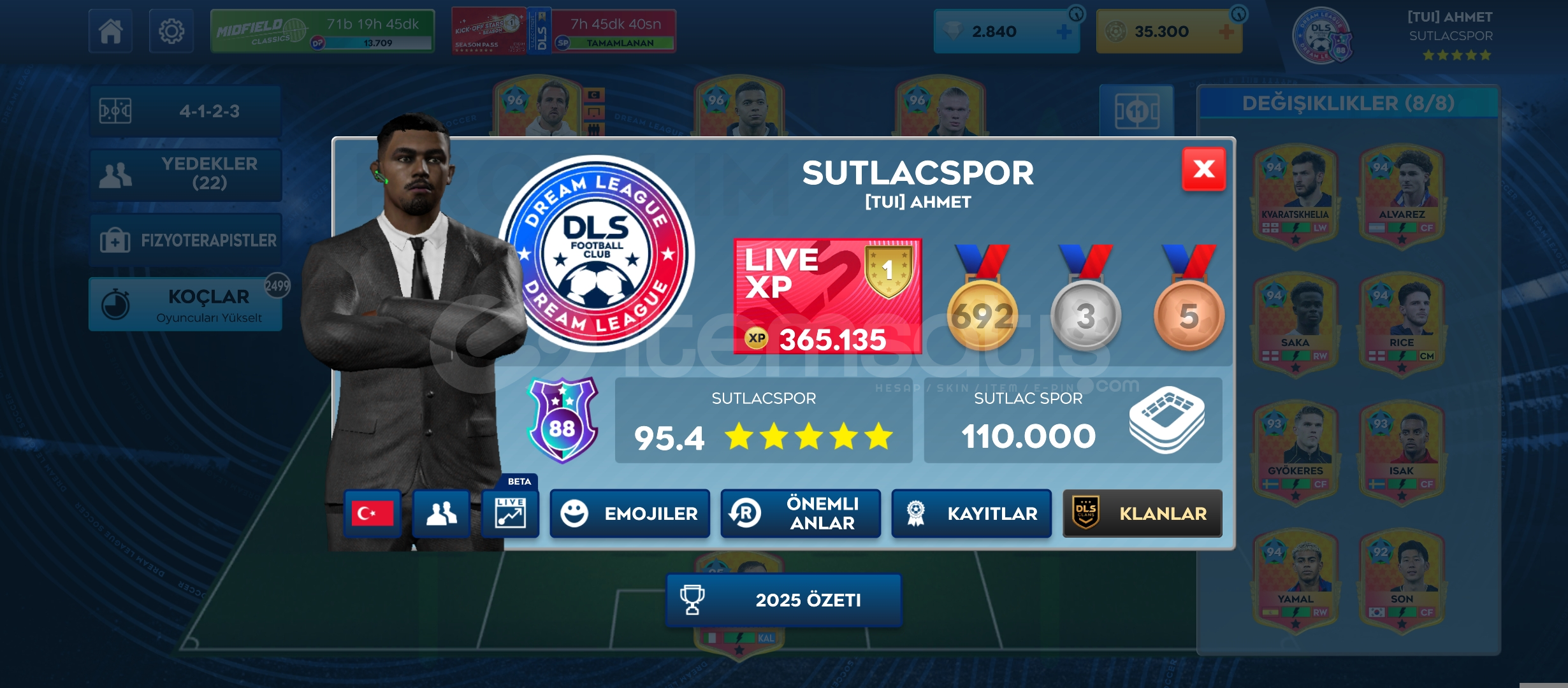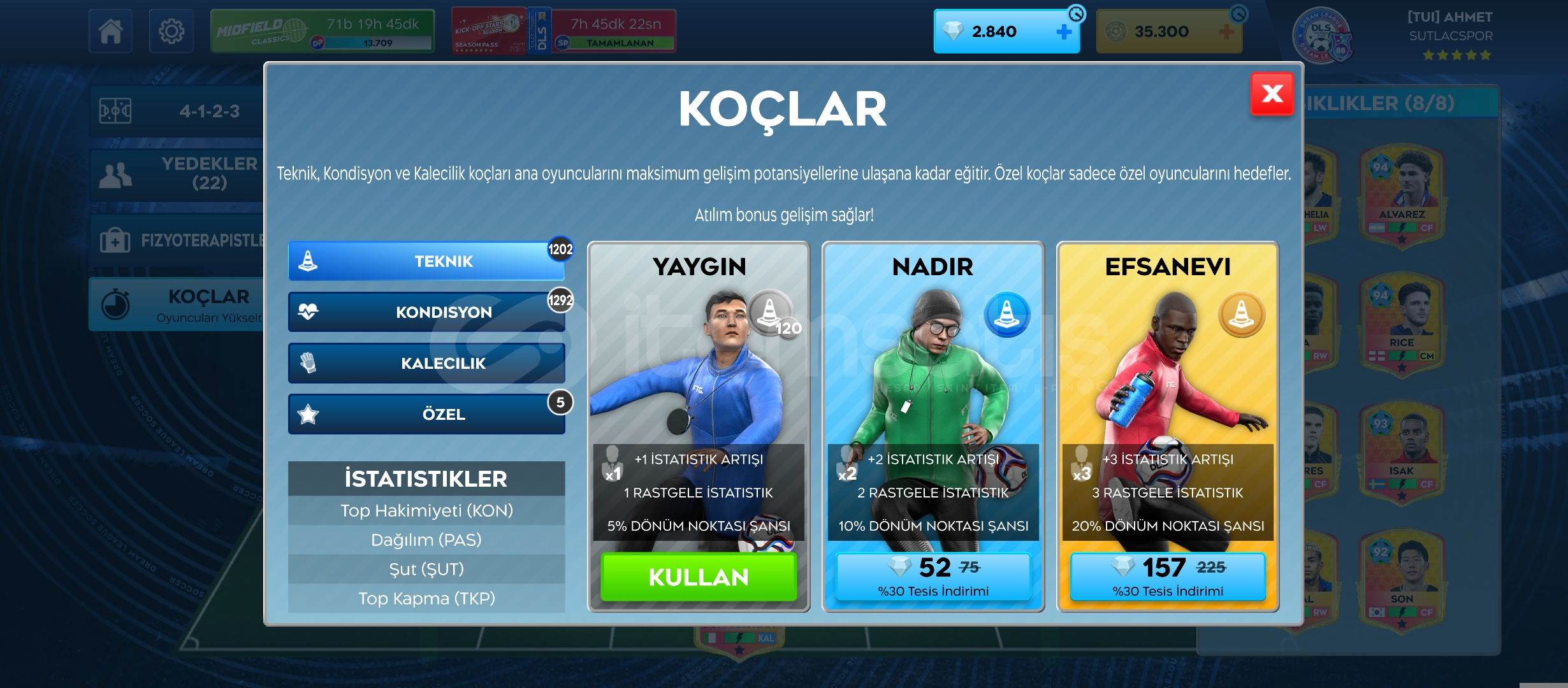 2840 elmas35.300 altın41 max oyuncuSezon pas Raphinha (Max)1202 yaygın teknik1292 yaygın kondisyonŞampiyon Arenası – 110.000 kapasiteSeviye 88