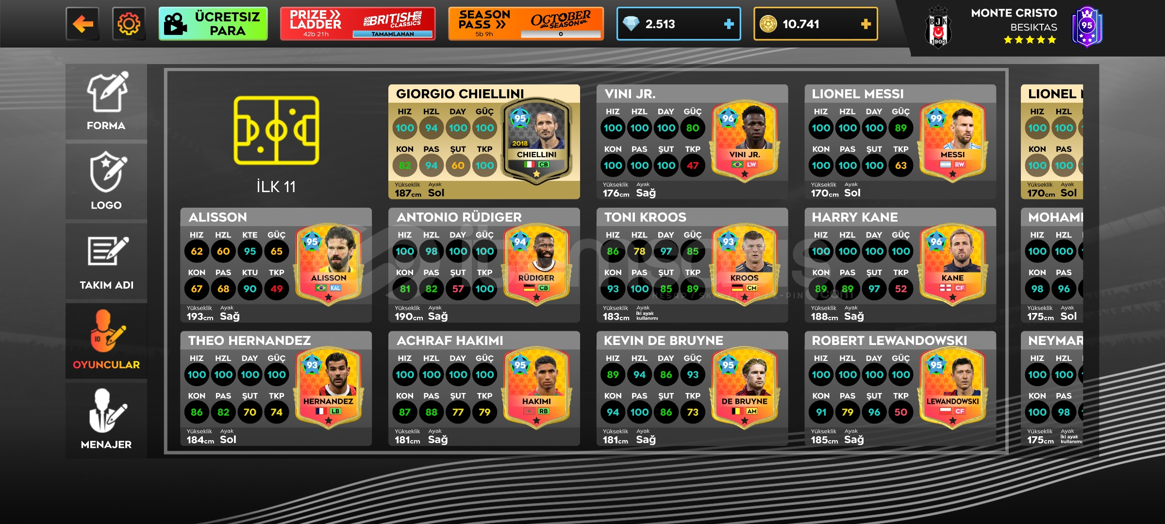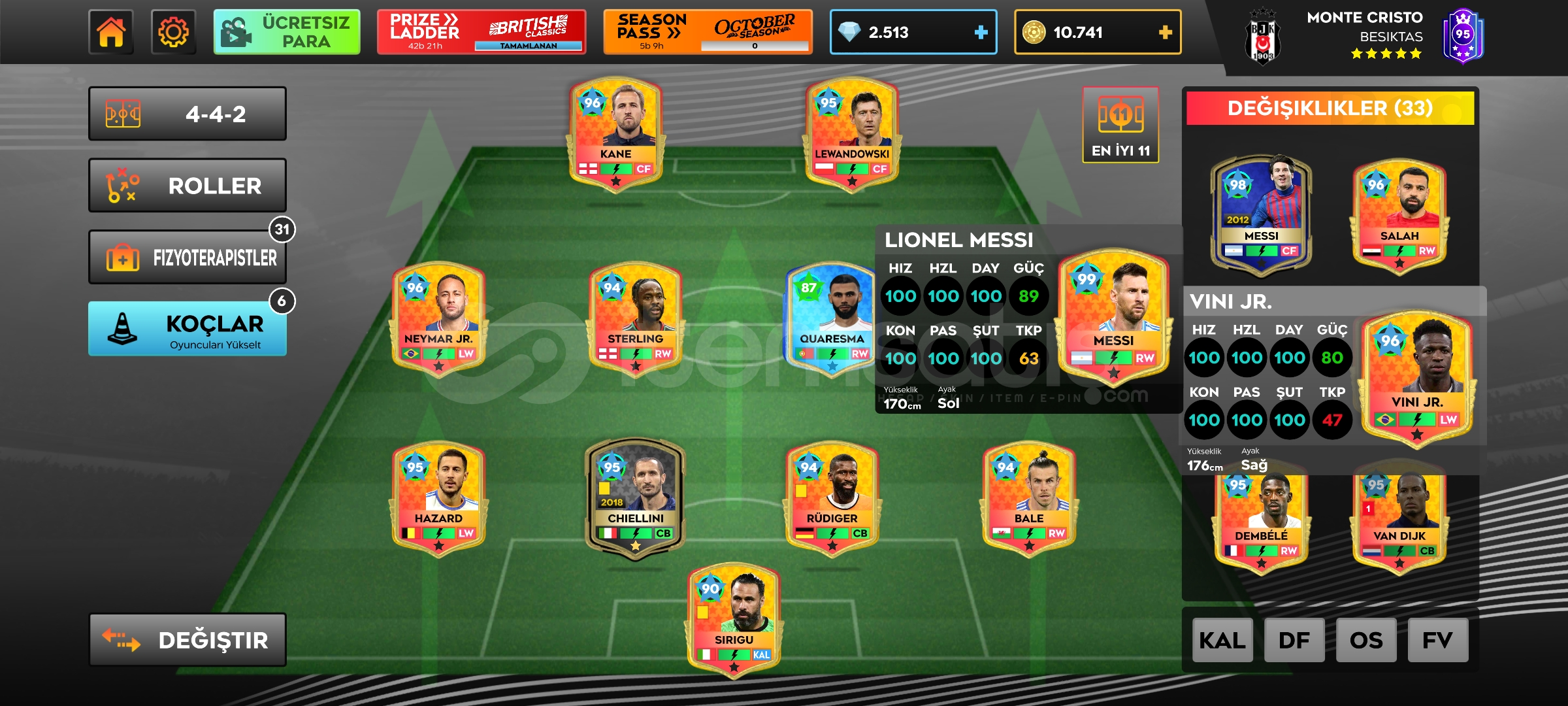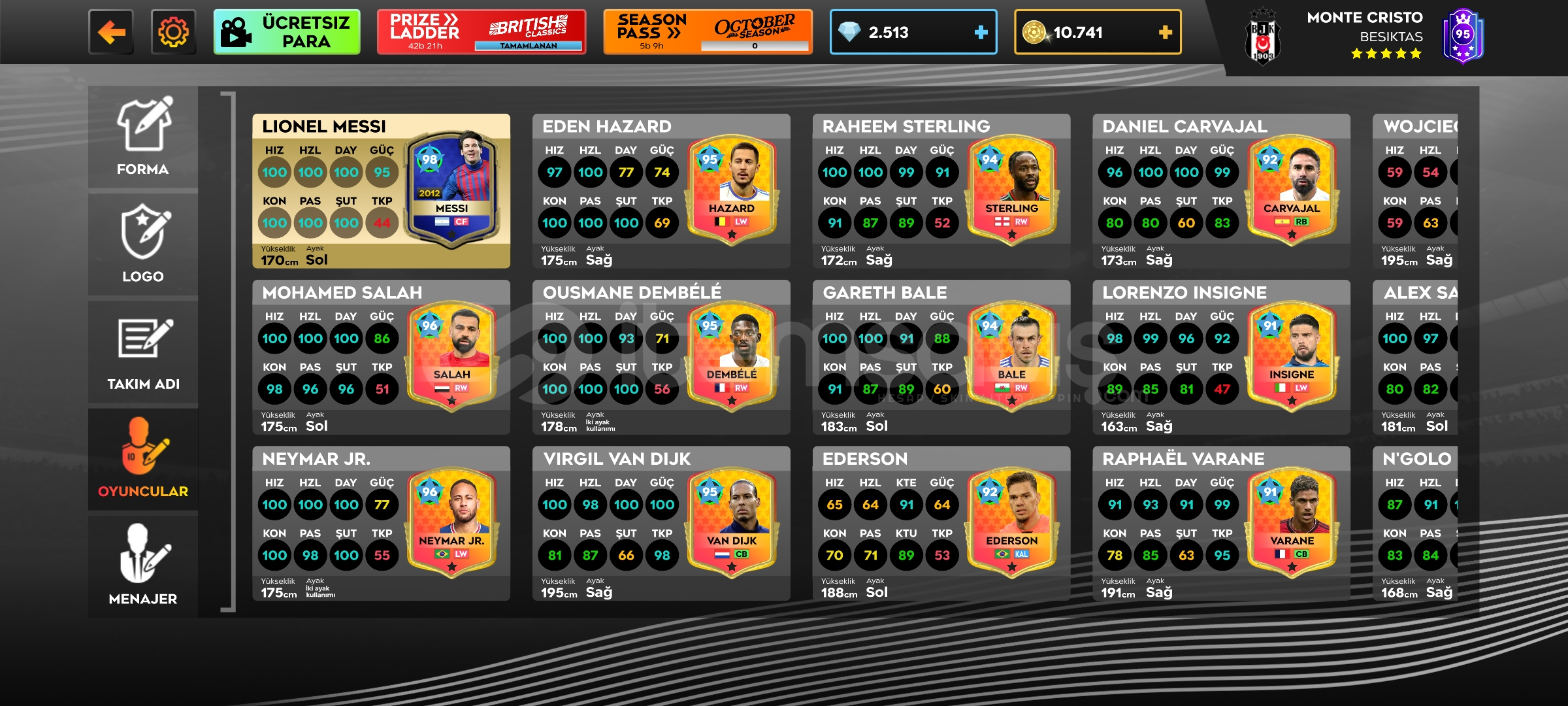 SATILIKQ799 MESSİ 96NEYMAR BALE HAZARD GİBİ ESKİ GEN OYUNCULAR2.500 ELMAS10K ALTINMAX TESİSLER