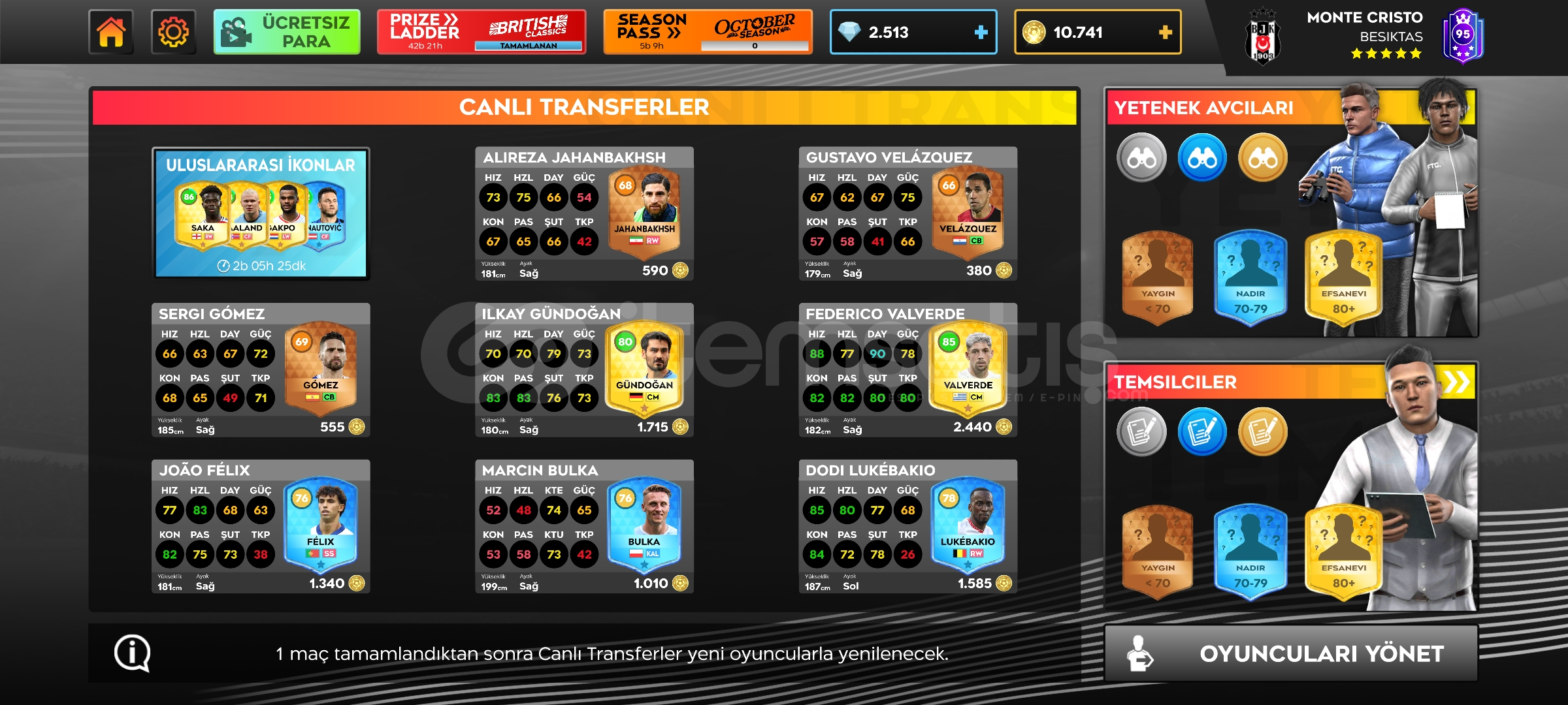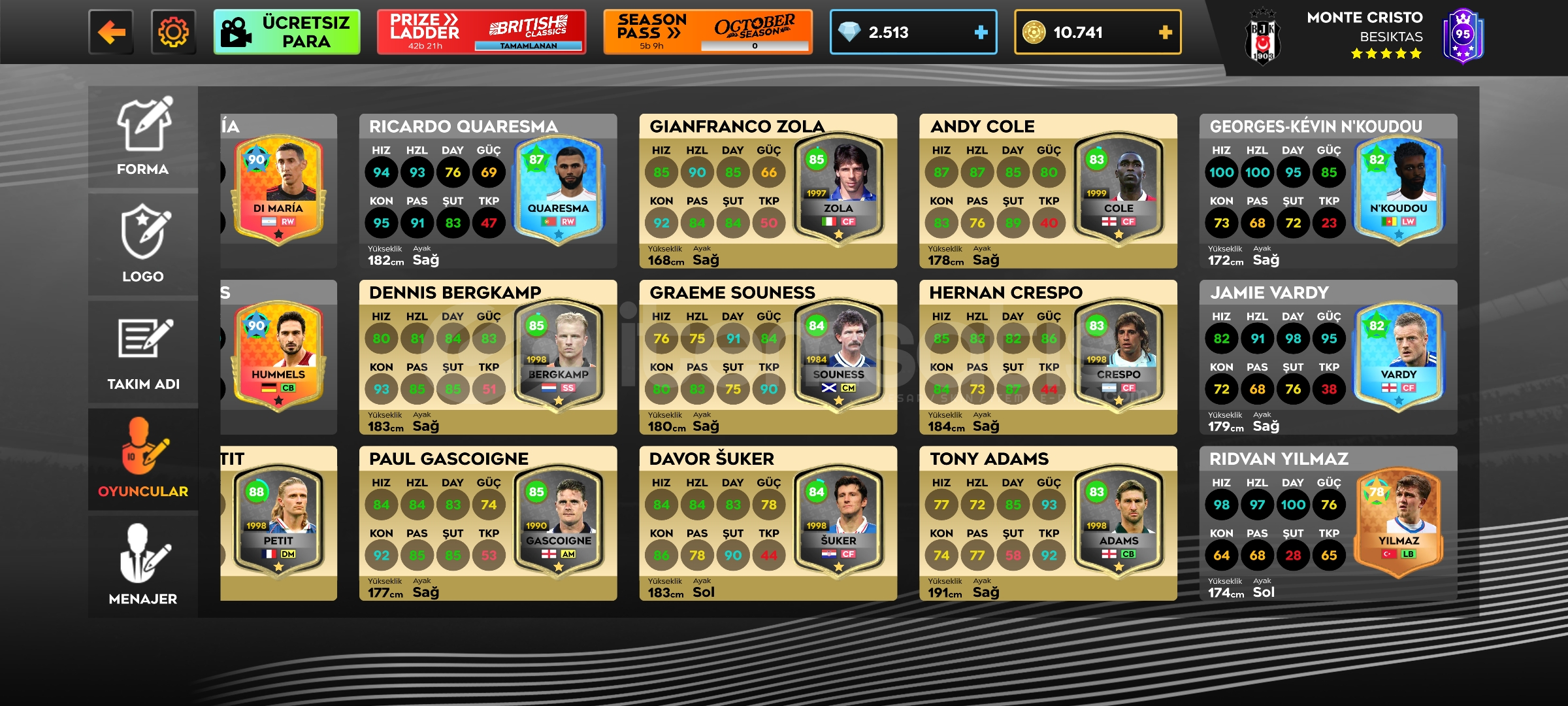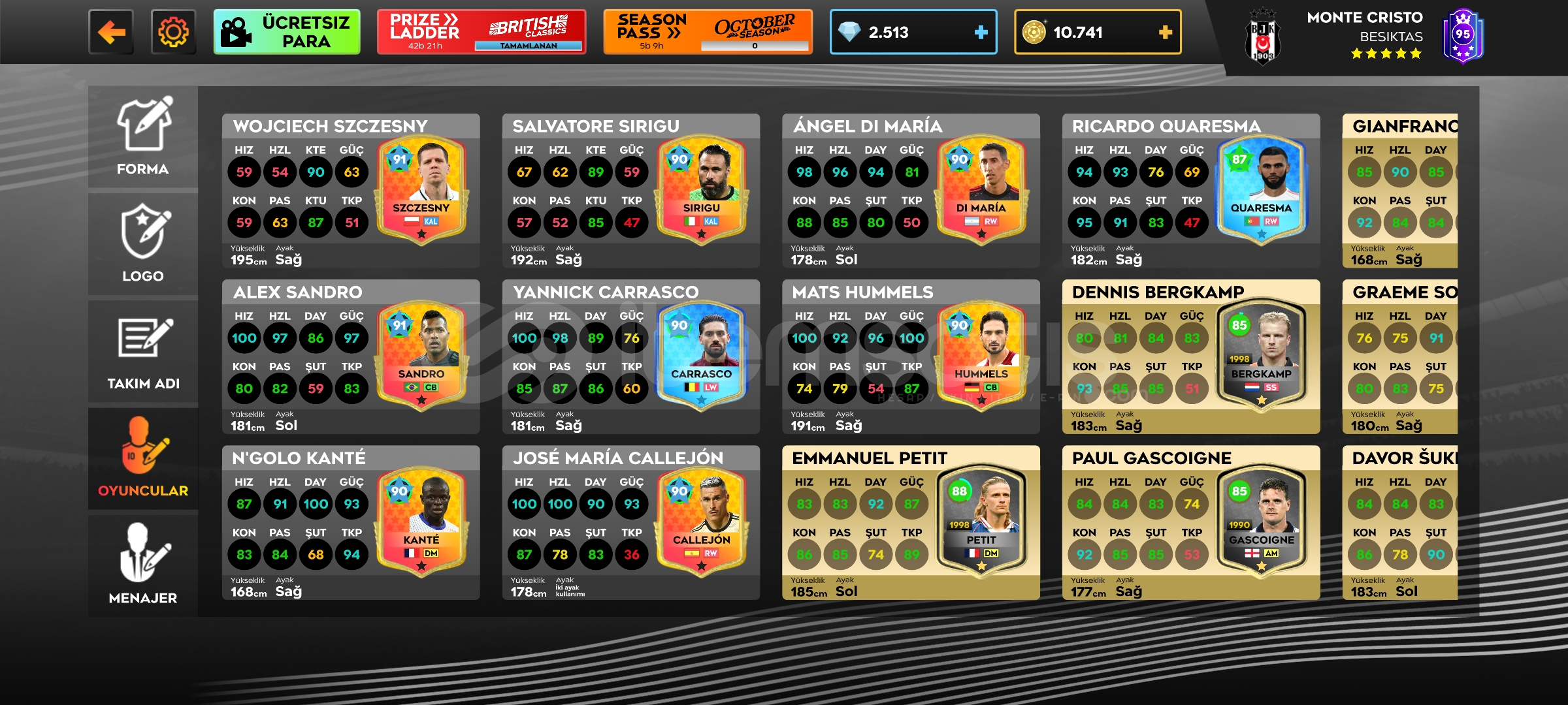 SATILIKQ799 MESSİ 96NEYMAR BALE HAZARD GİBİ ESKİ GEN OYUNCULAR2.500 ELMAS10K ALTINMAX TESİSLER