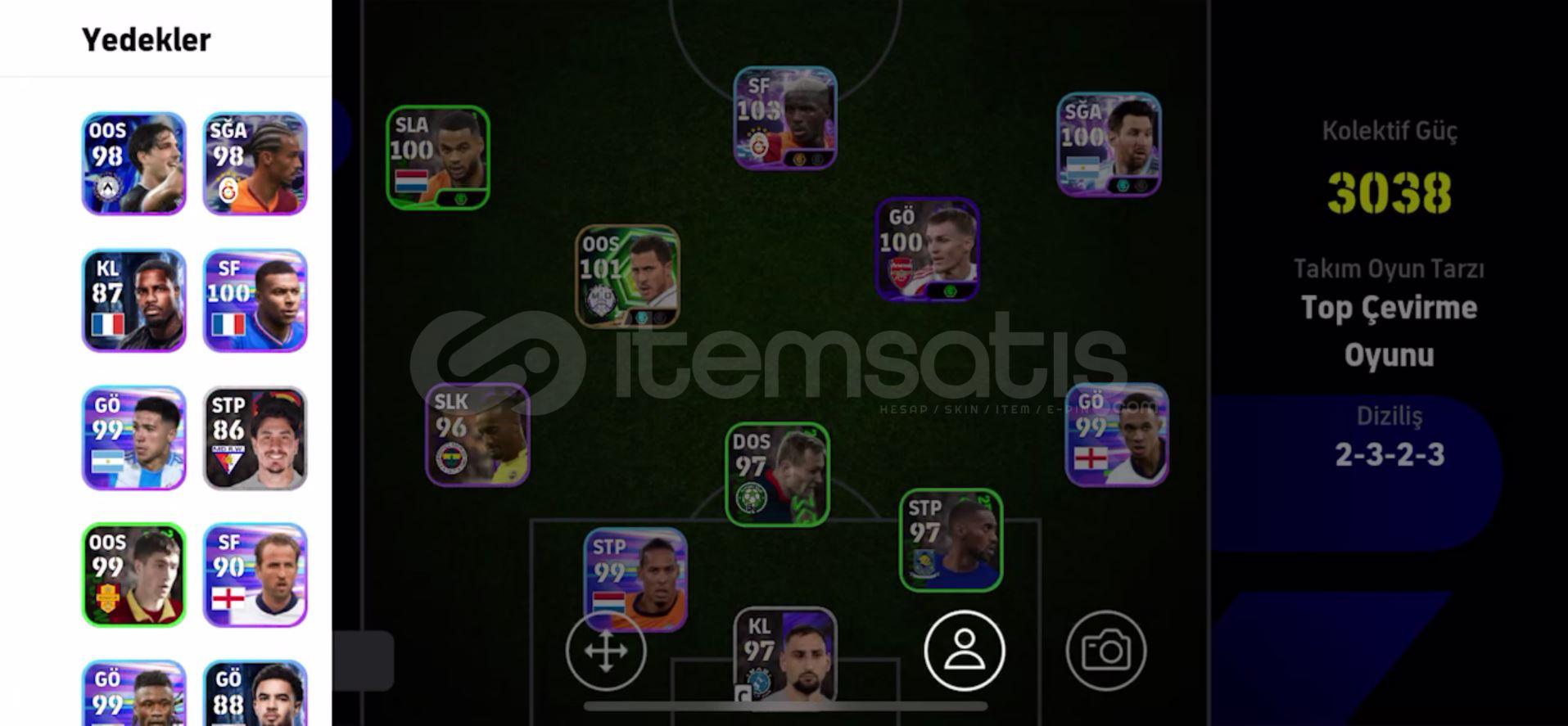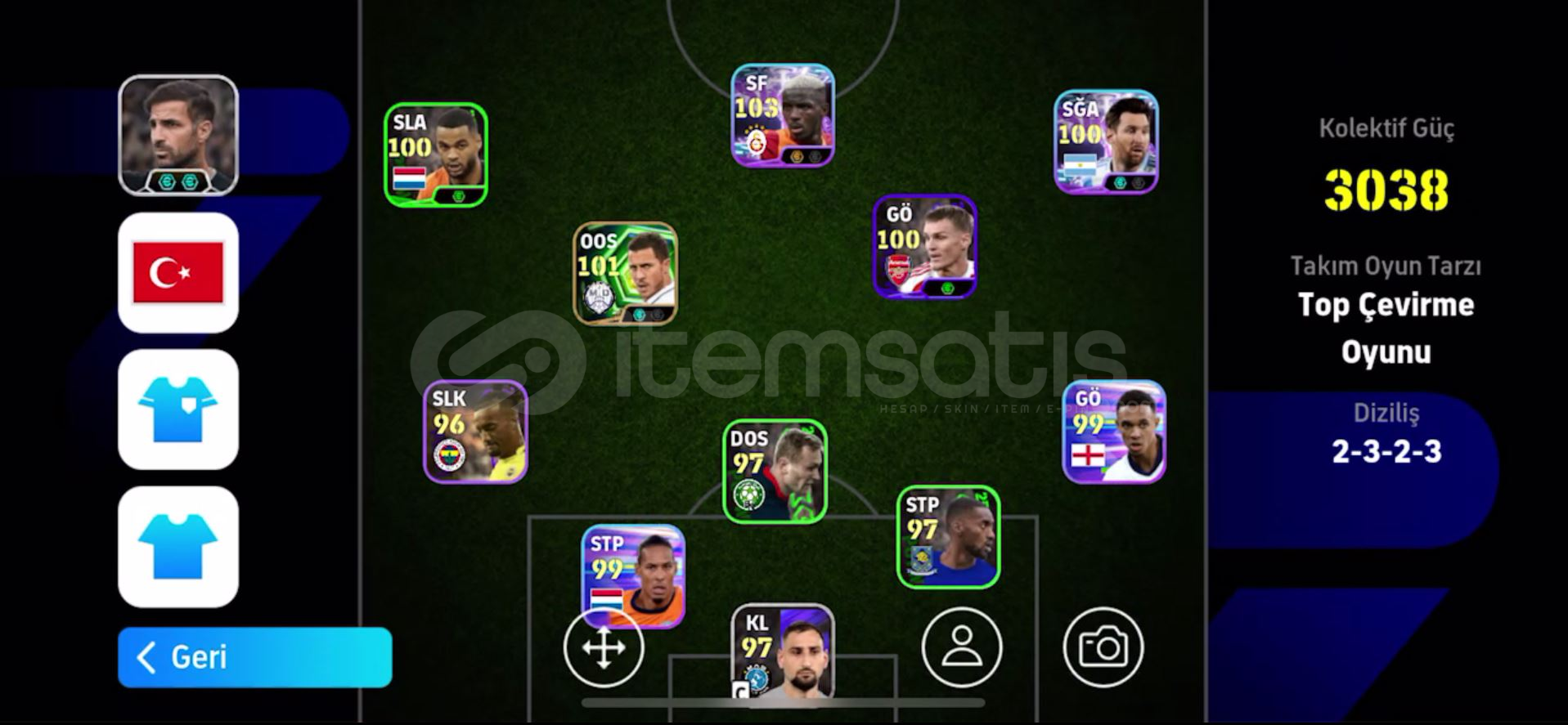 🚀 eFootball 2025 - 3038 Kolektif Güçlü Efsane KadroKadro Genel Durumu:Kolektif Güç: 3038Diziliş: Nadir bulunan ve hücumda etkili 2-3-2-3 sistemi.Oyun Tarzı: Top Çevirme Oyunu (Yüksek seviye uyum).🌟 Öne Çıkan Oyuncular:Victor Osimhen (103): Takımın gol makinesi, en yüksek seviyede.Eden Hazard (101): Özel kart, oyun kurucu ve dripling ustası.Lionel Messi (100): Sağ kanatta bitiric...
