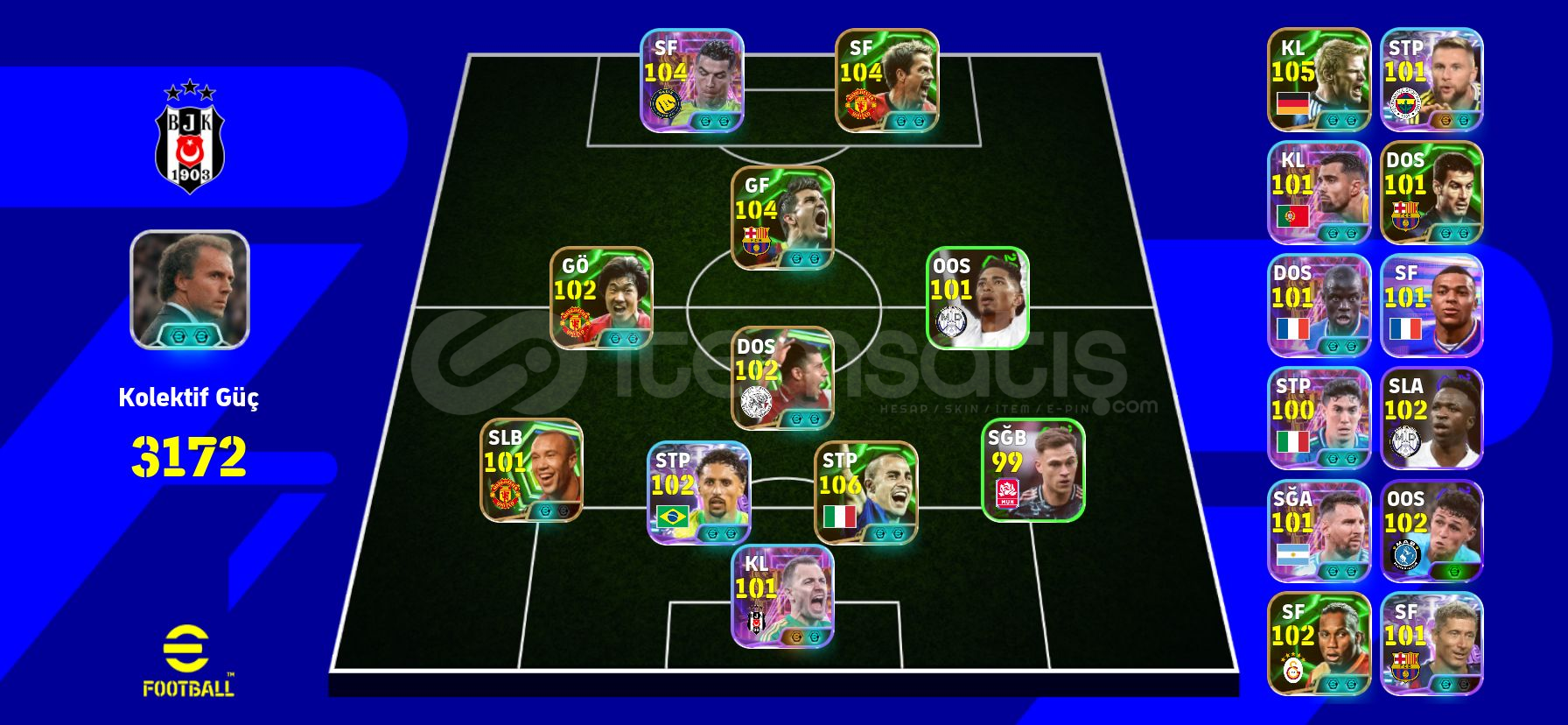 hesapta fotoğraflarda görüldüğü gibi;105 Cristiano Ronaldo104 Bombacı David Villa104 Michael Owen106 Oliver kahn106 Cannavaro103 Marquinhos103 Rijkaard102 Eden Hazardgibi toplamda 119 oyuncu vardır. detaylara kadro fotoğraflarından ulaşabilirsiniz.hesapta eksi mc yoktur.tek Bağ konamidir.bu hesabı alan pişman olmaz 3330kg lik hesap yendim bu kadro ile. Zaten david villayı bilmiyenler kesinlikle youtube'dan 'Bomb...