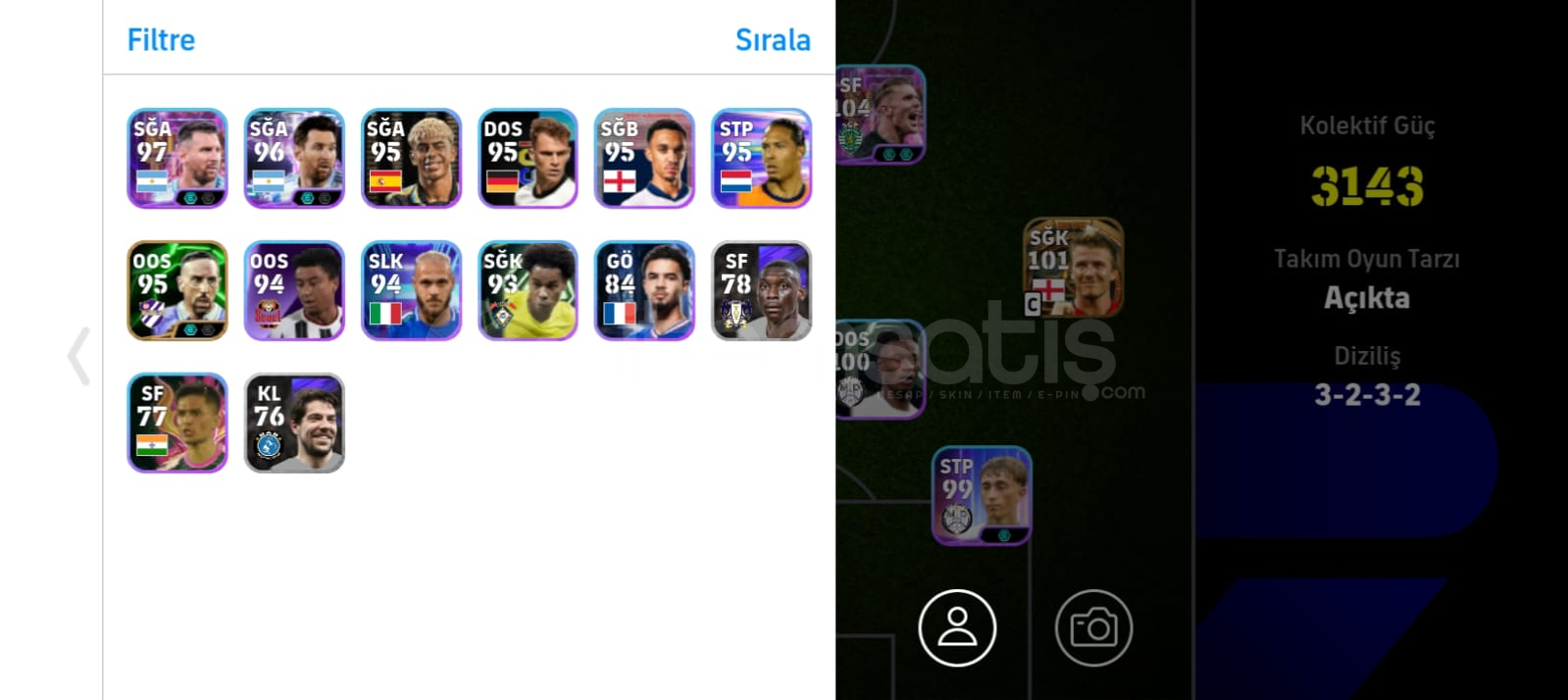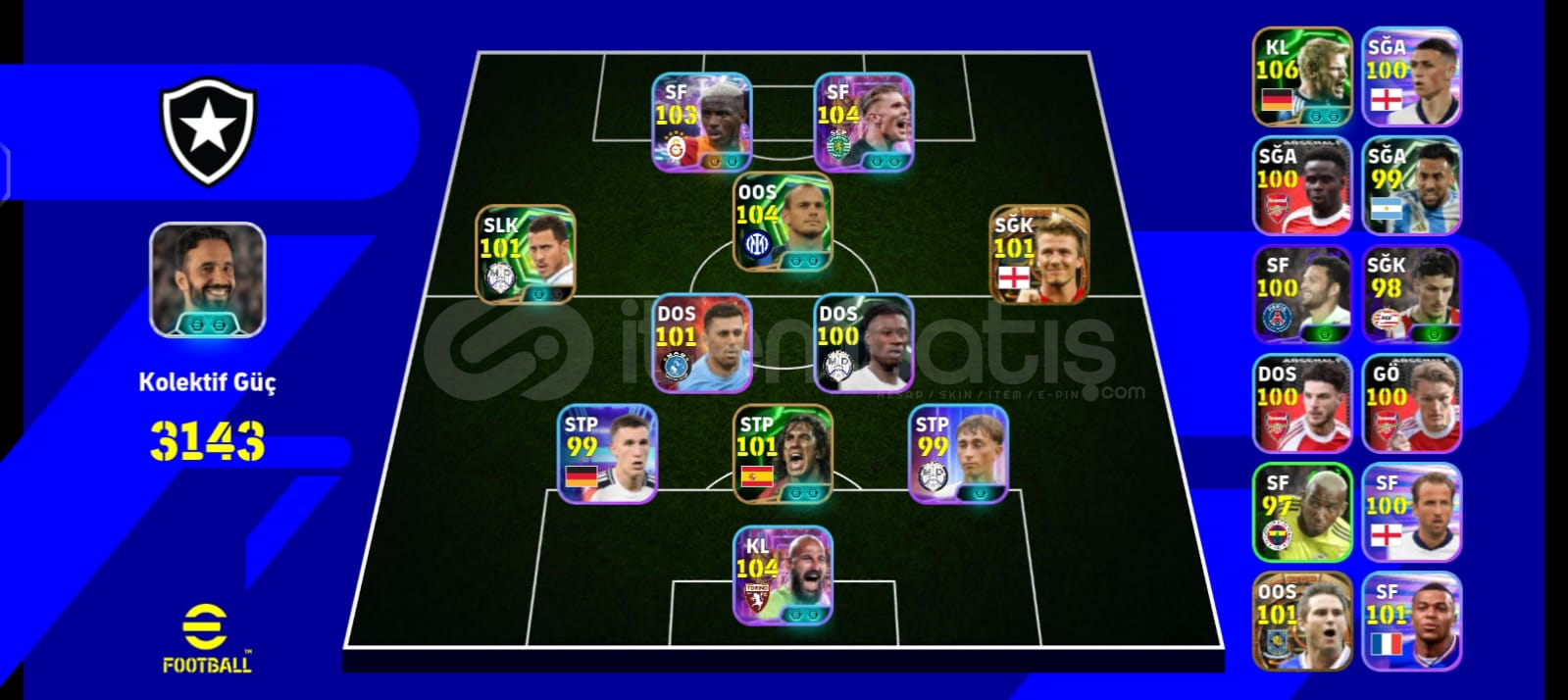 Hesap görüldüğü gibi gayet oynanılabilir seviyede tek bağ bir hesaptır hesapta muhtemelen sizinde en çok ilginizi çekecek şey sneijder olacaktır çünkü pır pır orta saha tanımına tam uyan bir kart şut,pas,dripling,çalım özelliklerini barındırıyor yani asistte yapar golde atar osimhen yanlış bilimyorsam doğru güçlendiriciyle 104 oluyor yani hesaptaki 4 tane kart 104 oluyor arkadaşlar bu hesabımız gerçekten güzel değerli bir hesap alıcısına hayırlı olsun.