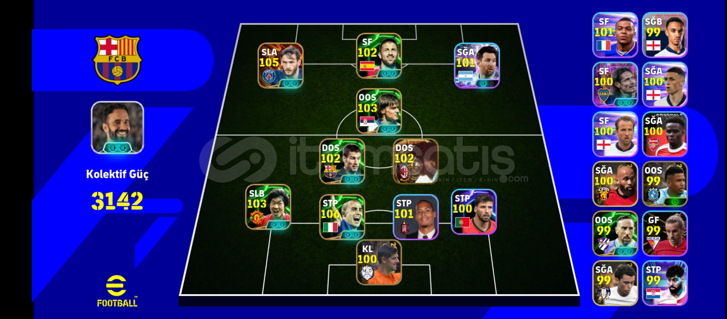 105 Bombacı Kvaratskhelia,106 Cannavaro,103 Stojkovic,103 Park Ji Sung,102 Rijjkard,102 David Vİlla gibi kartlar vardır uygun fiyata güzel hesap