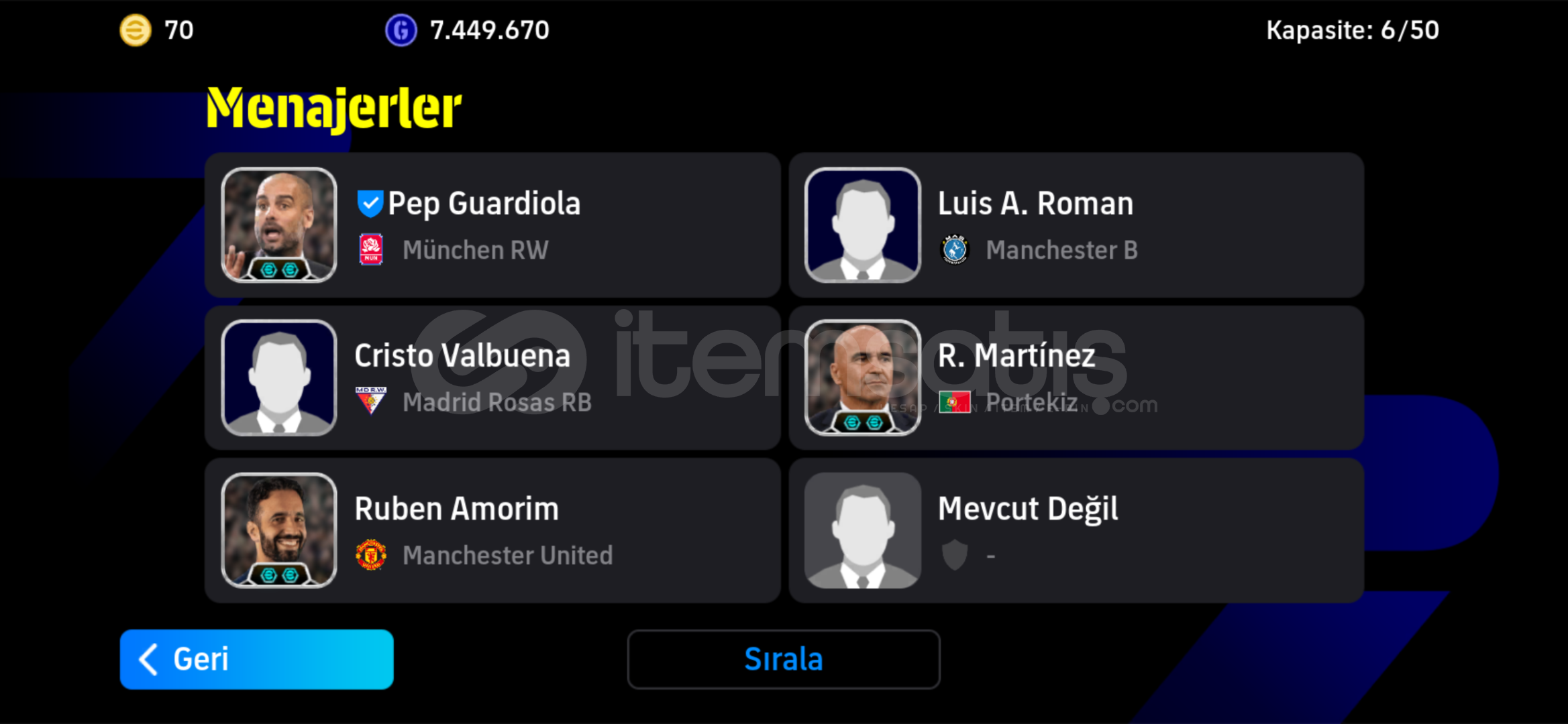 HESAP TEK BAĞDIR MAİL ŞİFRE DEĞİŞTİRİLEBİLİRAktif 9 Giriş Hakkı105 Lamine Yamal103 Victor Osimhen105 Oliver Kahn +200 OyuncuPep GuardiolaR. MartinezRuben Amorim+2 Teknik DirektörPazarlık Vardır.