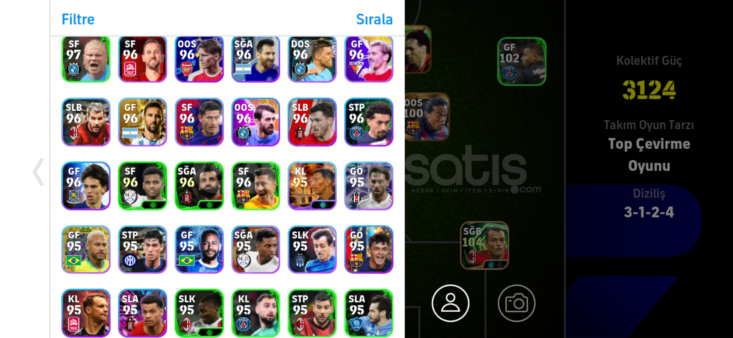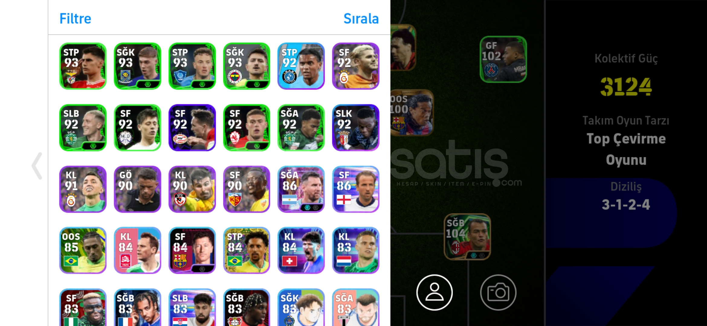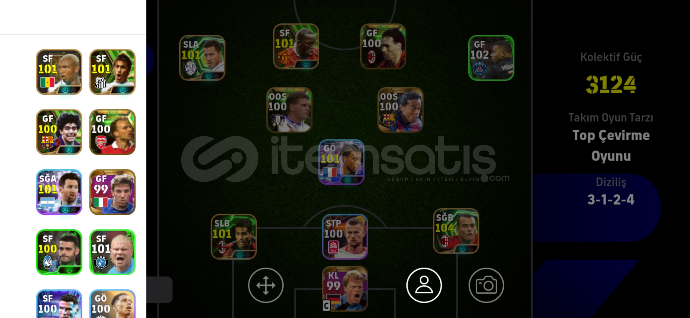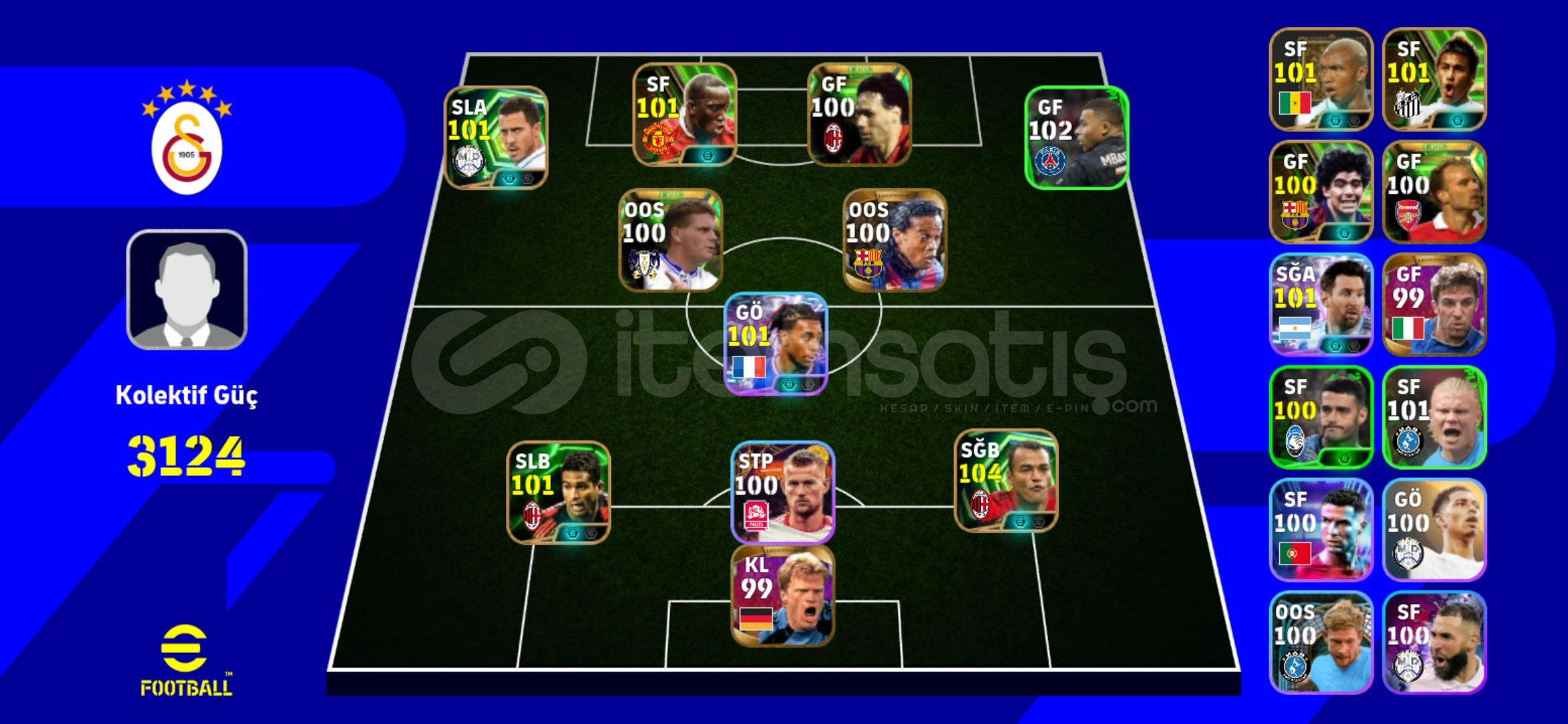 Hesapta gördüğünüz gibi;105 cafu tekte çıktı.100 Ronaldinho efsanevi (ikon) kart101 Dwight Yorke102 mbappe (psg kartı)102 Bombacı Micheal olise101 serginho100 De light (2023 nadir kart)100 Van Basten (aşırı ender)99 Oliver kahn (EFSANEVİ İKON KART)99 Del piero (EFSANEVİ İKON KART)99 Paul Scholes (EFSANEVİ İKON KART)99 Lampard (EFSANEVİ İKON KART)100 Maradona100 Ronaldo100 benzema (aş&#...