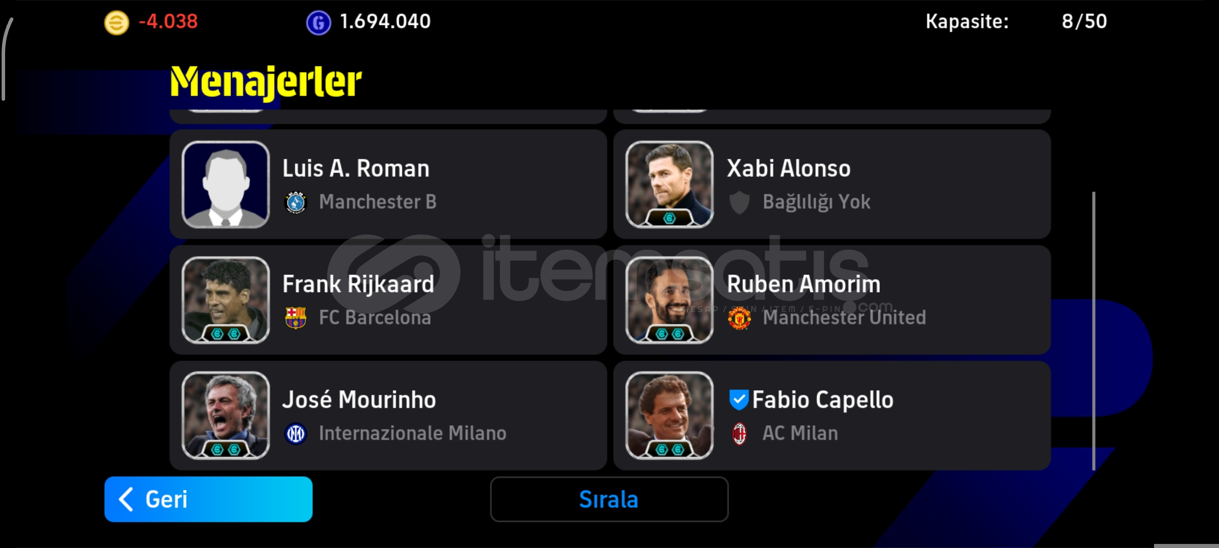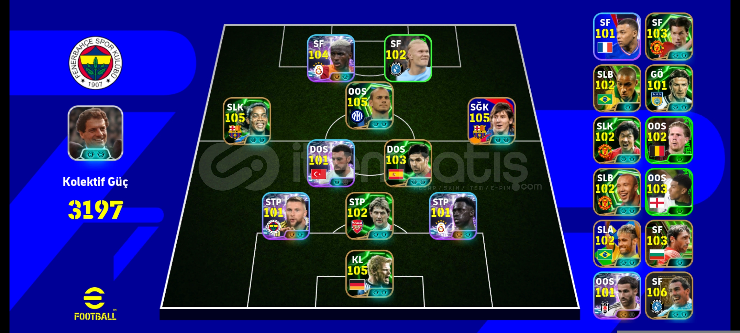 Eğer doğru güçlendiriciler eklenirse 3210a kadar çıkar die düşünüyorum çoğu oyuncu güçlenduricisiz hesapta yeni gelen çoğu TD var 105 Ronaldinho 105 Sneijder 105 khan 106 tevez 104 osimhen yani yeni gelen Süper lig paketi ful var hesapta 2 bağ var 2sinide vericem acil satlık