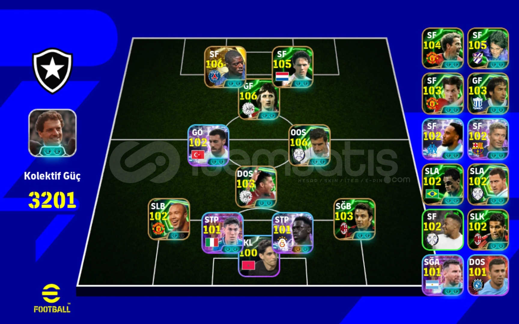 Hesapda 106 dembele vardır 106 cruyf ve 106 Figo 105van basten gibi oyuncular vardır hesap baya iyi forvetlerle doluTek sorun giriş hakkı kalmadı bu yüzden çok ucuz ayın başında yenileniyor az kaldı hesap çift bağ ama hiç bir sorun çıkmazAlırkan İçiniz rahat olsun endişeniz etmeden alabilirsiniz aktif olmasam bile alabilirsiniz hesap çok iyi3200+kg var İçiniz rahat ols...