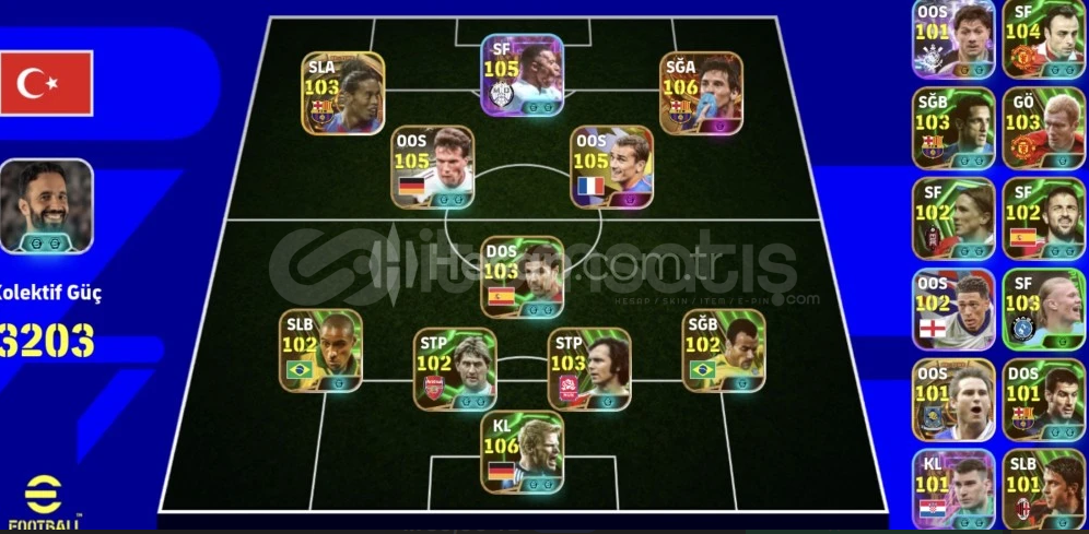 106 Lionel Messi (krampon öpen)105 Mbappe105 Griezmann105 Mattahus103 Ronaldinho104 Berbatov5 tane özel menajer vardırPazarlık payı vardırGoogle play baglı ama kaldırılmıştırTek bagdır