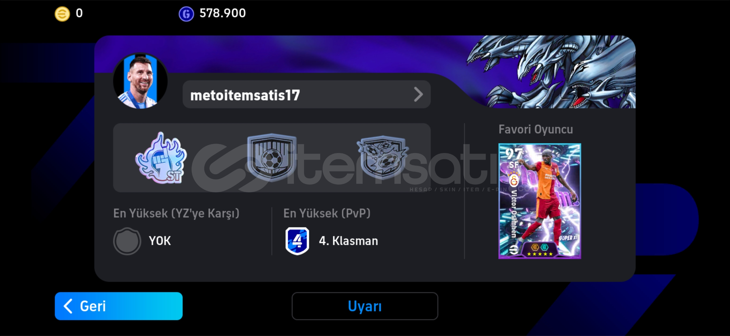 MAİL DEĞİŞİMİ YAPILIR ✅️TEK BAĞ 106 OSHİMEN 103 MESSİ PAKETİ ALINMIŞ✅️ÖZEL TEMALAR ✅️7/24 HIZLI TESLİMAT HESABI ALDIĞINIZ AN AKTİF OLURUM.✅️BÜTÇENİZE GÖRE YARDIMCI OLUYORUZ✅️TÜM İLANLARIMA TEKLİF VEREBİLİRSİNİZ✅️