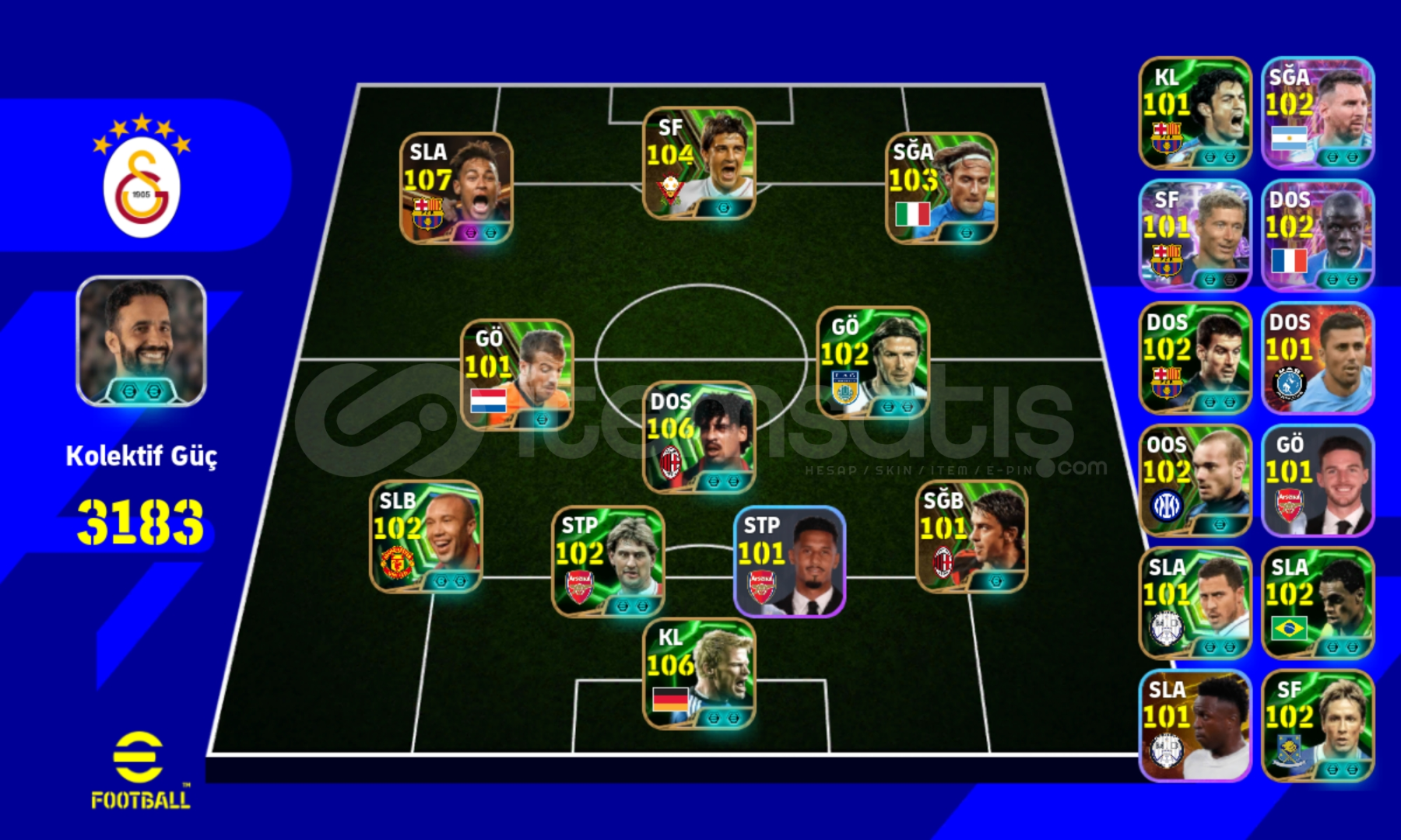 Teknik direktör Amorim107 Neymar107 Rijkaard106 Oliver Khan103 Totti104 David VillaHesap resimlerde görüldüğü gibidir.-MC yoktur.Tek bağdır.Siz satın aldığınızda mesaj gelir hemen girip teslim ederim. Mailinize aktarılır.
