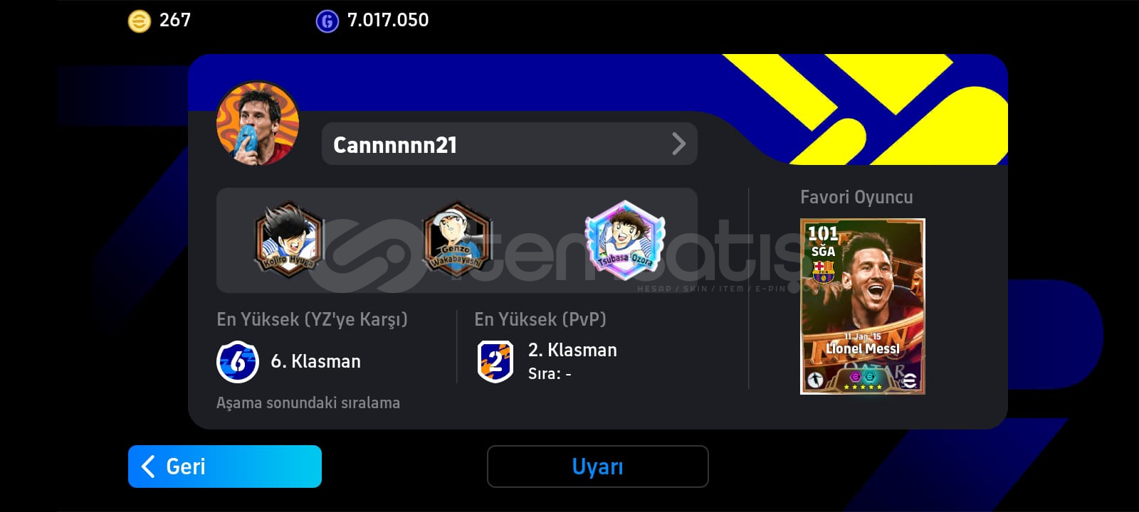 hesap 3166 Kollektif güce sahiptir108 bombacı messimessinin şutarı buglıdır . her vurduğu gider klasman kasmak veya arkadaşlarınızla oynamak istiyorsanız kesinlikle tavsiye ederimkartları gördüğünüz üzere 2 bin TL den fazla para yatırdım hesaba zararına satıyorum102 sniejder102 drogba102 rijkard gibi birsürü efsanevi kart mevcuttur250 mc7 milyon gptek bağ2. klasmanilgilene...