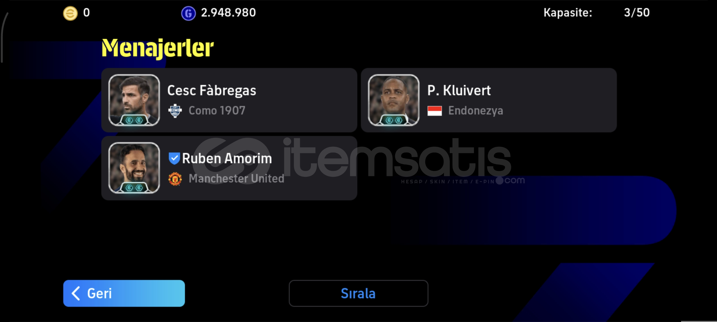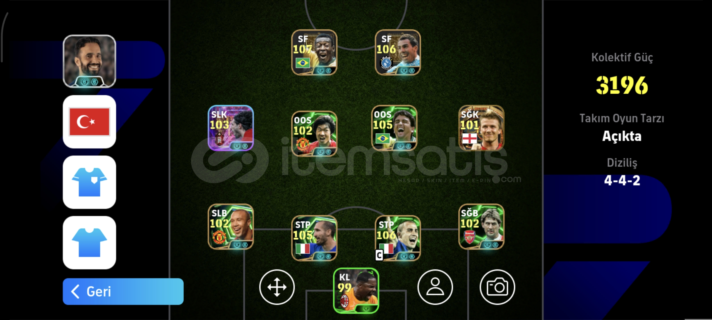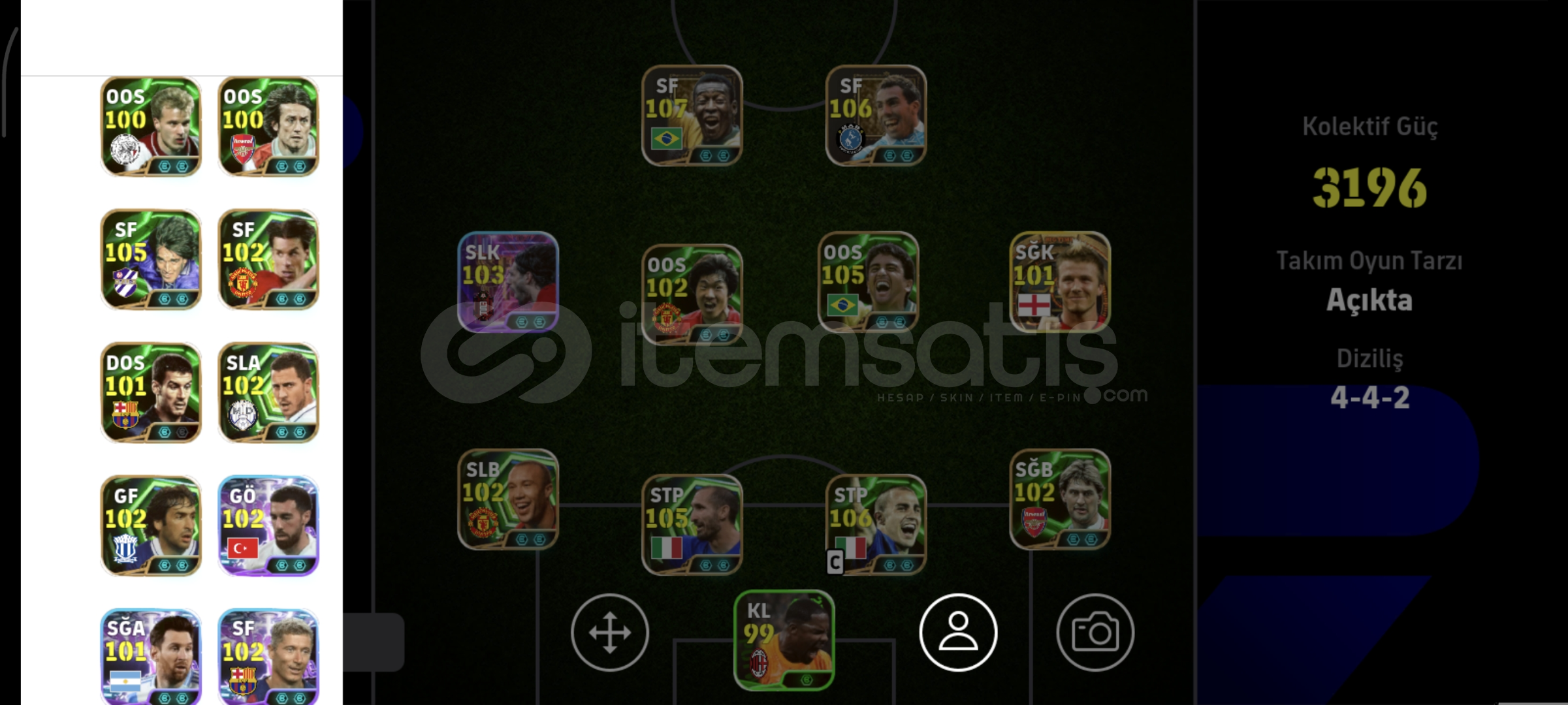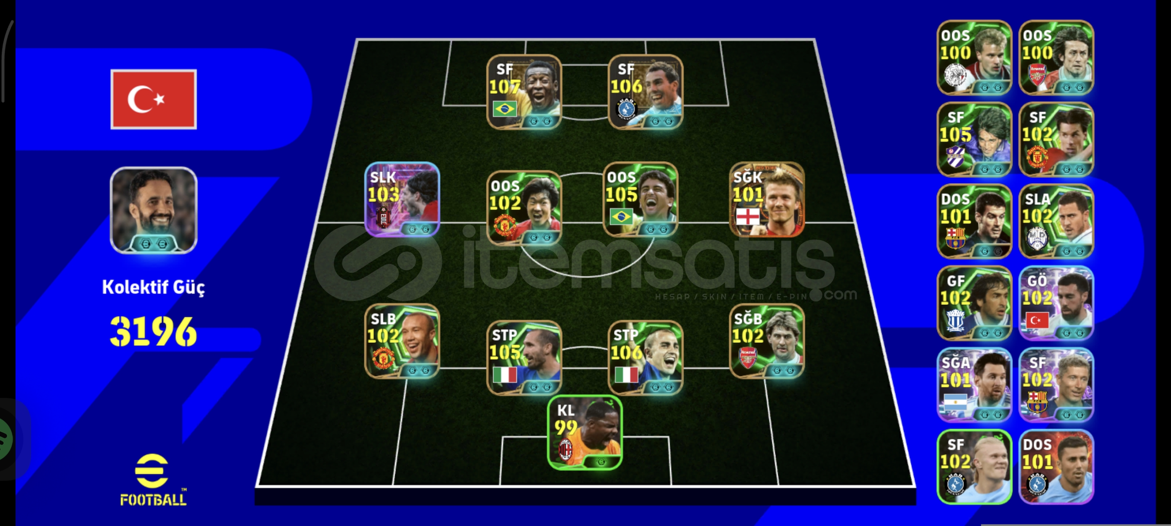 hesapta fotoğraflarda görüldüğü gibi;OYUNUN EN İYİ 2. FORVETİ 108 PELE (özel kart)FÜZE ŞUT 106 CARLOS TEVEZ (özel kart)OYUNUN EN İYİ BOMBACILARINDAN OLAN! 103 BOMBACI Dominik Szoboszlai106 Cannavaro105 Giorgio Chiellini105 Bebeto105 Batistuta102 Nistelrooij102 Orkun Kökçü102 Park Ji-Sung102 Lewandowski102 Edin Hazard102 Tony Adams101 David Beckham (ender kart & Big time)gibi toplamda 50 elit oyuncu v...
