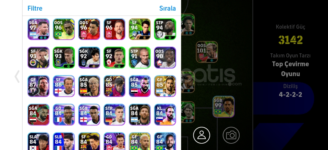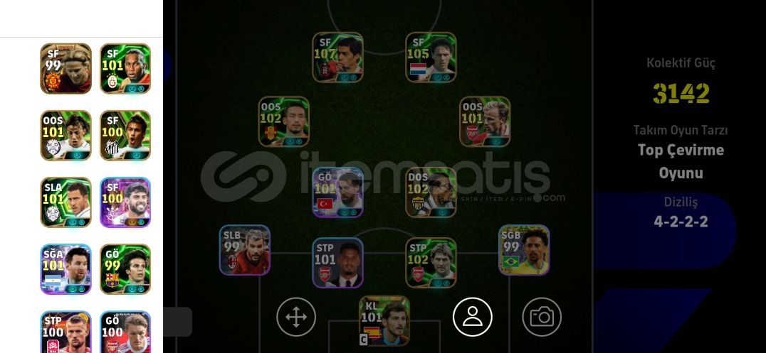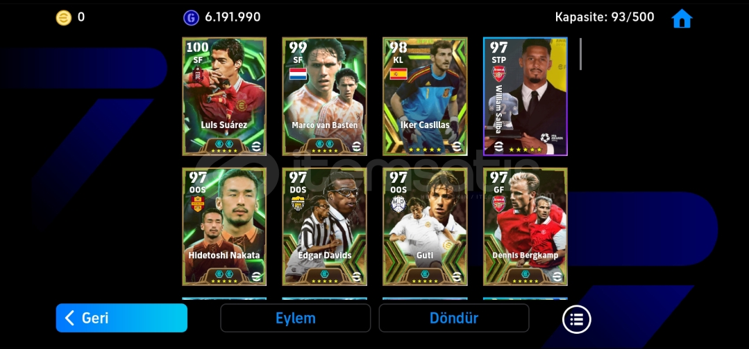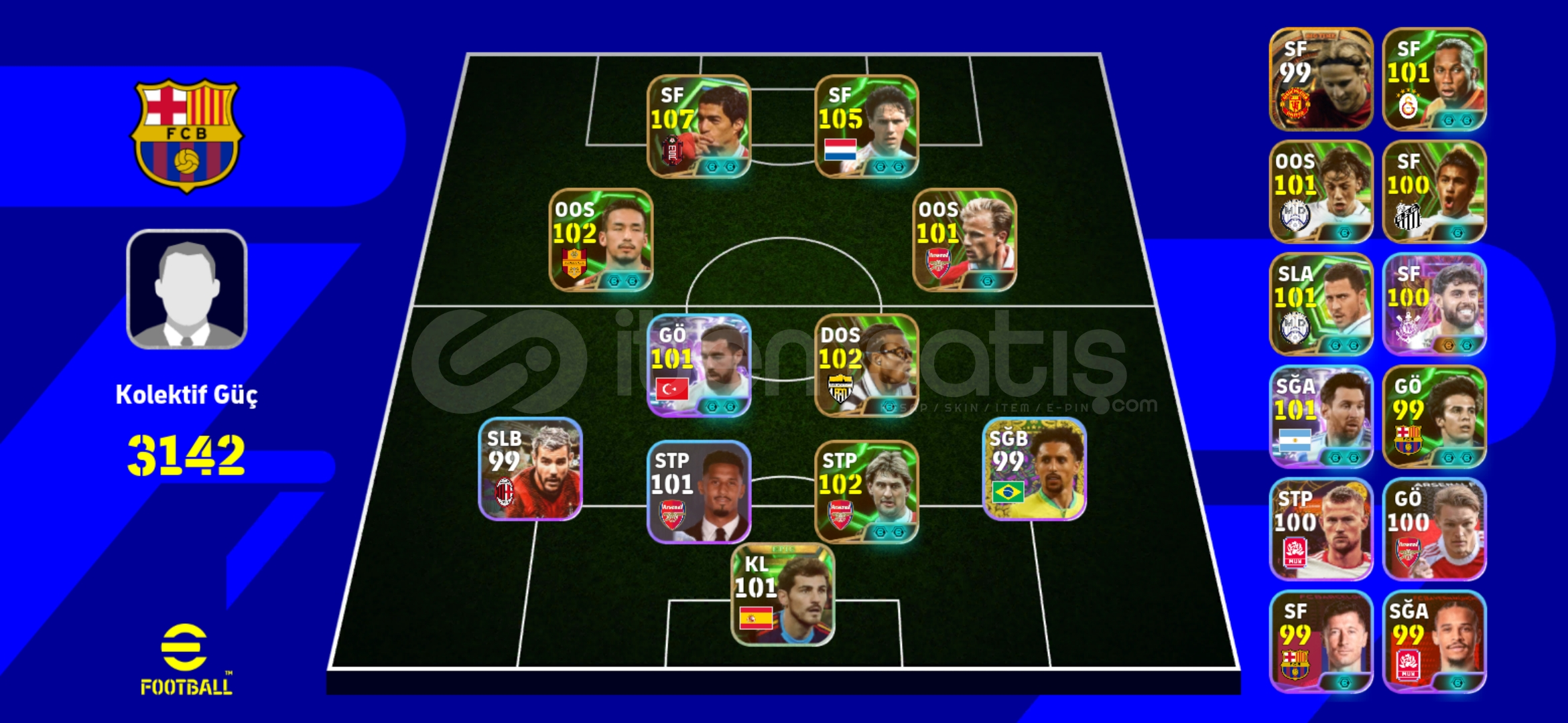 Hesap tek bağdır -mc yoktur Hesaptaki Bazı Değerli Kartlar:108 Suarez 105 Van Basten 103 Edgar Davids 103 Nakata 102 Bergkamp 102 Orkun Kökçü 102 Casillas 102 Guti 102 Drogba 102 Hazard 102 Tony Adams 101 Neymar Jr 100 Forlan (Bigtime)Hesap Sağlam Menajer İle 3160+ KG Görüyor