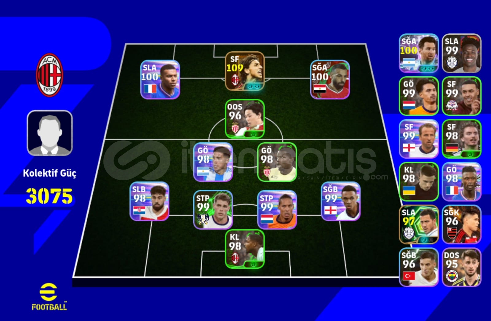 • Kilit Oyuncu: 109 Reytingli Efsane Zlatan Ibrahimovic.• Kolektif Güç: 3075.• Öne Çıkan Diğer Yıldızlar: 100 Messi, 100 Mbappe, 100 Salah.• Defans Hattı: 99 Van Dijk, 99 Alexander-Arnold, 99 Gvardiol.• Kaynak: Yaklaşık 400.000 GP mevcut.• Bağlantı: KONAMI ID bağlıdır, güvenle devredilecektir.• Forvette Zlatan farkını yaşamak isteyenler için kaç...