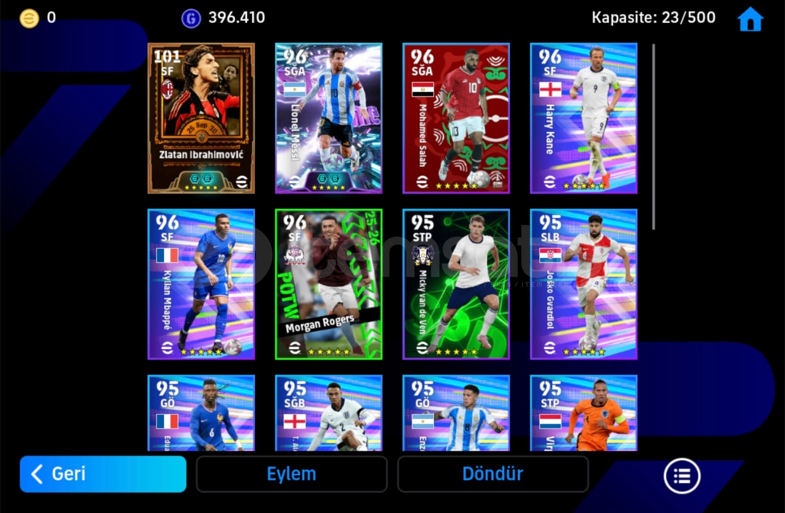 Öne Çıkan Diğer Yıldızlar: 100 Messi, 100 Mbappe, 100 Salah.