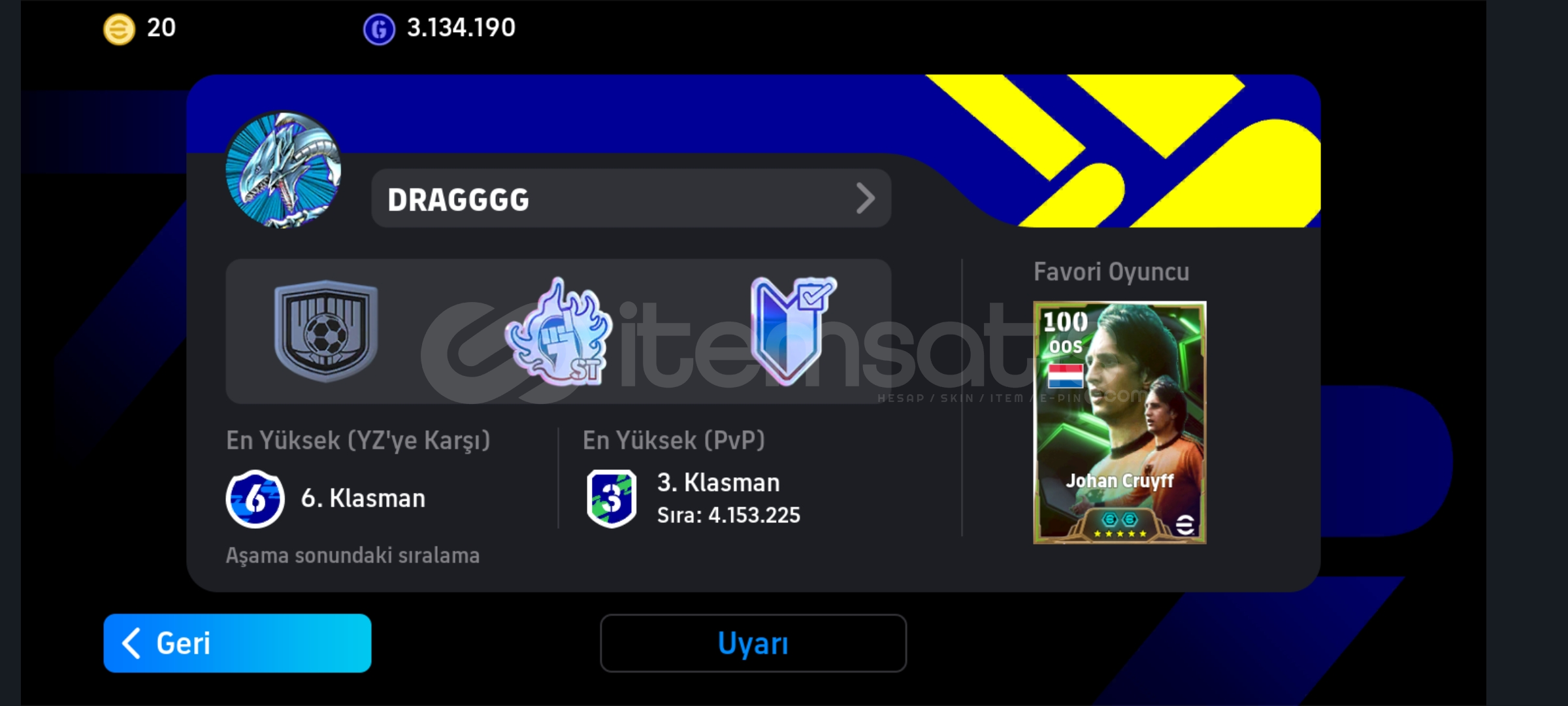 Hesapta110 İbrahim ovic106 pusskas106 johan CruyffGibi Süper bitirici kartlar vardırHesapta ki diğer oyunculara görsellerden ulaşabilirsinizHesap tek bağdırOtomatik teslimat bir şeklde yapılır alındıktan hemen sonra kod söylenirMerak ettiğiniz soruları Dm üzerinden sorabilirsin