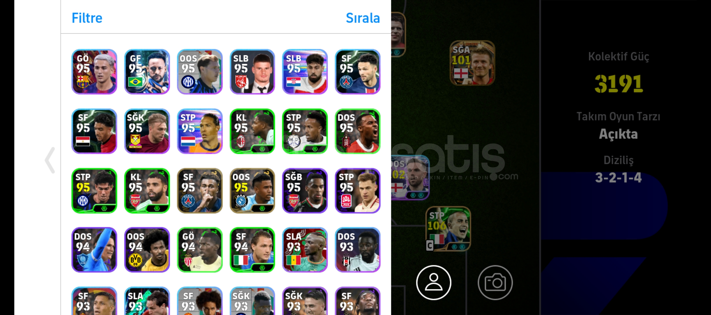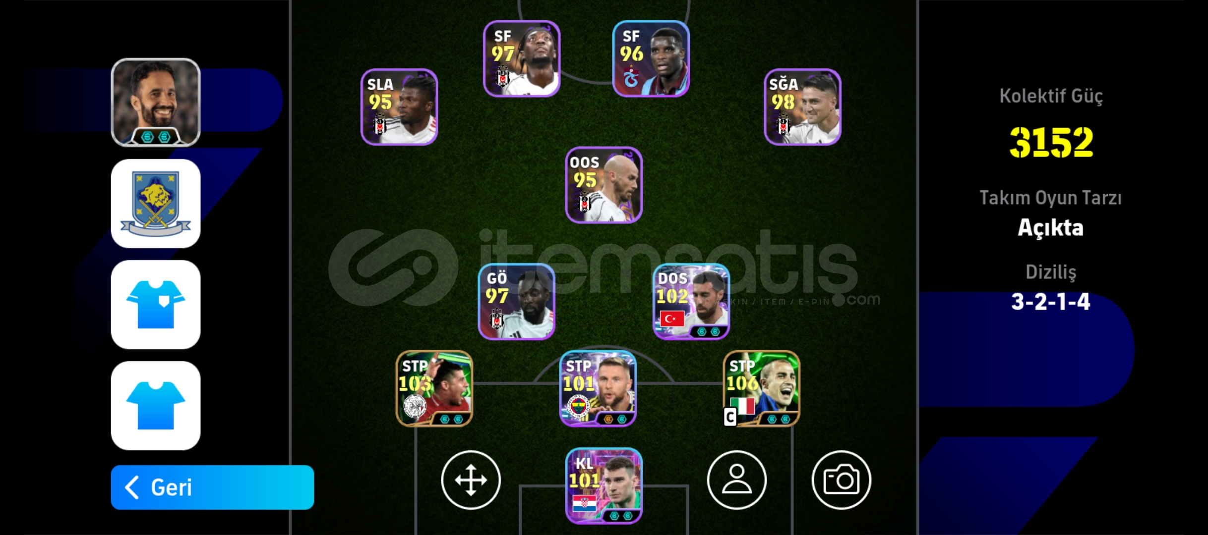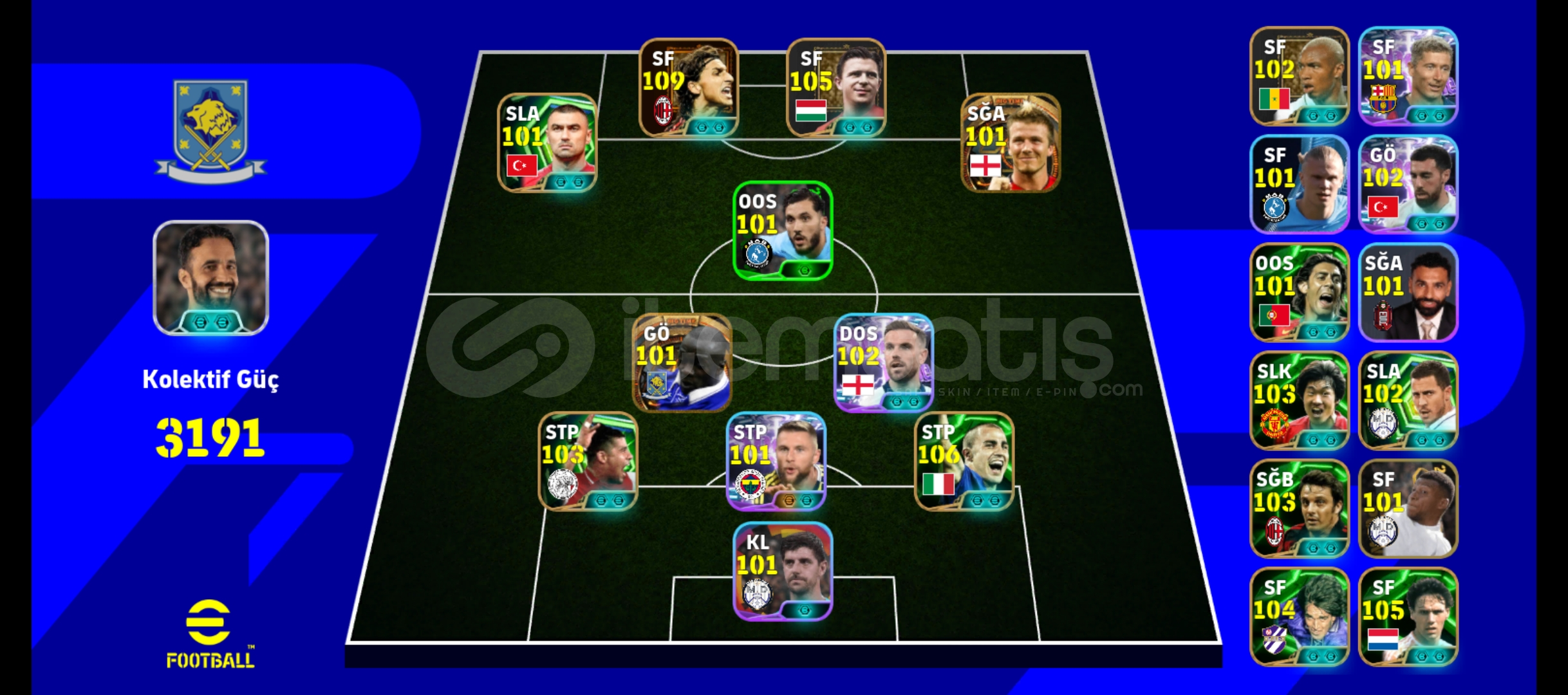 Hesapta110 Zlatan105 puskasBig time Carlos, Beckham , makalele105 Van bastenVe bunlar gibi birçok oyuncunun bulduğu bol rezervli bı hesaptır3 tane güçlendiricili TD vardırHer türlü dizilişe ve taktiğe uygun bir hesaptırAlan pişman olmazŞimdiden hayırlı olsun