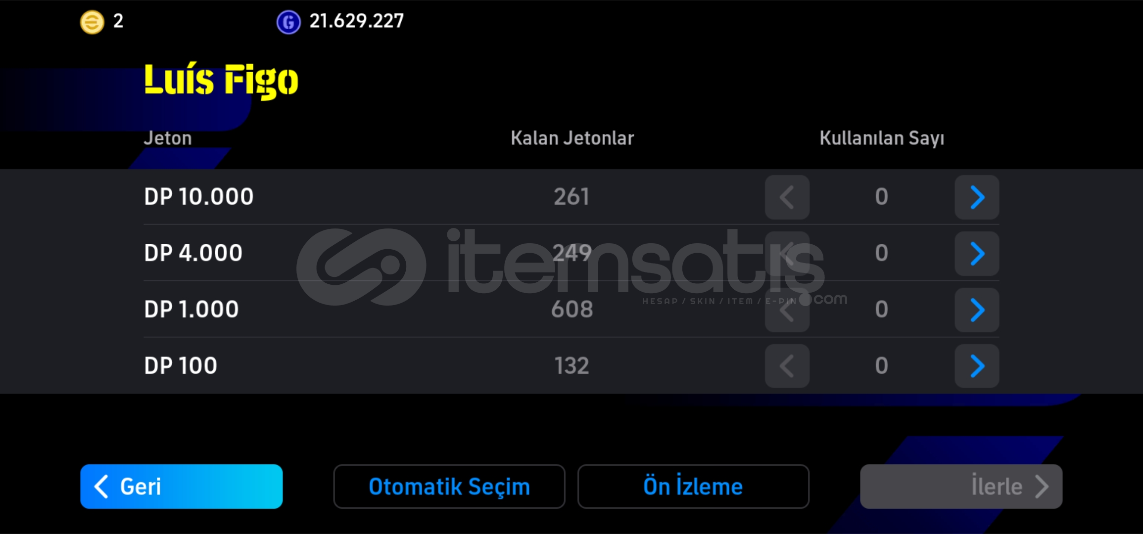 Hesap 5 senedir benim elimde geziyor satmak istemezdim fakat paraya nakit ihtiyaç malum ekonomi yeteri kadar dp ve gp bulunmakta orta kafa gol veya kanatlardan oyun için çok iyi durumda bazı oyuncular özel basım yapılmıştır tahminen 3230 üstüne çıkıyordurHESAP ŞANS ORANI ÇOK YÜKSEKTİR