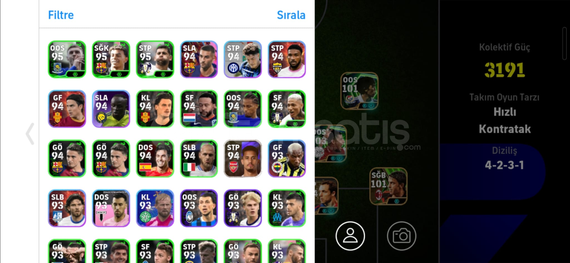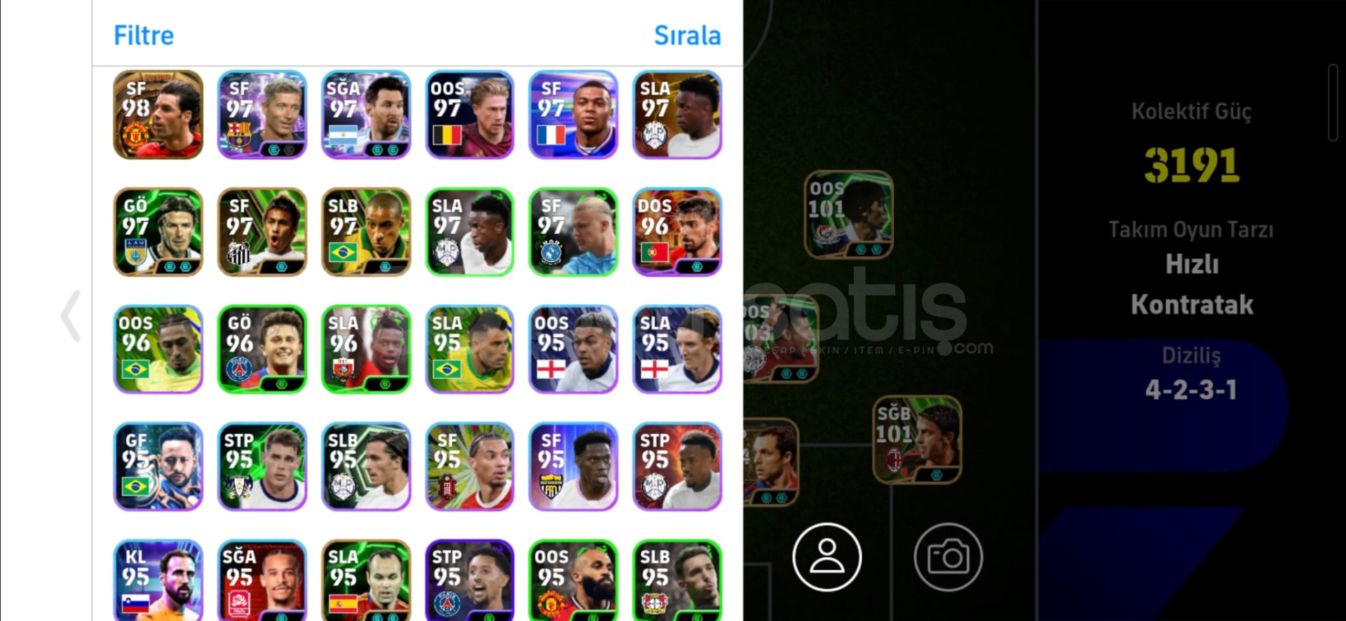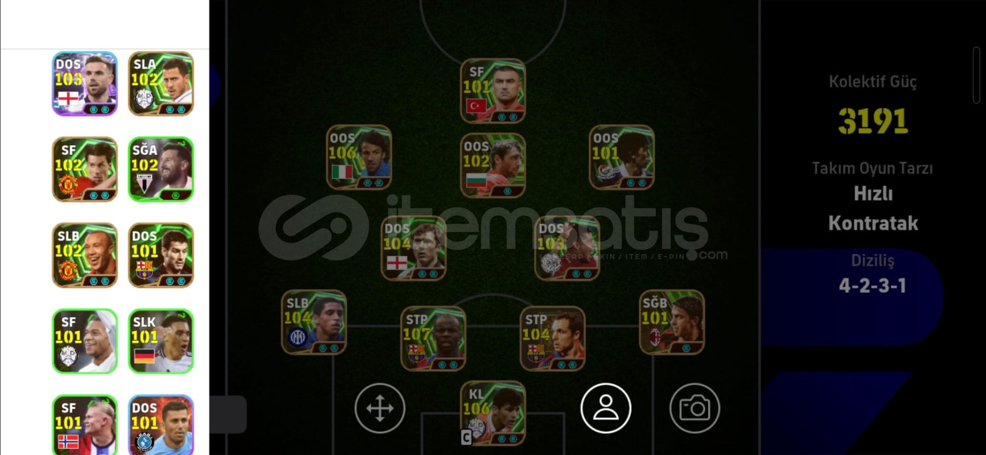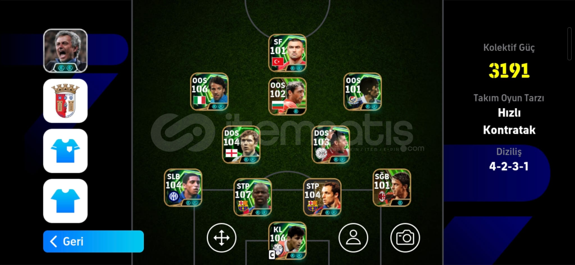 MAX KG 3195108 THURAM107 BOMBACI DEL PİERO101 BOMBACI NAKAMURA104 YER FÜZESİ CARLOS106 CASİLLAS104 YENİ GELEN SERGİ BARJUAN101 BOMBACI BURAK YILMAZHESABIN REZERVİ BOLDUR. 10 MİLYON GP VARDIR.DEFANS VE İLERİ HATTI SAĞLAMDIR.ANDROİD/İOS TEK BAĞDIR.CUZİ MİKTARDA İNDİRİM OLUR.