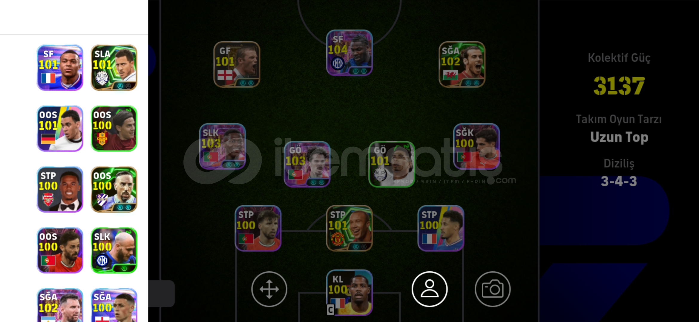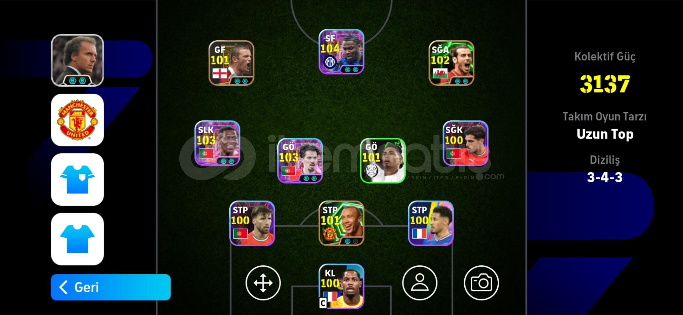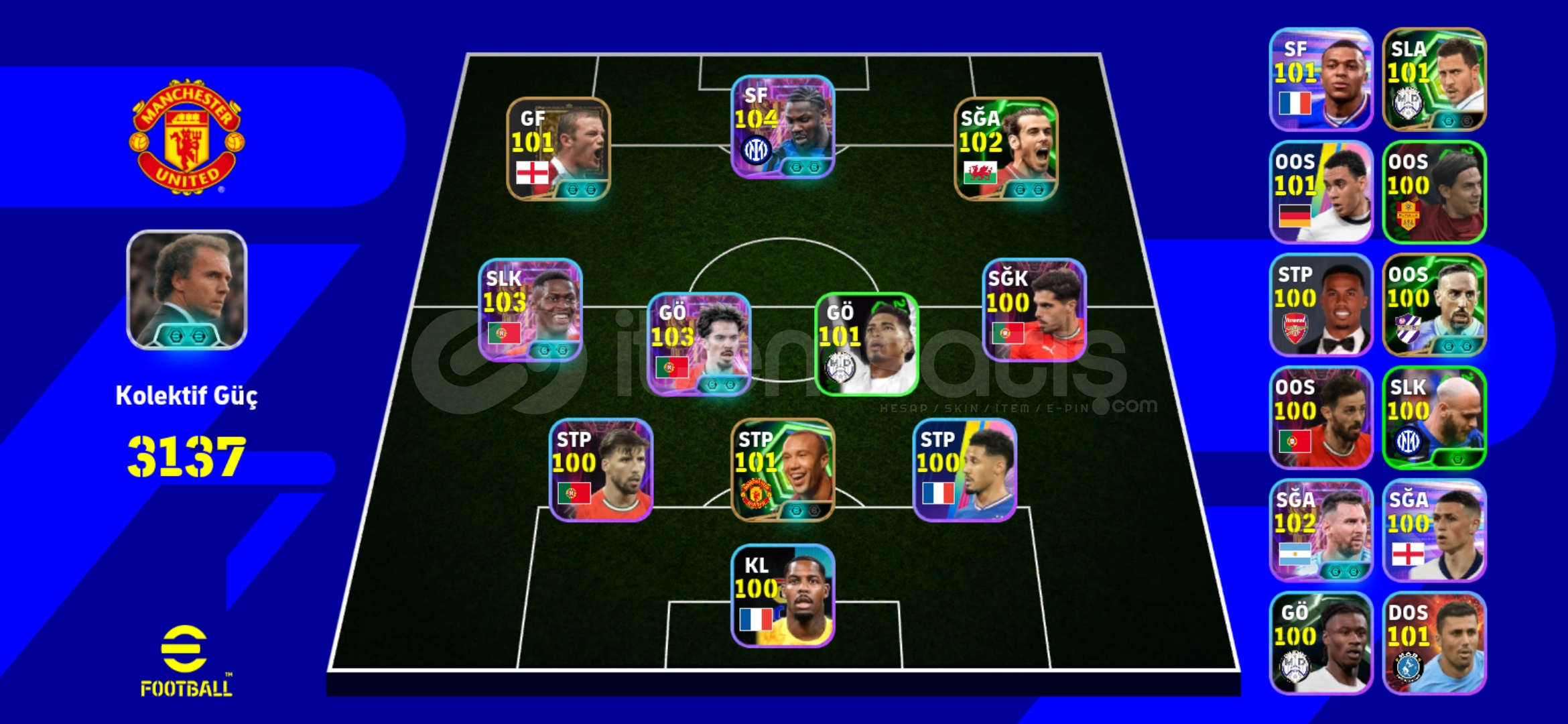 Hesap tek bağdır -mc yoktur Hesaptaki bazı değerli kartlar:105 Thuram104 Vitinha103 Nuno Mendes 102 Bale (Bombacı)102 Silvestre 102 Rooney102 Messi102 Hazard101 Rodri101 Musiala101 Bellingham
