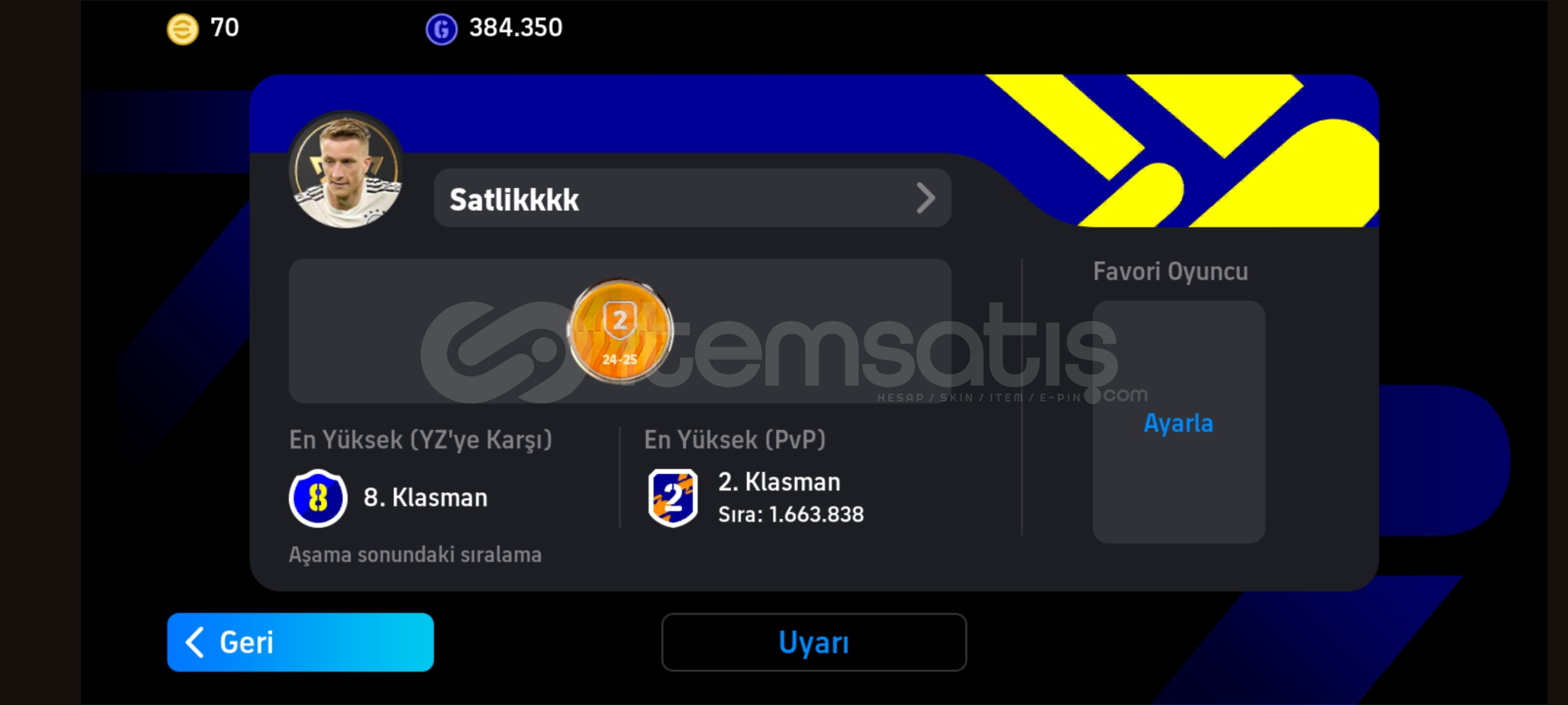 Merhaba İyi Günler Hesap 3159 Kg 106 Kahn 107 Ronaldo vardır 2.klasmana kadar çıkmış bir hesaptır hesapta maalesef 2 tane bağ var ama hiçbir sorunla karşılasmazsiniz emin olabilirsiniz pazarlik payı vardır İyi Günler