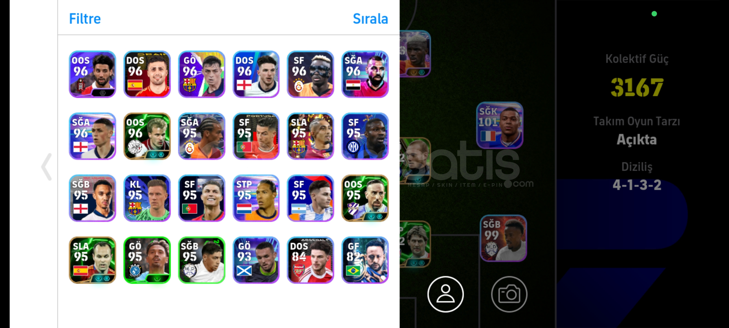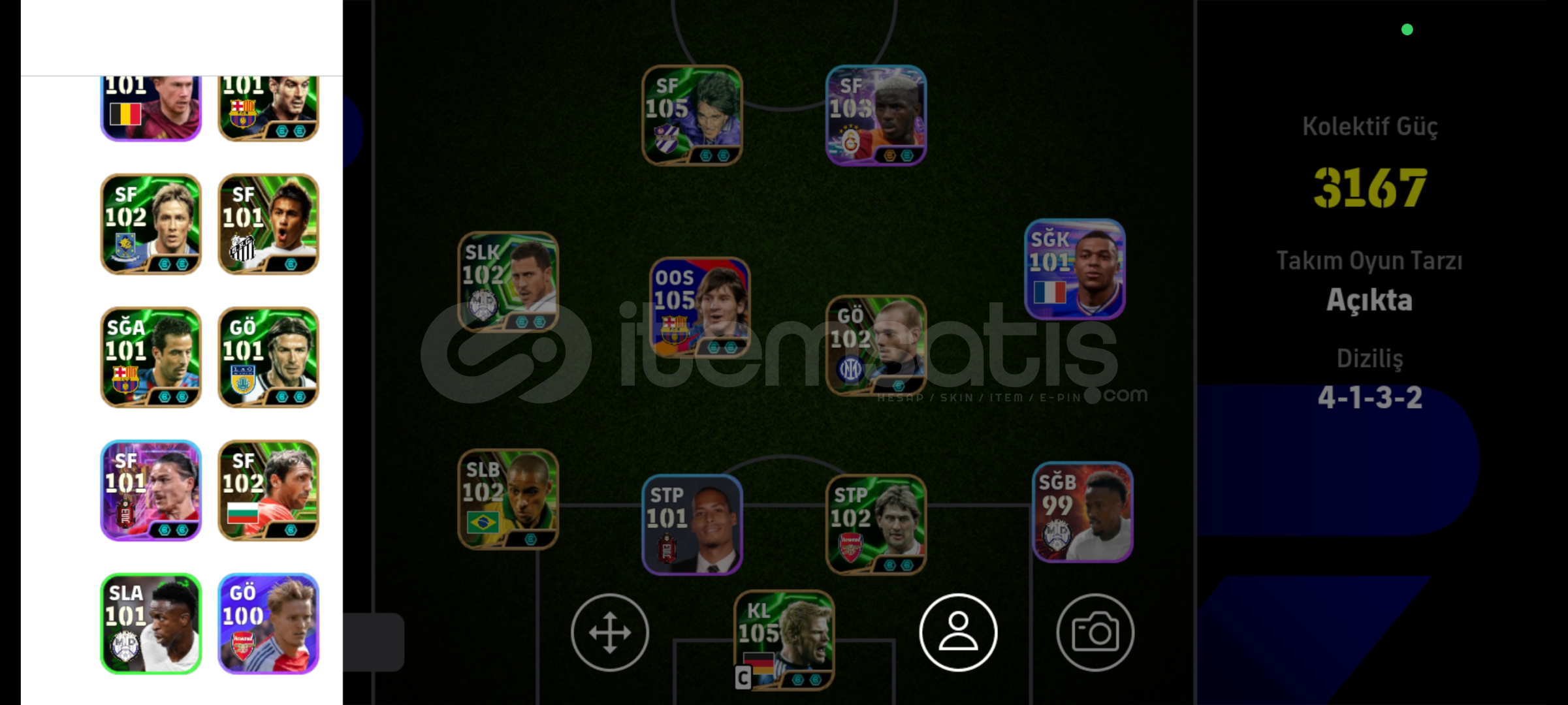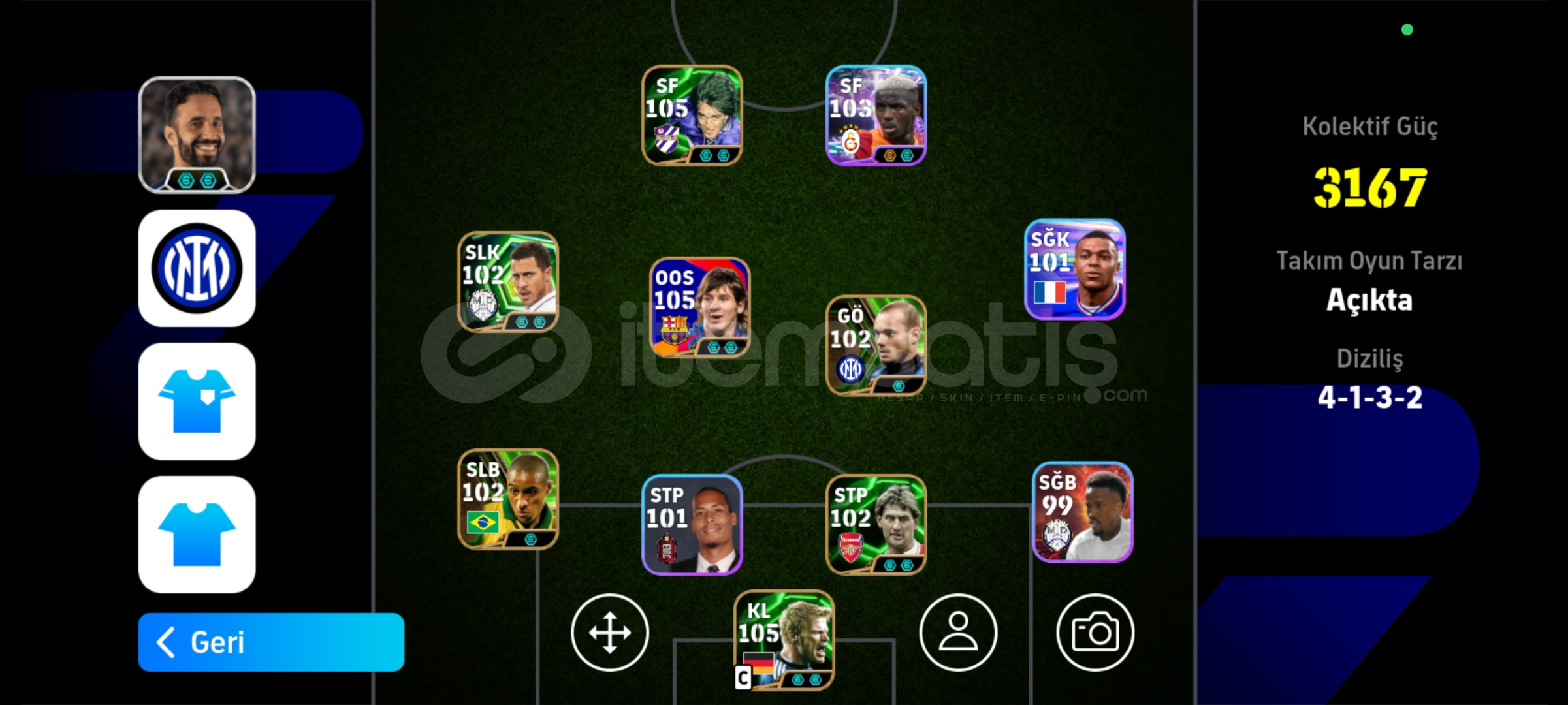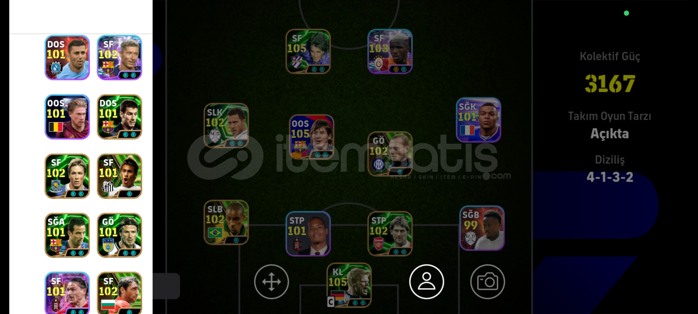 Oyuncular :103 Oshimen Robert Baggio - 105Marcus Thuram - 104Oliver Kahn - 105Ronaldinho - 103 ve birçok değerli oyuncu bulunmaktadır.hesap tek bağdır. Ben aktif olamadığım zamanda satın alabilirsiniz anında dönüş sağlarım.
