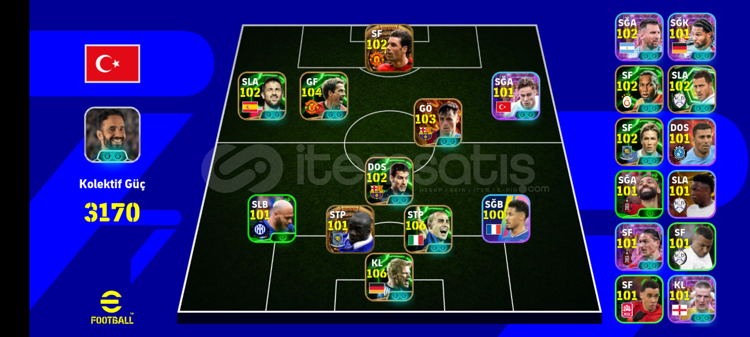 Hesap hakkında:102 van Nistelrooy Big time106 Oliver Kahn105 Baressi103 Pedri Big time102 David Villa104 Michael Owen101 Kenan Yıldız ve daha fazlasıHesapta menejer olarak Xabi alonso gibi çok iyi bir menejer vardir.3.Klasman Rozeti vardır3170 KG kaçmazPazarlık yoktur sadece almayı düşünen ve ciddi alıcılar ve hesap hakkında daha