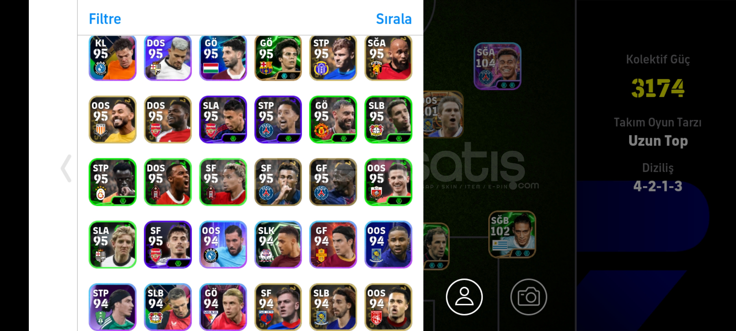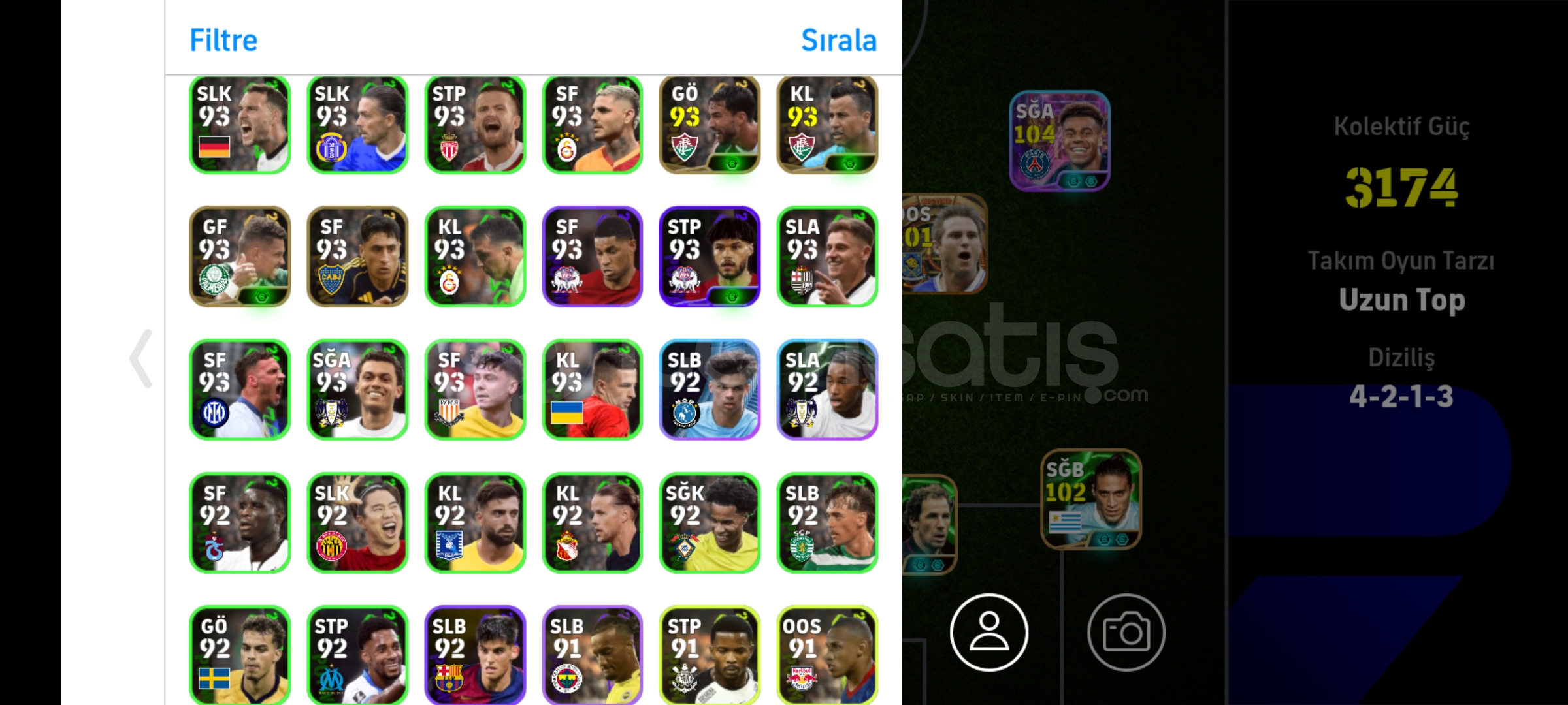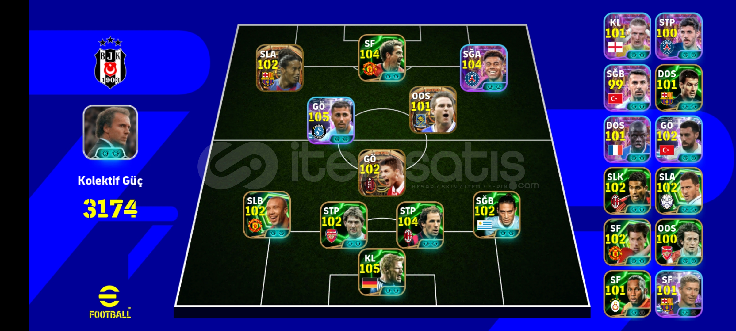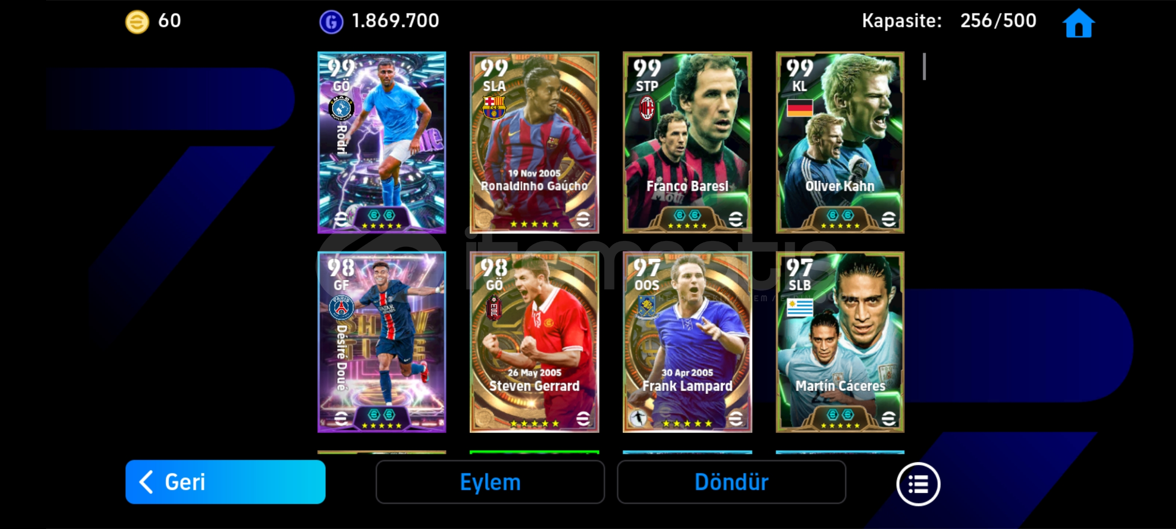 105 Rodri105 Oliver Kahn 104 Desire Doue104 Michael Owen102 Eden Hazard104 Baresi101 Lampard102 Gerrard102 Ronaldinho102 Orkun Kökçü Ve daha fazlası mevcut 89 Beckenbauer89 Ruben AmorimKonami ID ye tek bağ hesab Kadro dışı bir sürü renkli kart mevcut Herşey resimlerde var