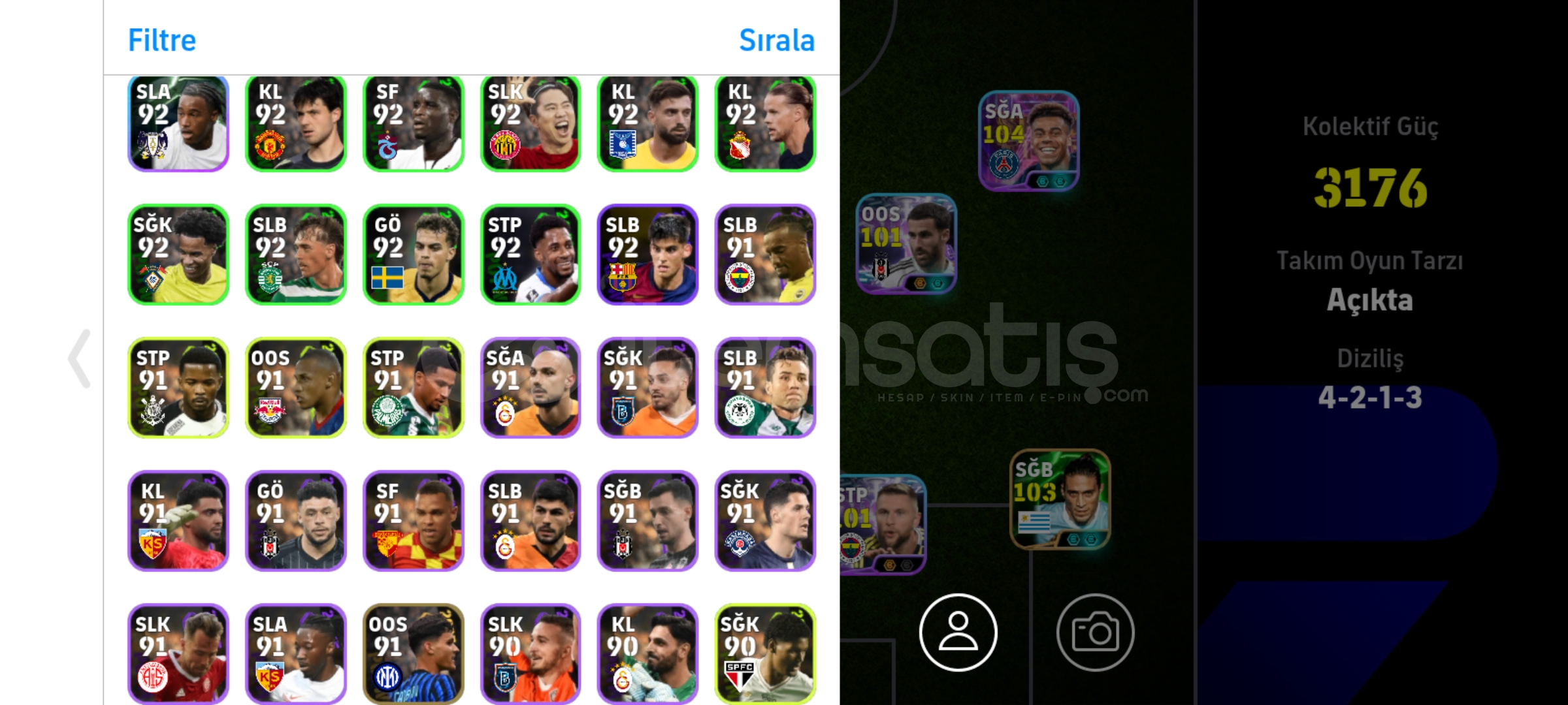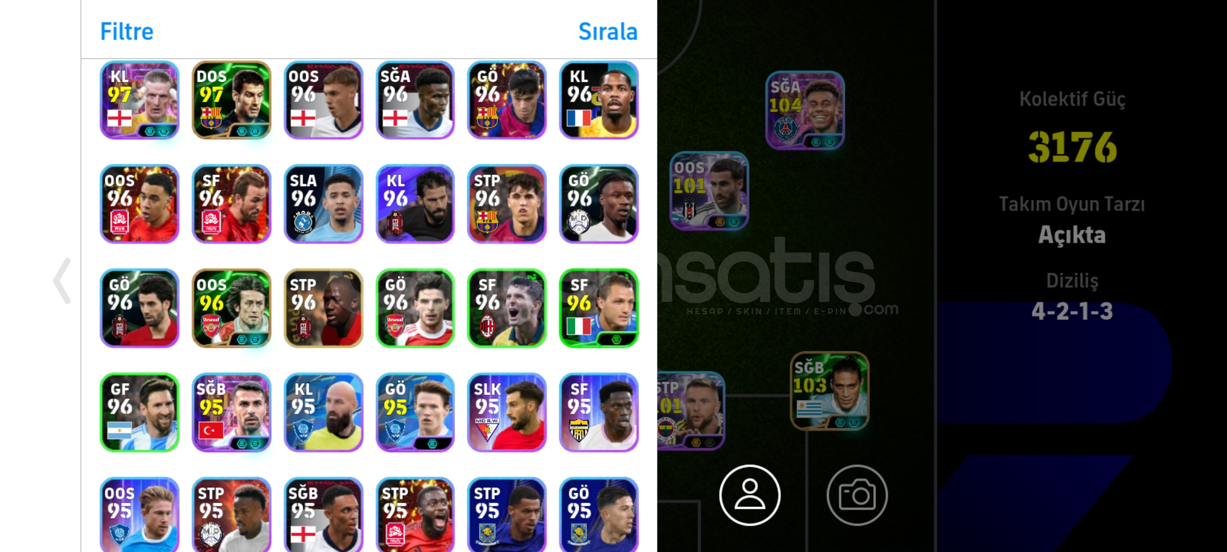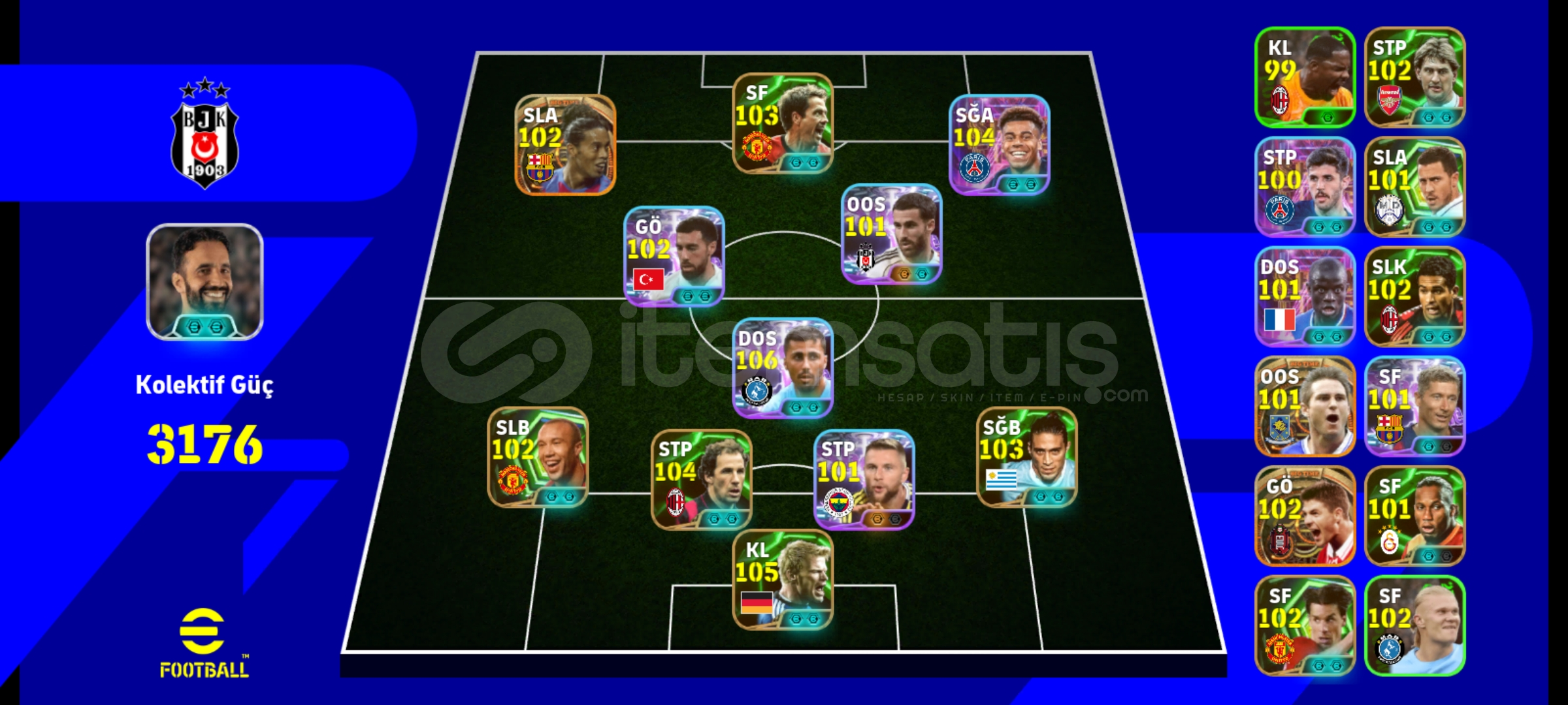 105 Rodri105 Oliver Kahn104 Desire Doue104 Michael Owen102 Eden Hazard104 Baresi101 Lampard102 Gerrard102 Ronaldinho102 Orkun KökçüVe daha fazlası mevcut89 Beckenbauer89 Ruben AmorimKonami ID ye tek bağ hesabKadro dışı bir sürü renkli kart mevcutHerşey resimlerde var