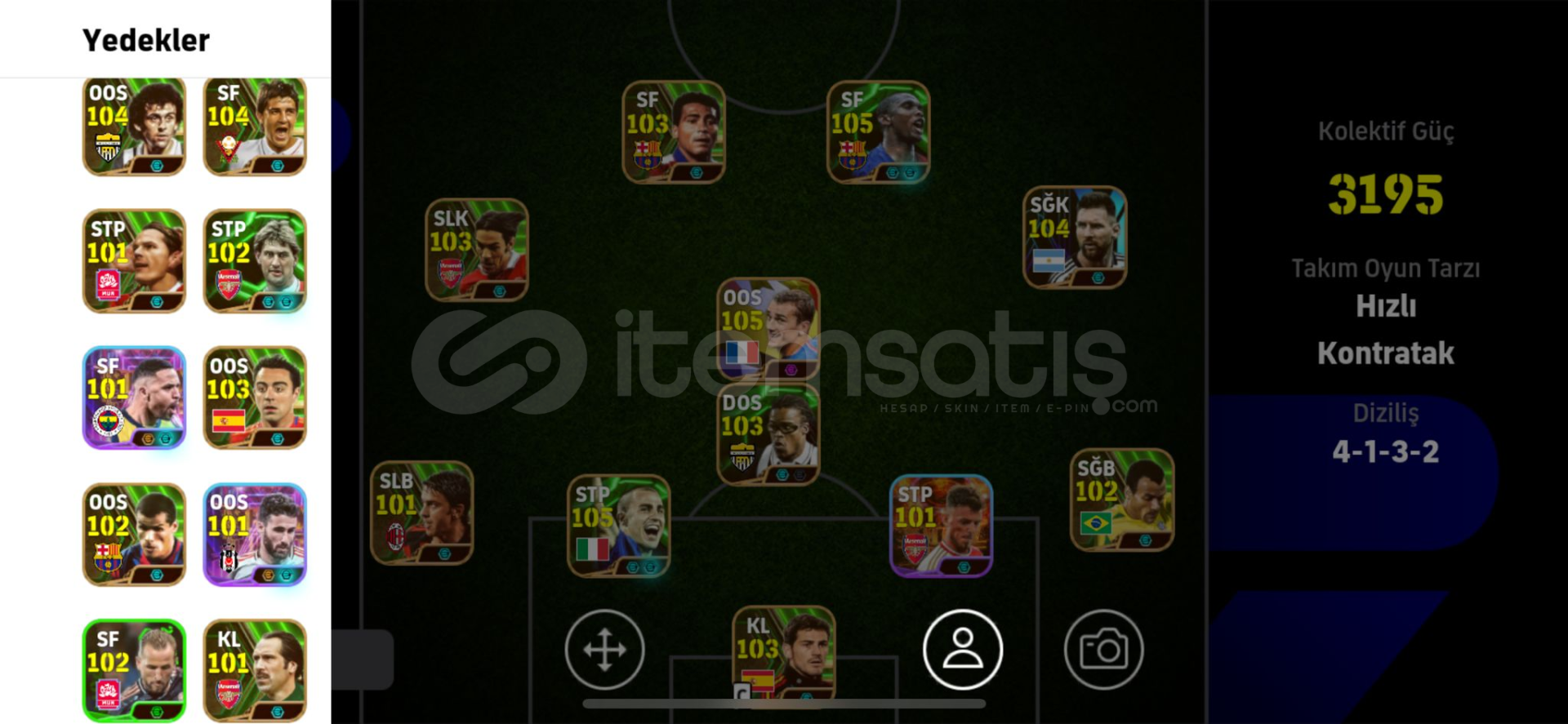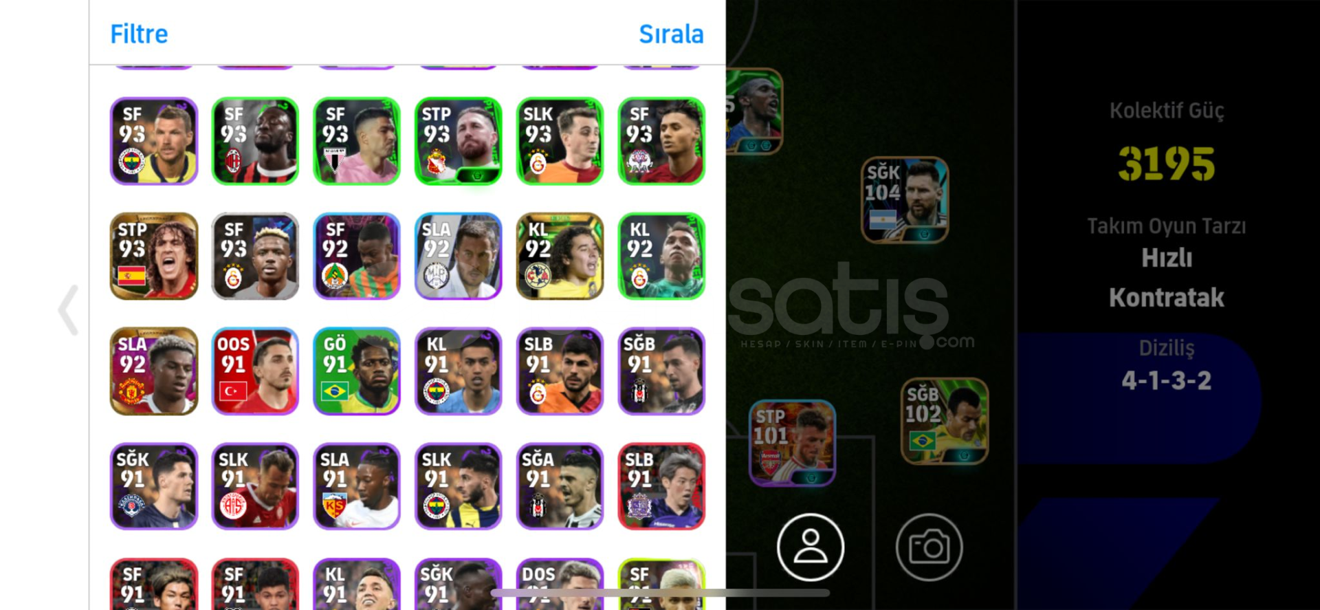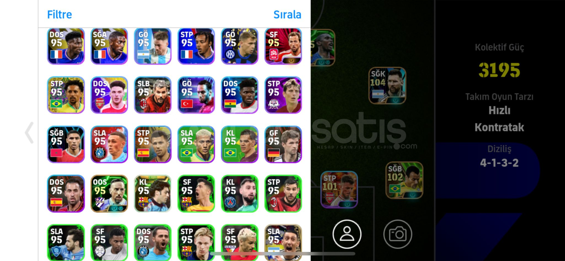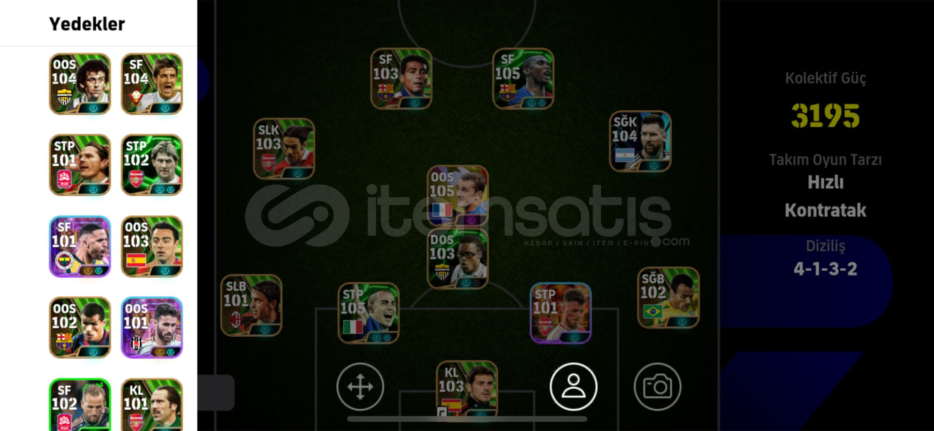 3195 kolektif güçlü pes hesabı,hesap eski olduğu içim eskiden kalma birçok epic ve efsane vardır.Fazlaca epic ve 102-103 üstü kart bulunur.105 eto, 103 casillas ,104 platini,103 romario,bombacılı rafa silva 101,bullet header en nesyri,105 cannavaro,102 cafu,103 edgar davids hesap doludur.HESAP ÇİFT BAĞDIR ANCAK GAME CENTER HESABIM SİLİNMİŞTİR