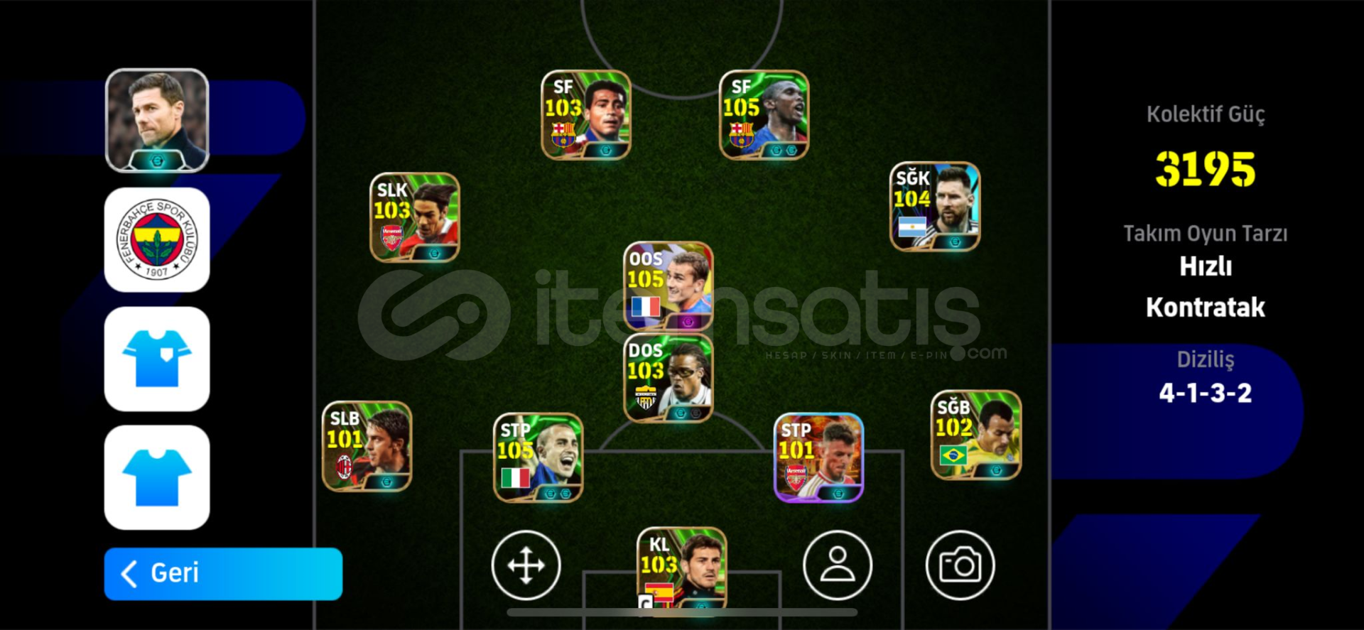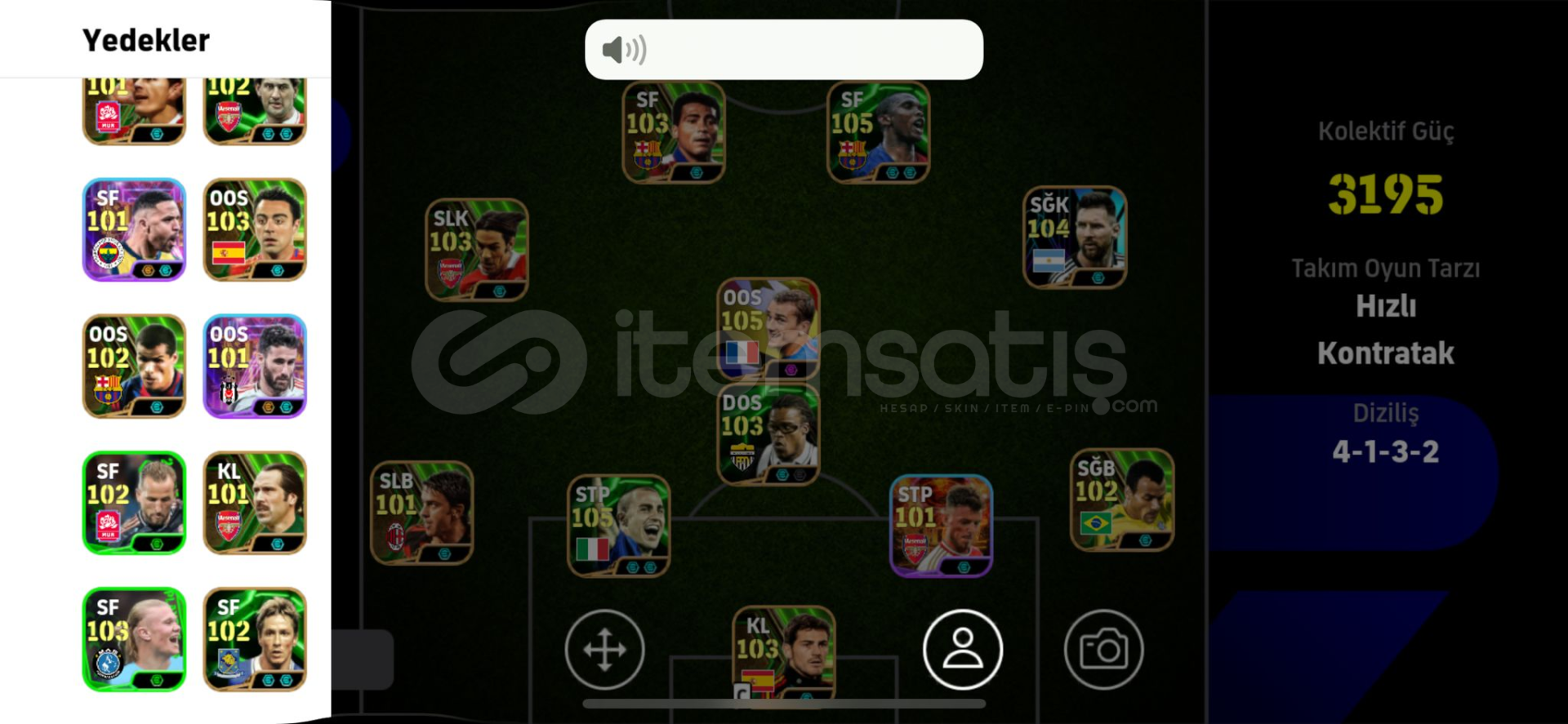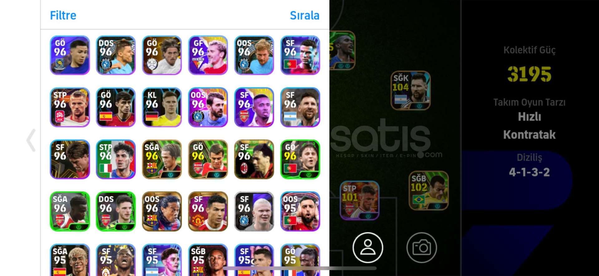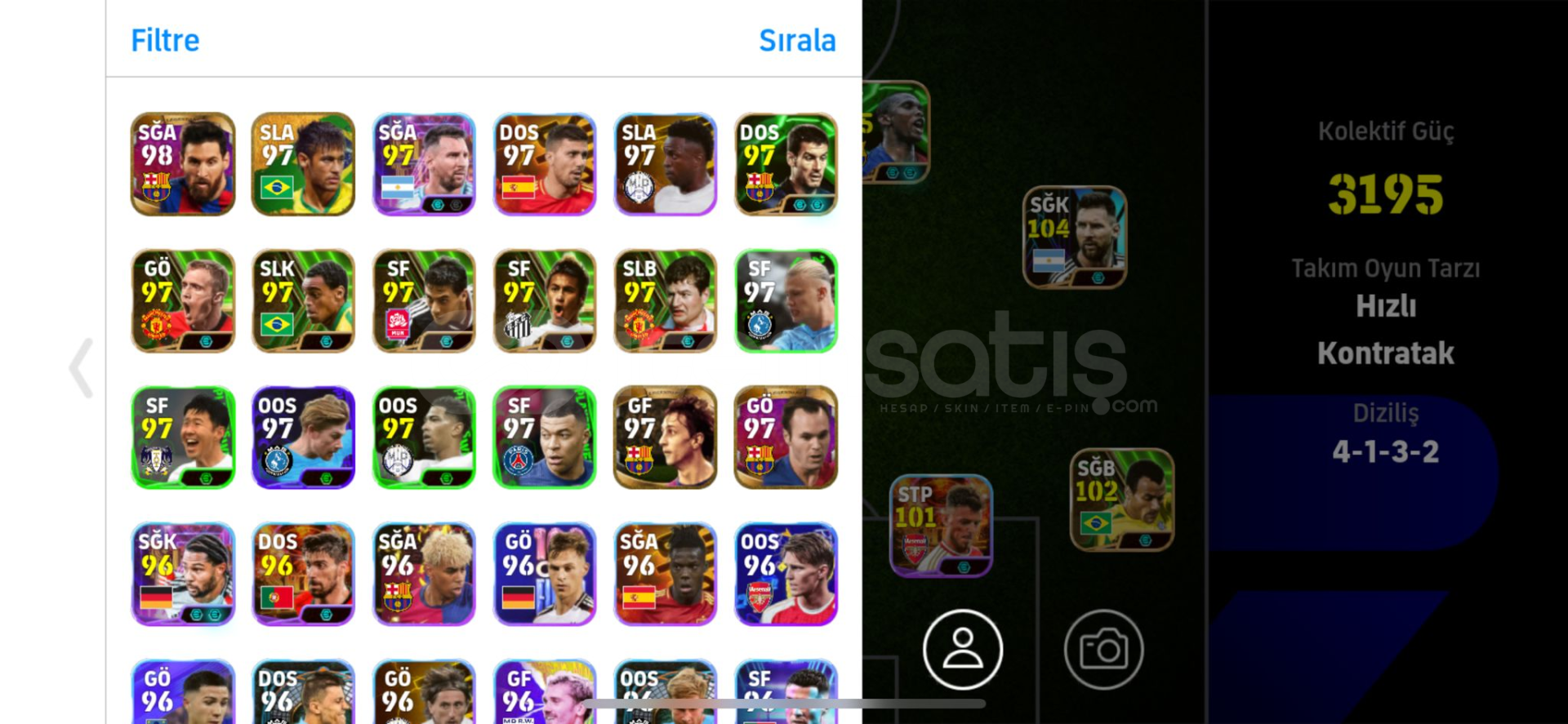 3195 kolektif güçlü pes hesabı,hesap eski olduğu içim eskiden kalma birçok epic ve efsane vardır.Fazlaca epic ve 102-103 üstü kart bulunur.105 eto, 103 casillas ,104 platini,103 romario,bombacılı rafa silva 101,bullet header en nesyri,105 cannavaro,102 cafu,103 edgar davids hesap doludur.HESAP ÇİFT BAĞDIR ANCAK GAME CENTER HESABIM SİLİNMİŞTİR