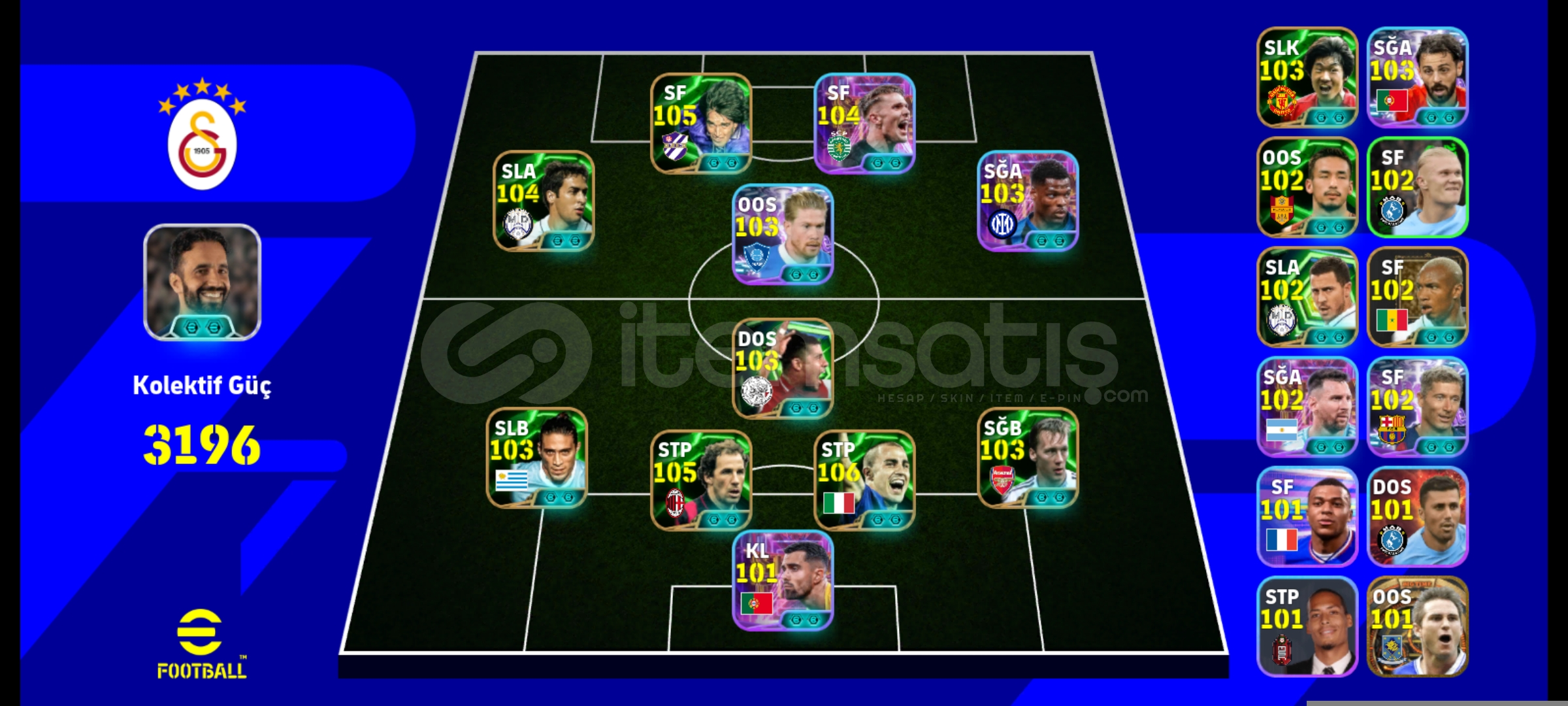 3196KG HESABİMİZ 105LER DOLU REZERVİ İYİDİR 3MENAJERLİDİR.106CANNAVARO 105BATİSTUTA 105BARESİ 104GYOKERES 104RAUL 103DUMFRİES 103CACERES 103DE BRUYNE 103DİXONÇİFT GÜÇLENDİRİCİ AMORİM FABRE GATTUTEK BAĞDIR EPOSTANIZA DEVREDİLİRALICISINA HAYIRLI OLSUNPAZARLİK OLUR PAZARLİK SÜNNETTİR