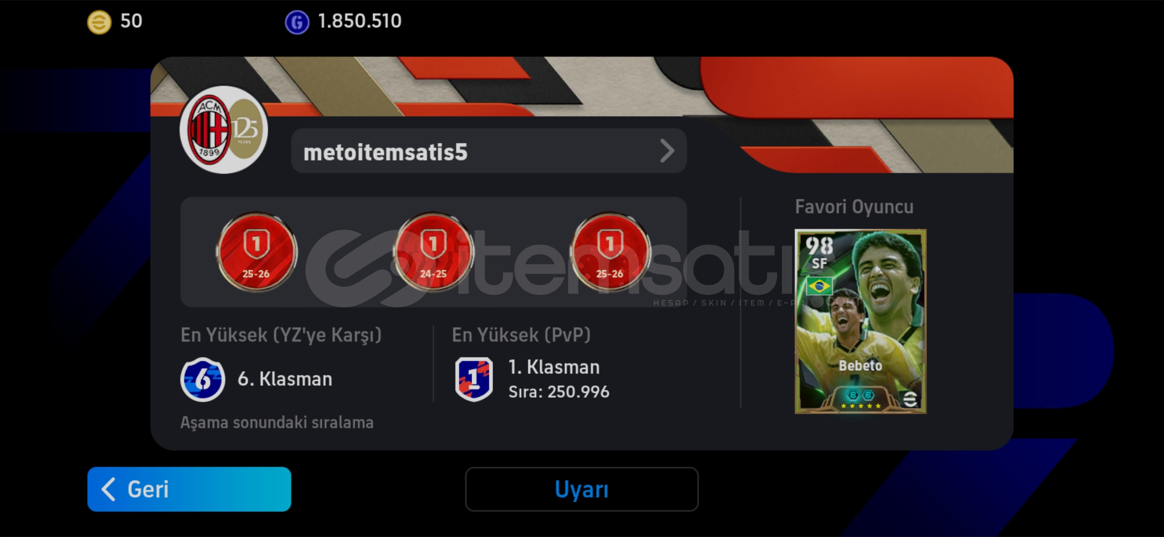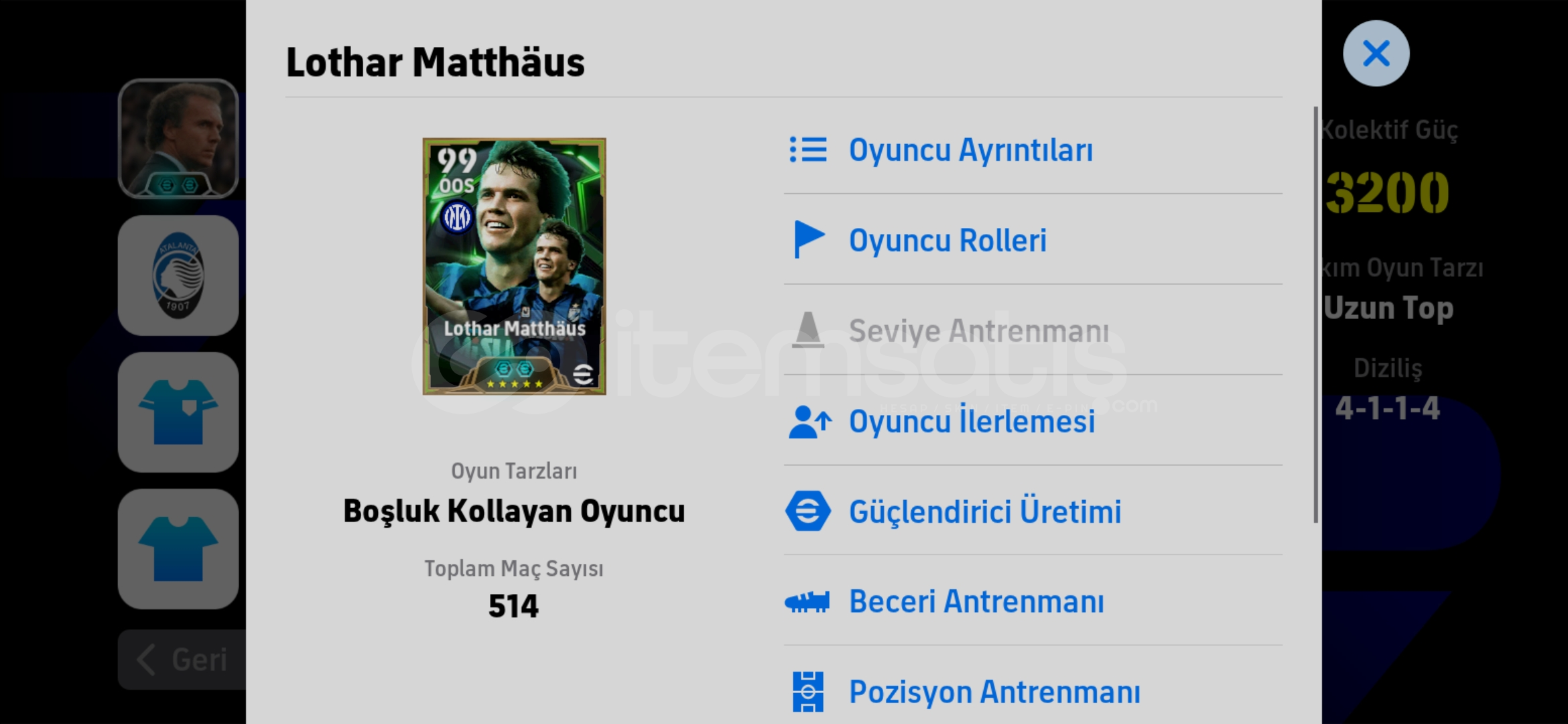 ✨ MetoGrimes Mağazası ✨Yüksek Memnuniyet Garantisi Verdiğimiz MetoGrimes Mağazamıza Hoşgeldiniz! Ürün hakkında detaylı bilgiler aşağıda yer almaktadır!Hesap Özellikleri :105 BEBETO 105 BAGGİO 105 MATTHAUS 106 CANNAVARO 104 VİLLA 103 HUJSEN 103 VAN BUYTEN DOLU HESAPP5 KEZ 1.KLASMAN GÖREN HESAP ! ✨️ÖZEL AVATARLAR MEVCUT ⚡️TEK BAĞ UYGUN BÜTÇEL...
