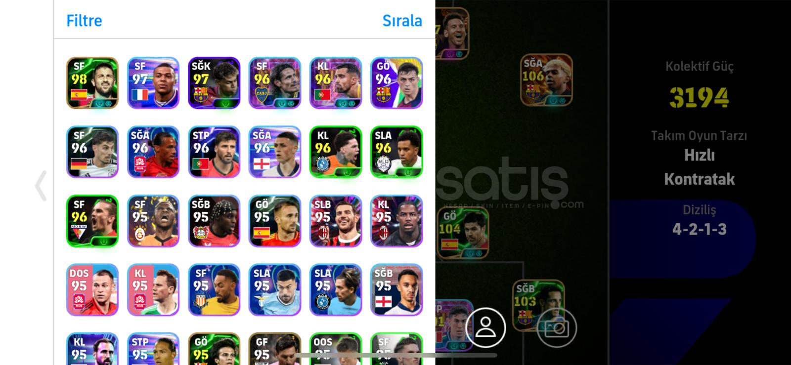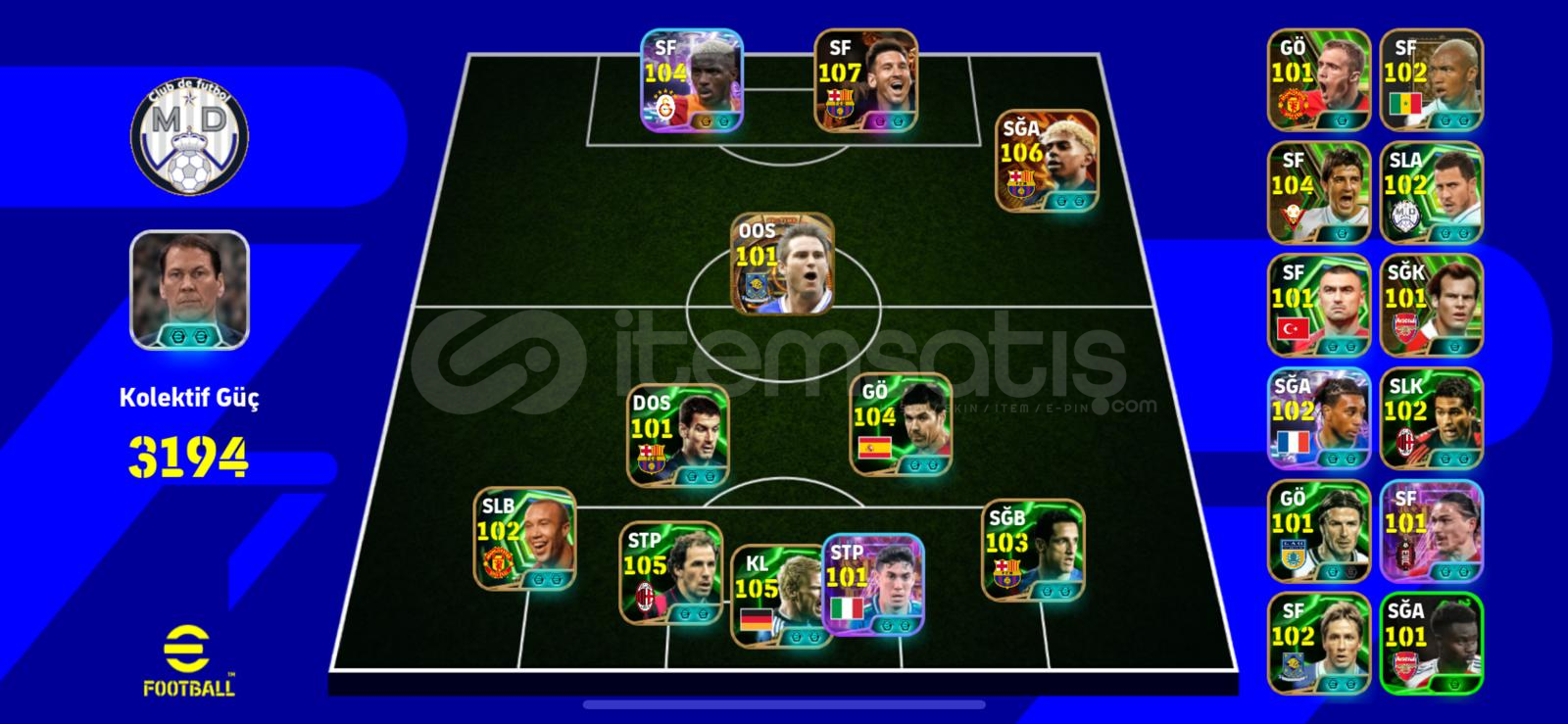 Hesapta 4 adet bombacı bulunmaktadir.hesabta 104 osimhen 105 baressi 104 xabi alonso gibi bircok özel oyuncu vardrHesap tek bagdr .eksi mc yoktr .daha fazla blgi icin dm(Messiye özel basım yapıldigi için 107 dir .)
