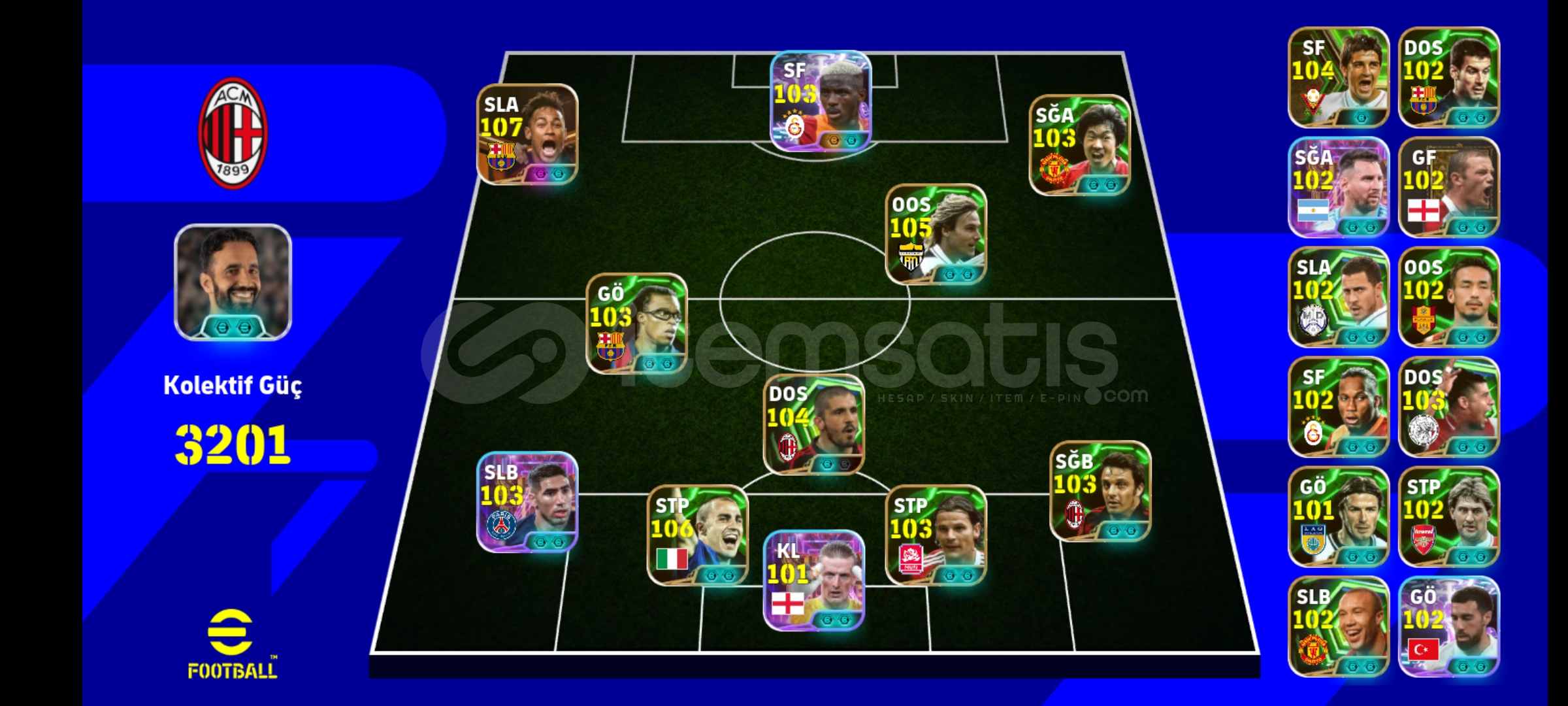 PAZARLIK YAPILIR!TR SERVER HESAP, YENİLMEZ KADRO!3200+ KG, 107 NEYMAR, 105 NEDVED, LİG TAKIMLARINDA 107 KAFACI OSİMHEN, 105 GATTUSO + PİKE YAPAN MÜKEMMEL ORTACILAR,2 TANE 2 GÜÇLENDİRİCİLİ TEKNİK DİREKTÖR